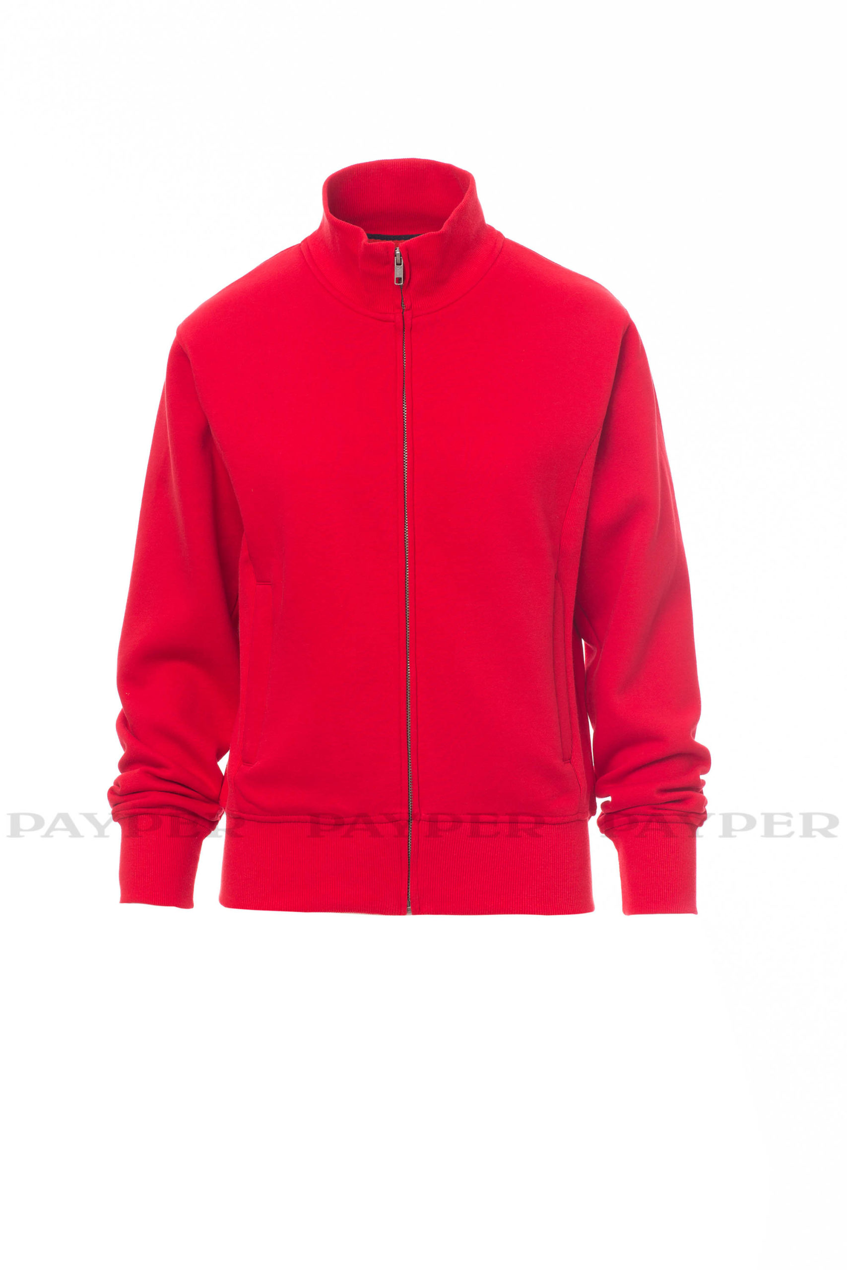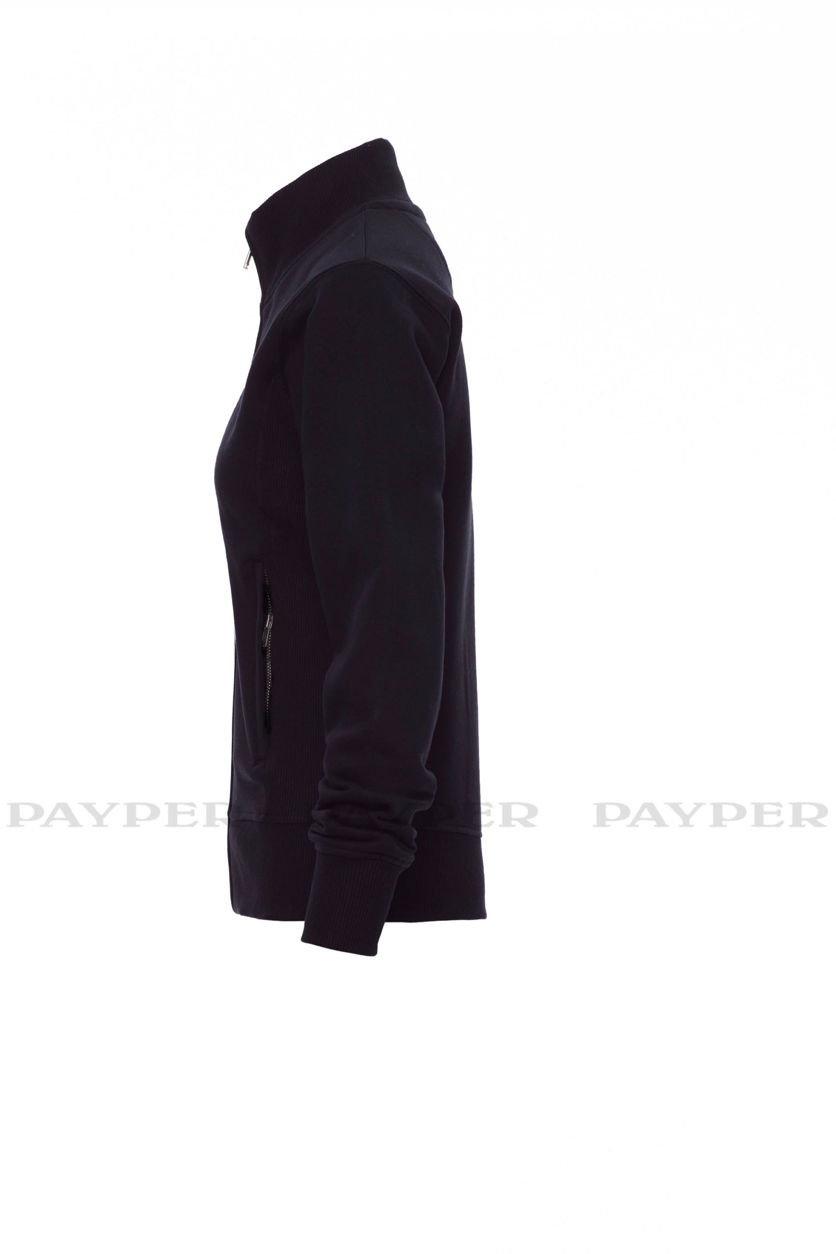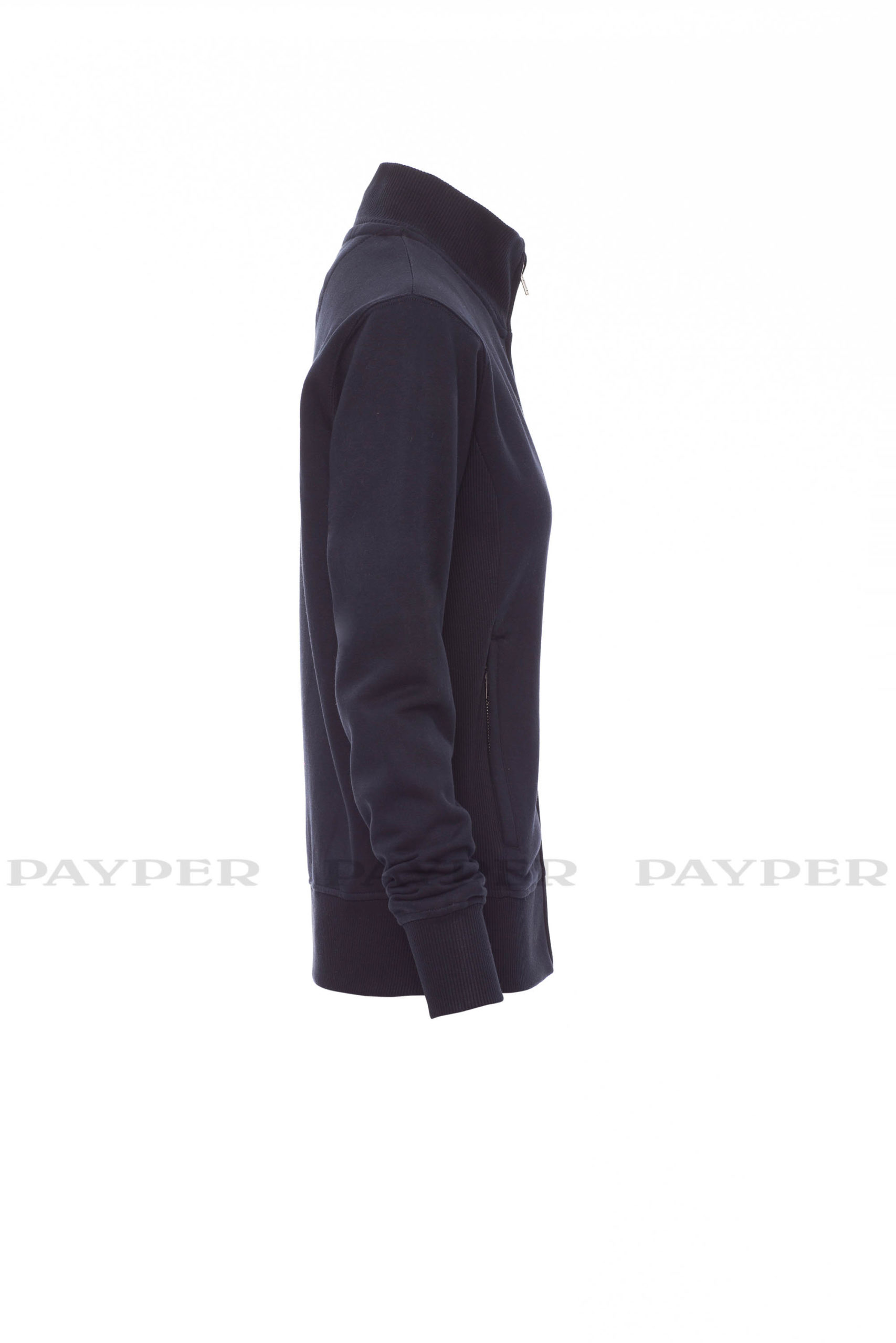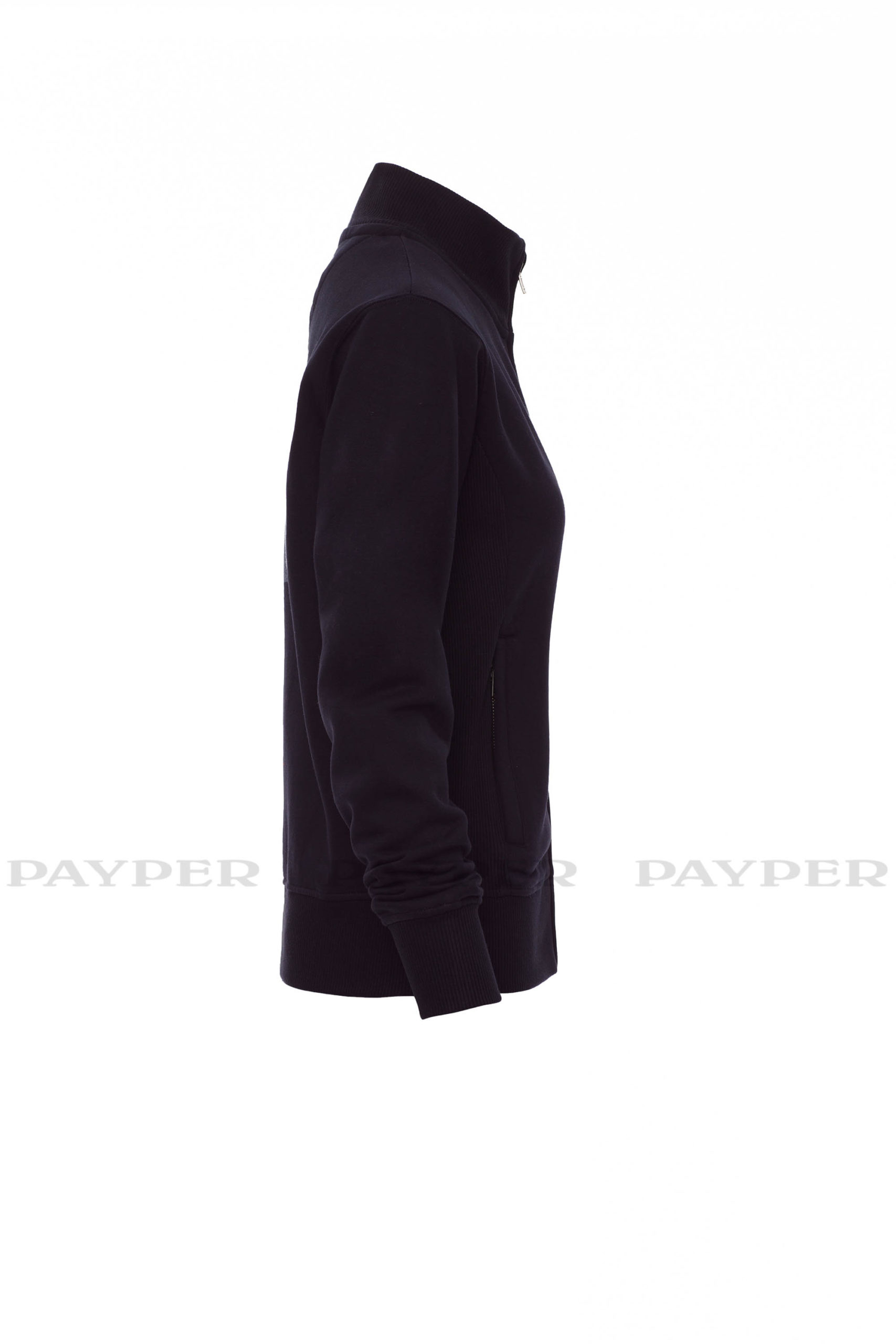 Taillierte Damen-Sweatjacke mit durchgehendem SBS-Reißverschluss und Metallschieber, anliegendem Rippstrickbund, zwei Taschen mit Reißverschluss, Ärmelbündchen, Taille und Kragen aus elastischem Rippstrick, verstärkten Nähten.