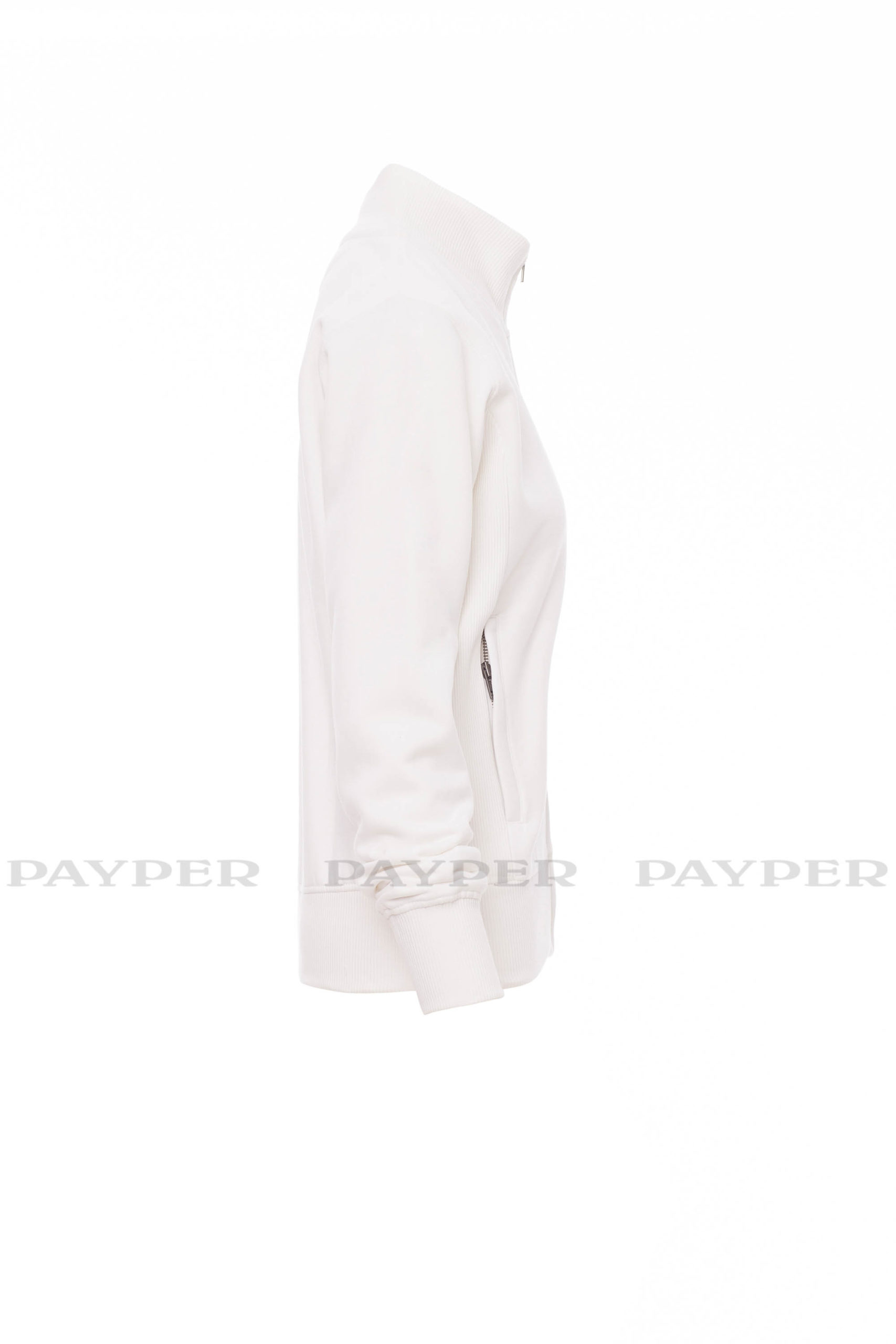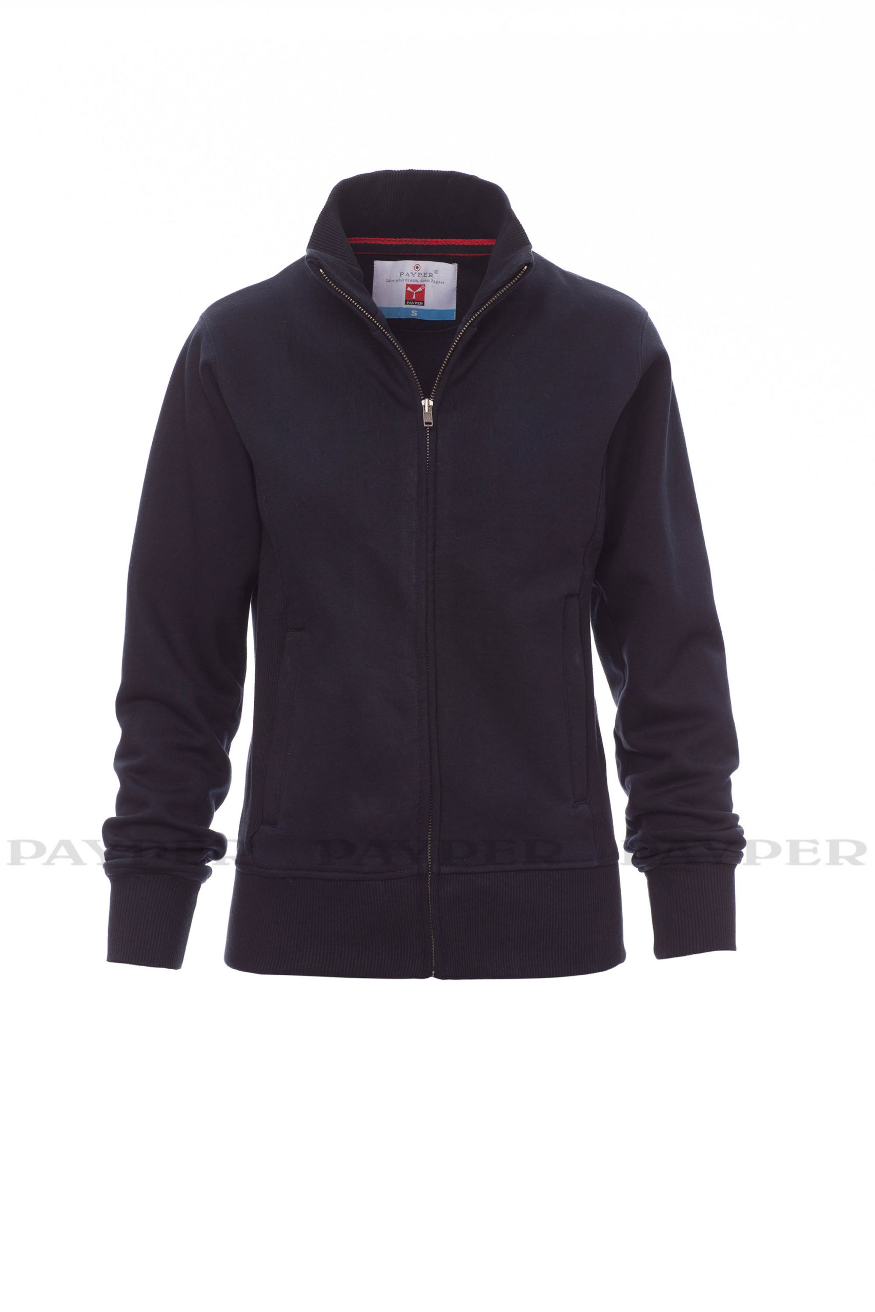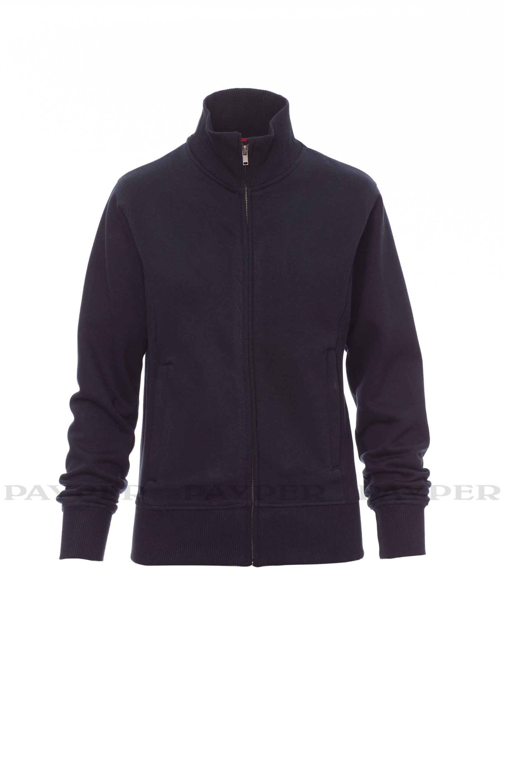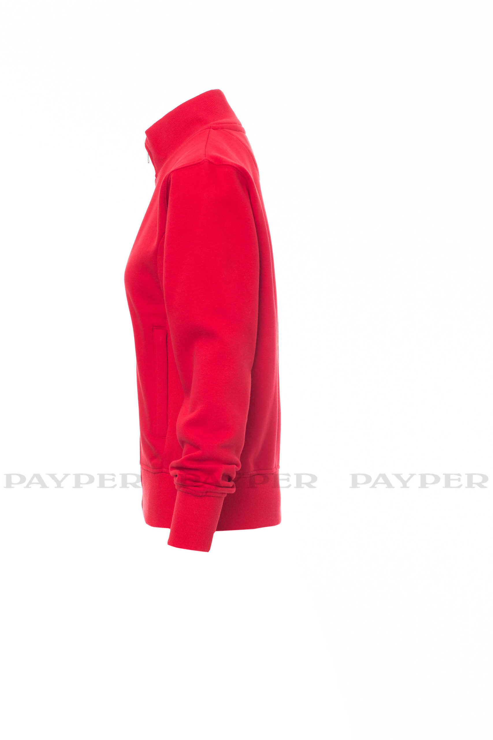 Taillierte Damen-Sweatjacke mit durchgehendem SBS-Reißverschluss und Metallschieber, anliegendem Rippstrickbund, zwei Taschen mit Reißverschluss, Ärmelbündchen, Taille und Kragen aus elastischem Rippstrick, verstärkten Nähten.