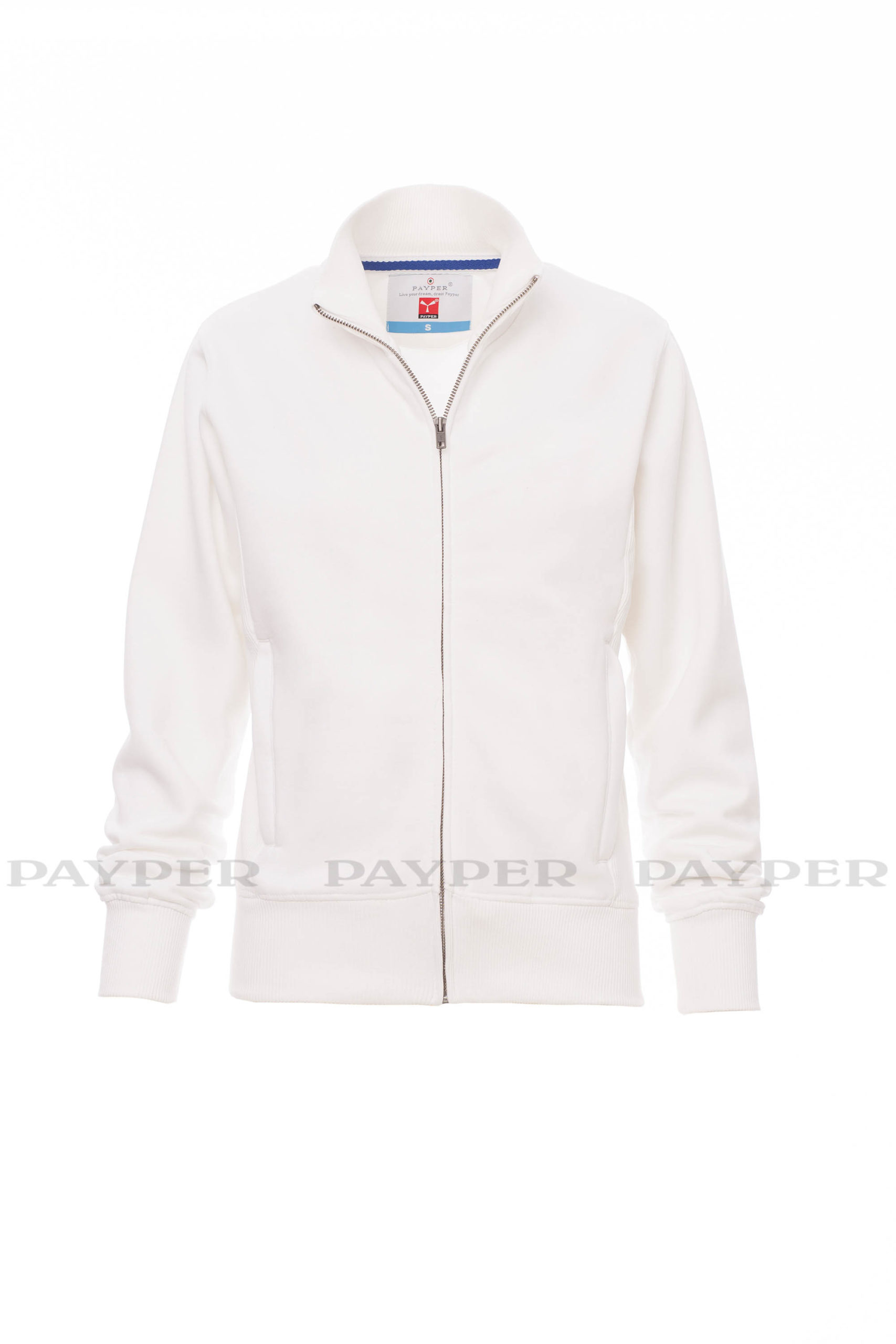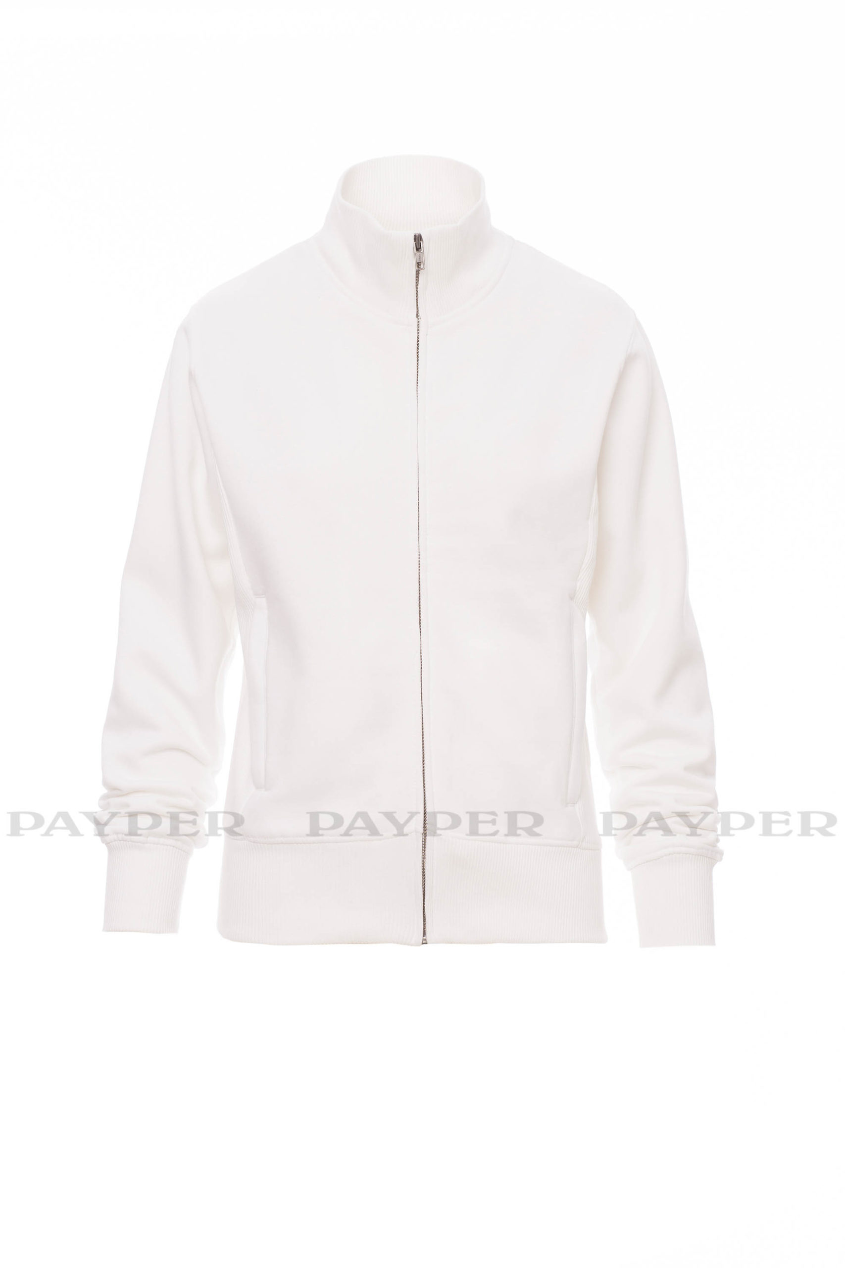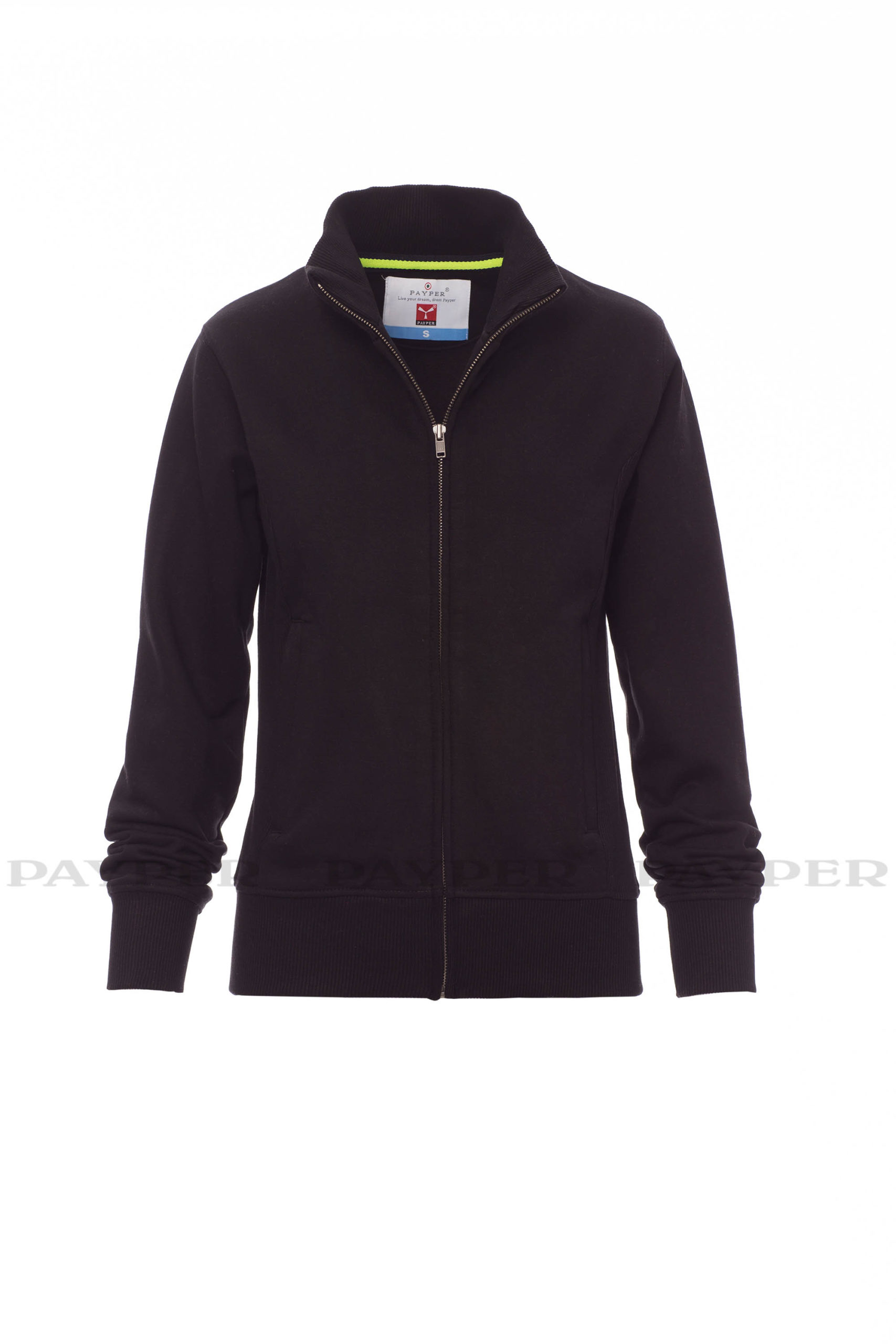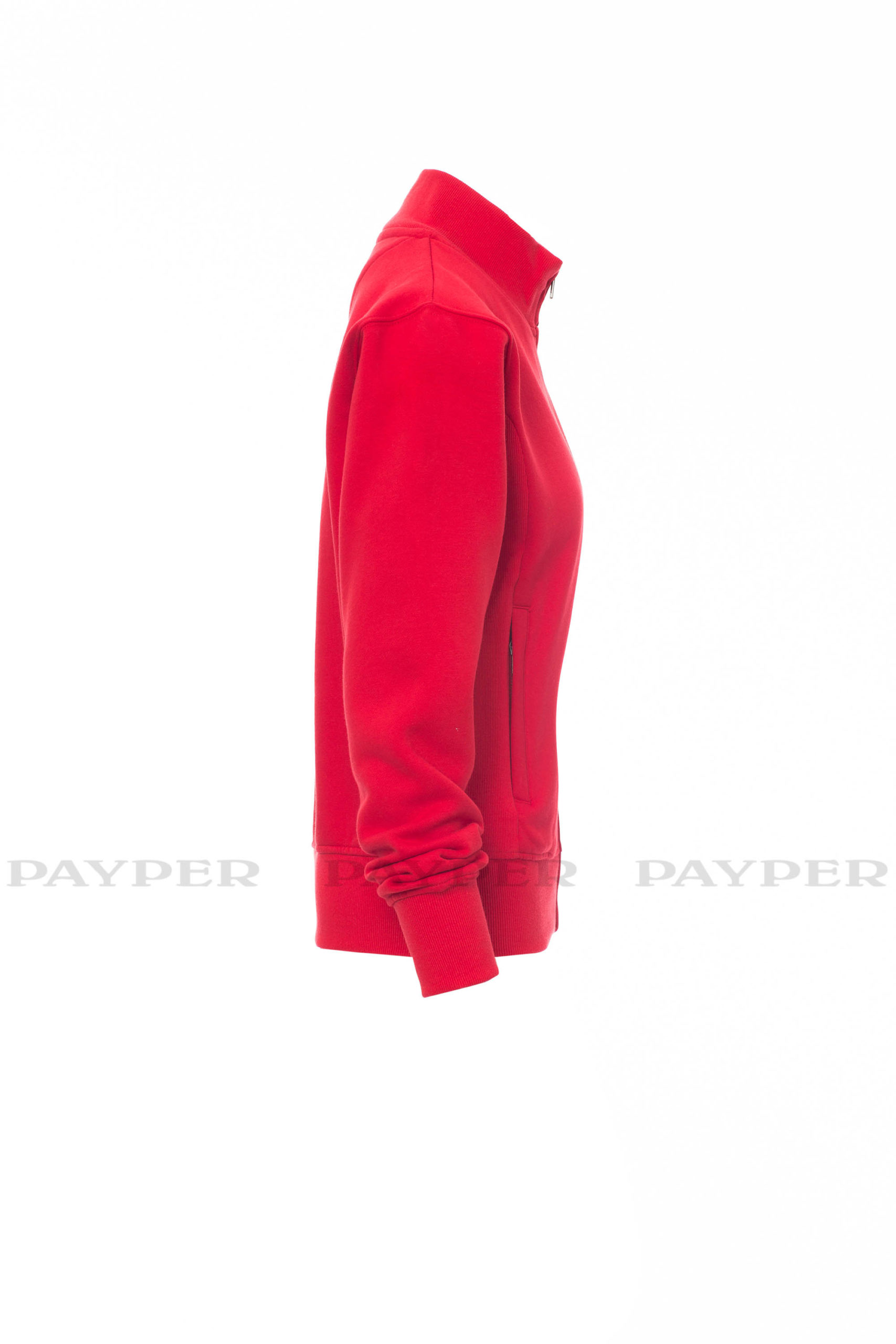Taillierte Damen-Sweatjacke mit durchgehendem SBS-Reißverschluss und Metallschieber, anliegendem Rippstrickbund, zwei Taschen mit Reißverschluss, Ärmelbündchen, Taille und Kragen aus elastischem Rippstrick, verstärkten Nähten.