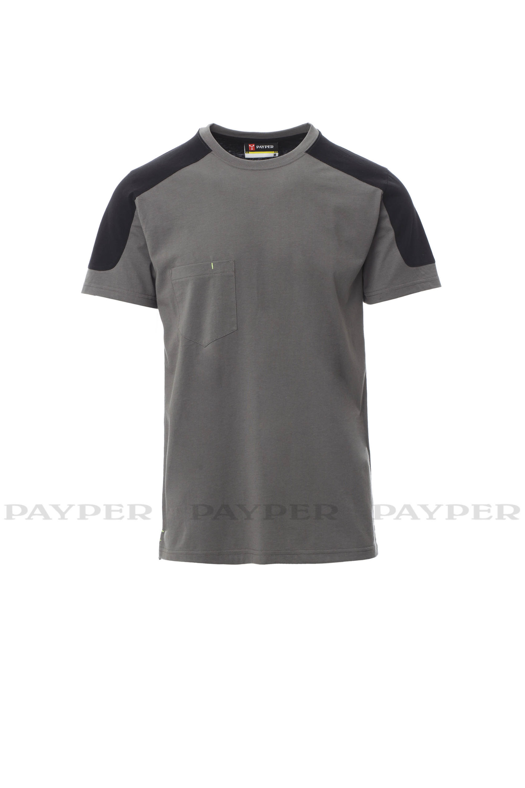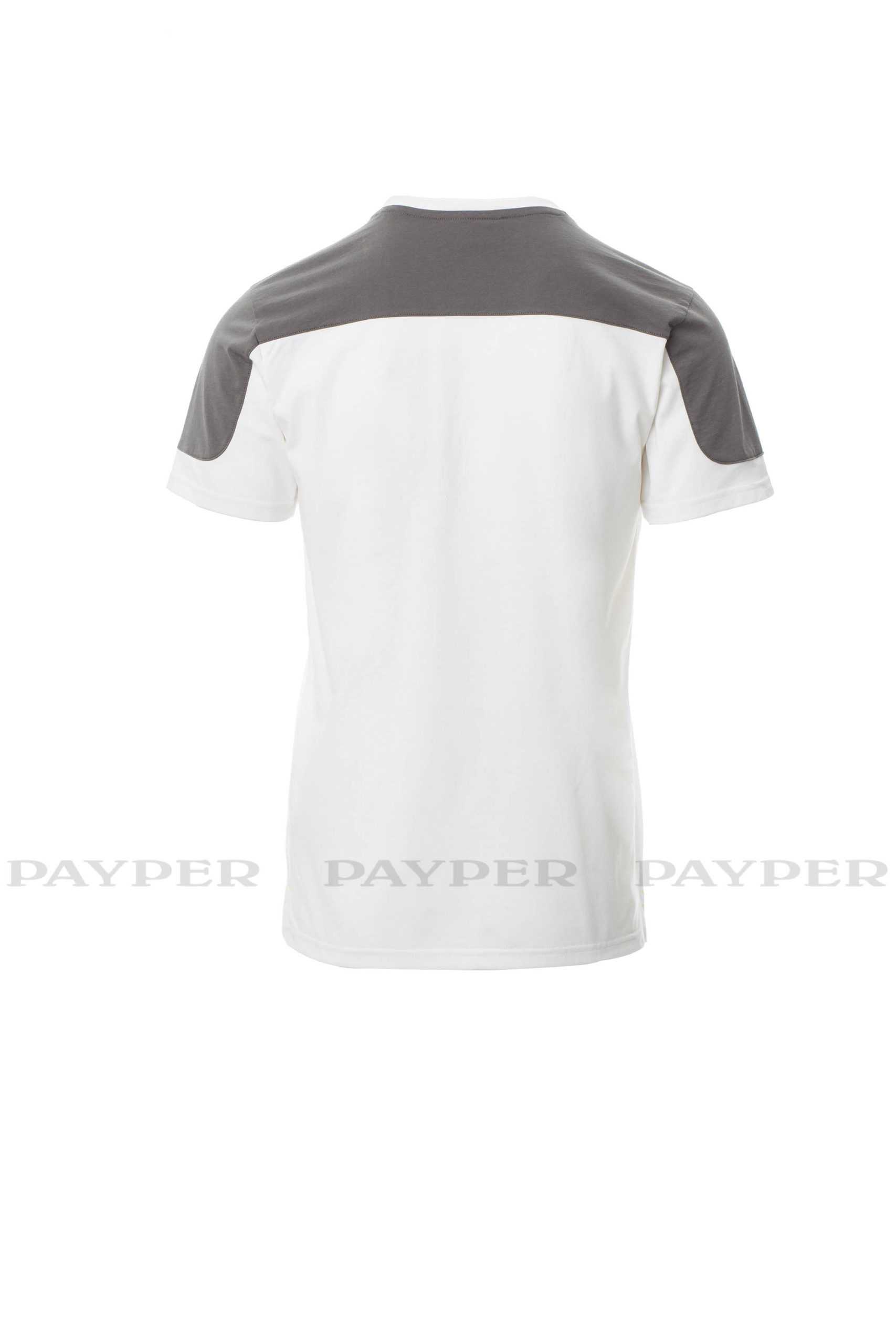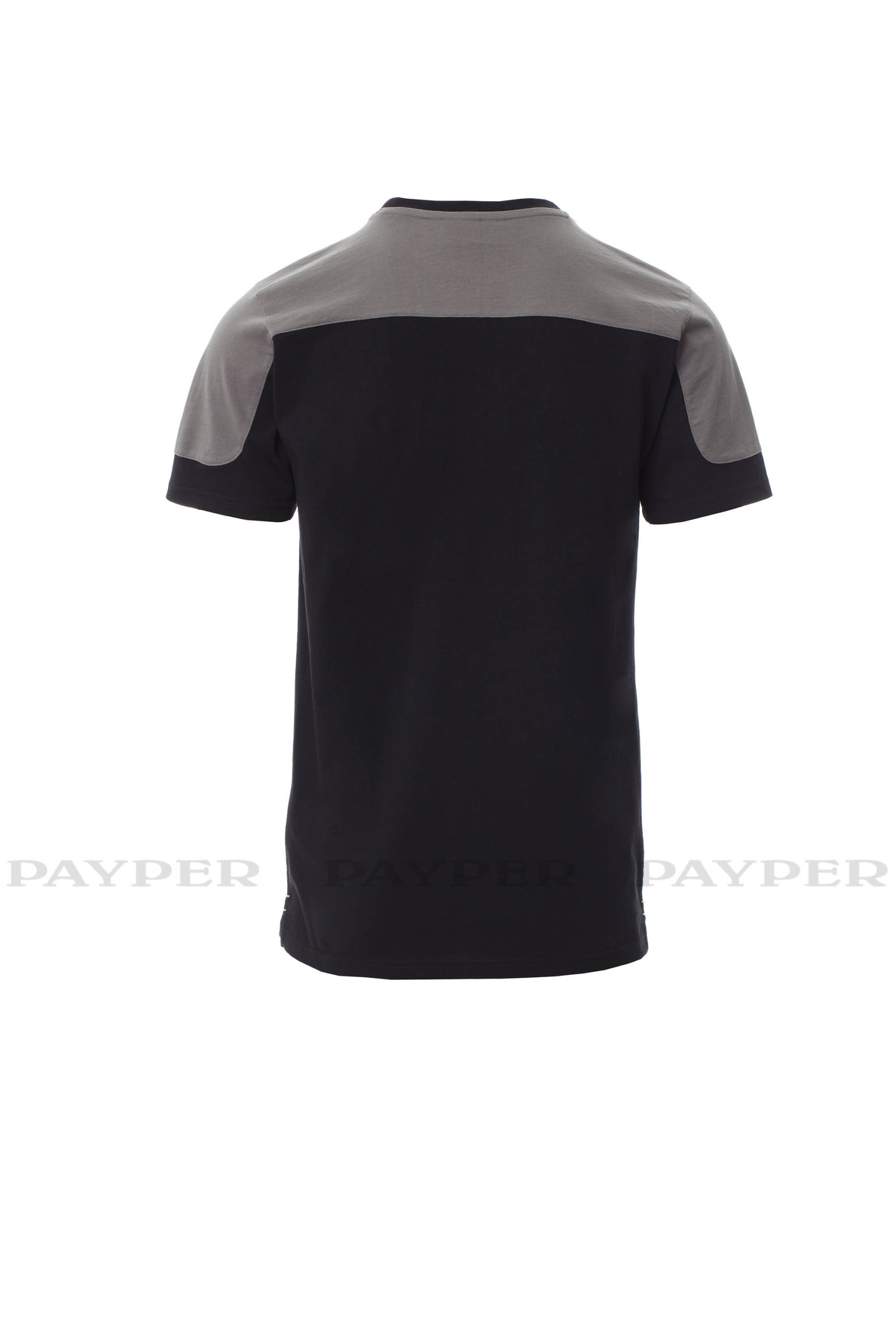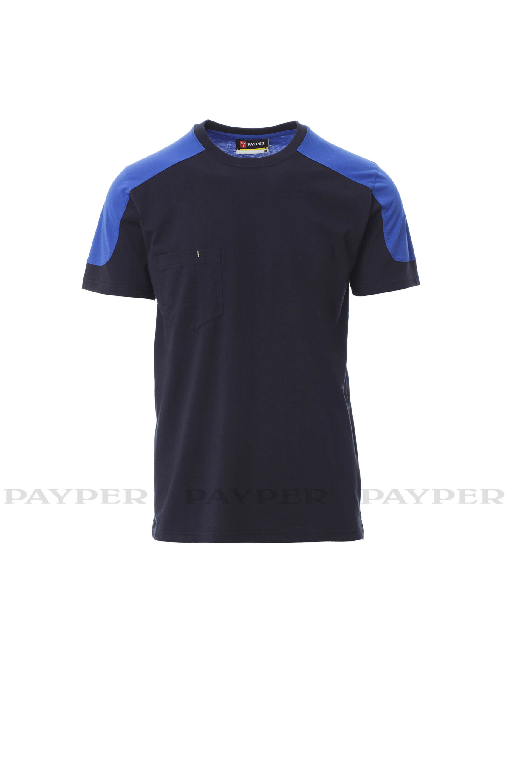Zweifarbiges T-Shirt, Brusttasche mit Stifthalter, Nackenband und seitliches Verstärkungsband.
