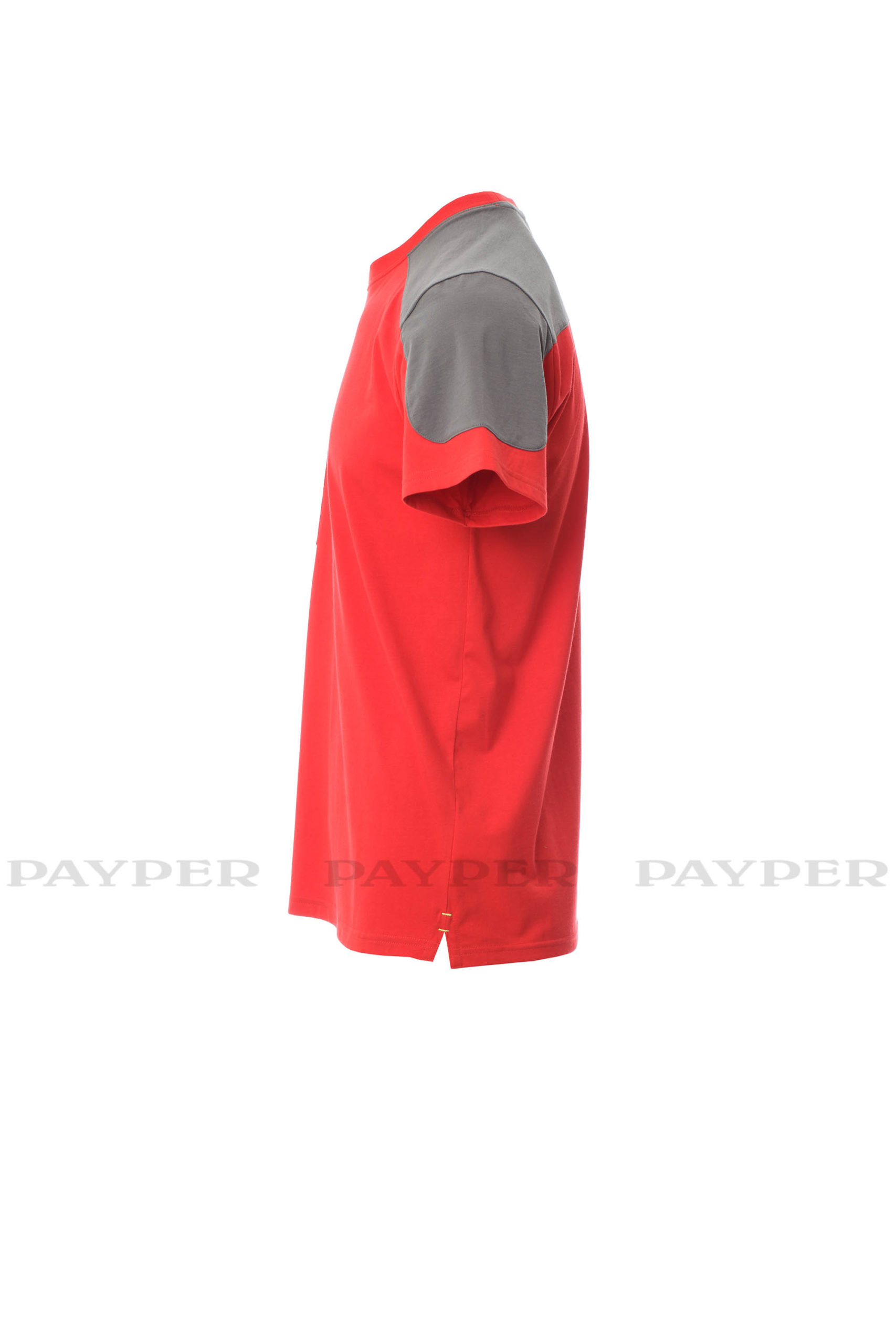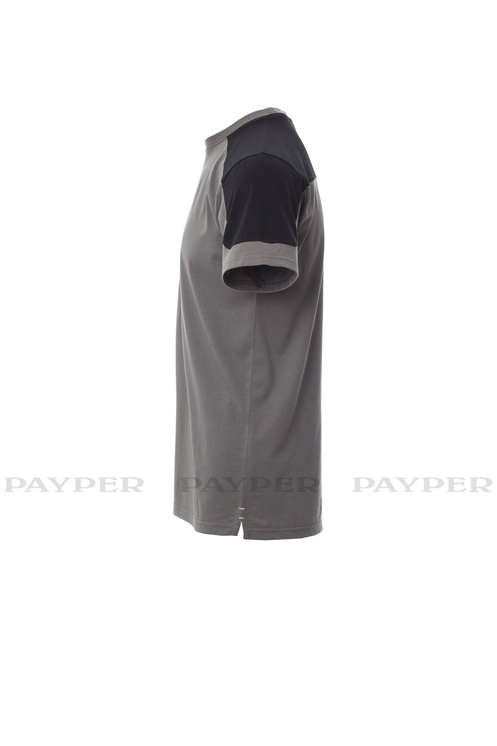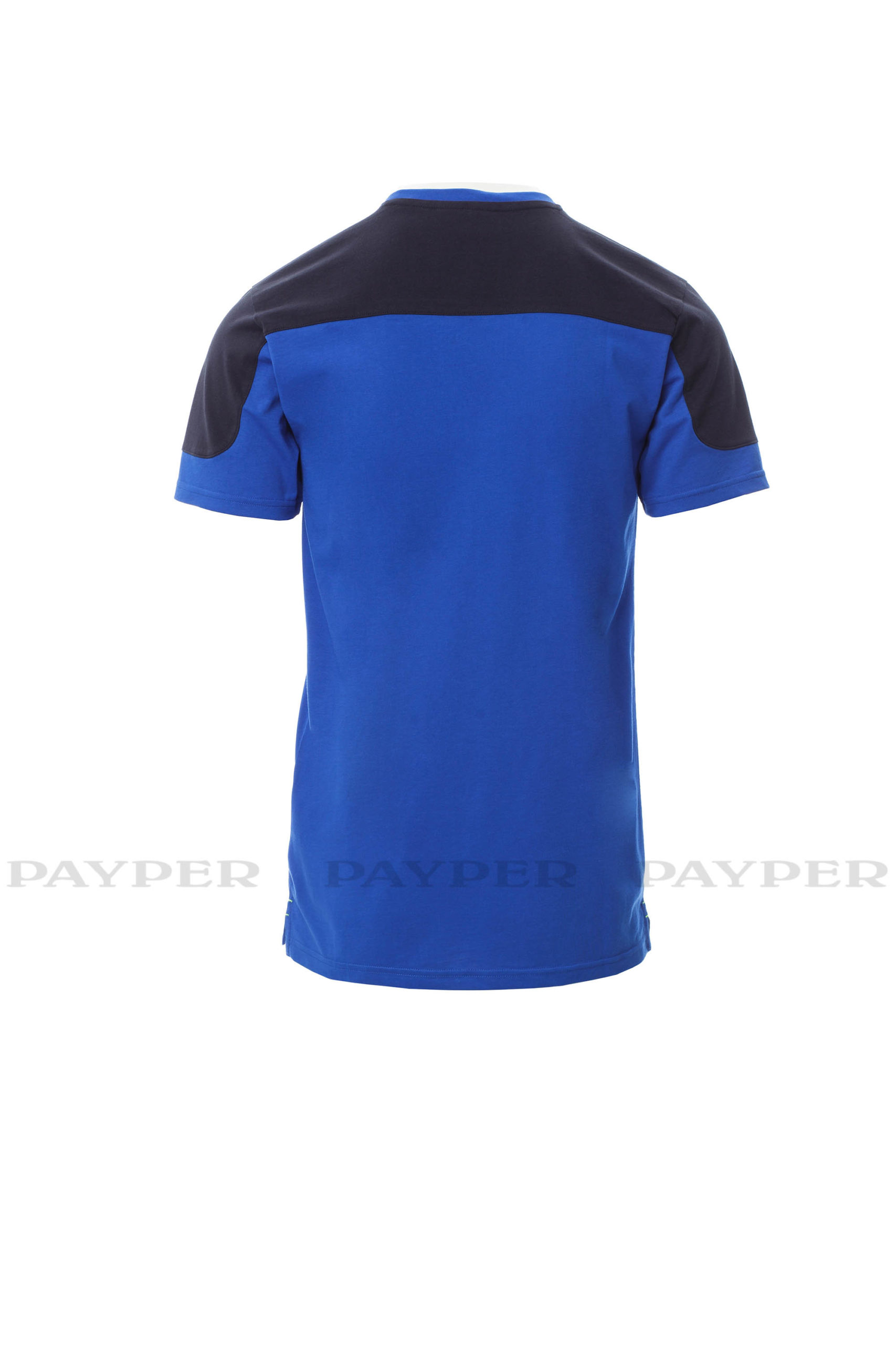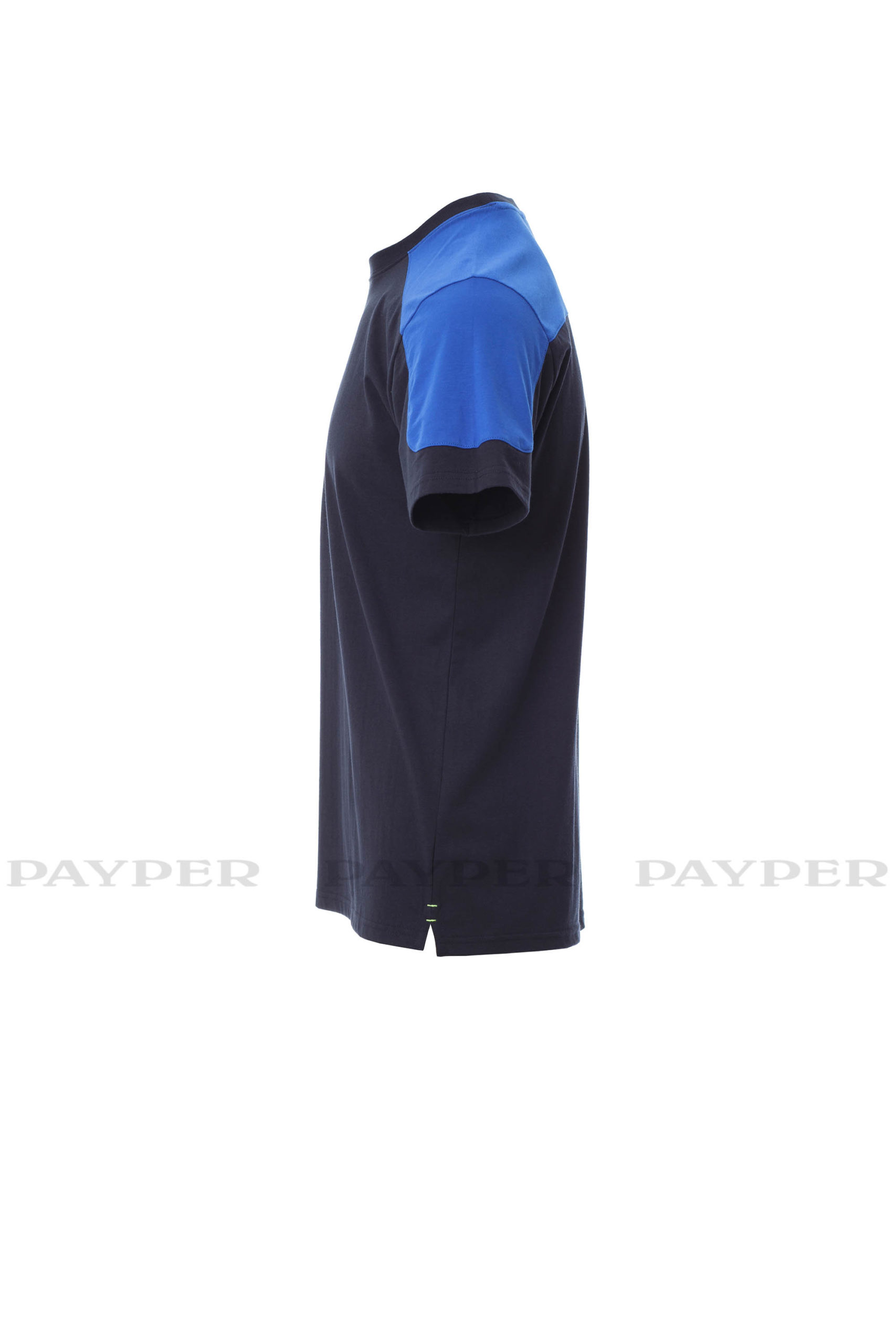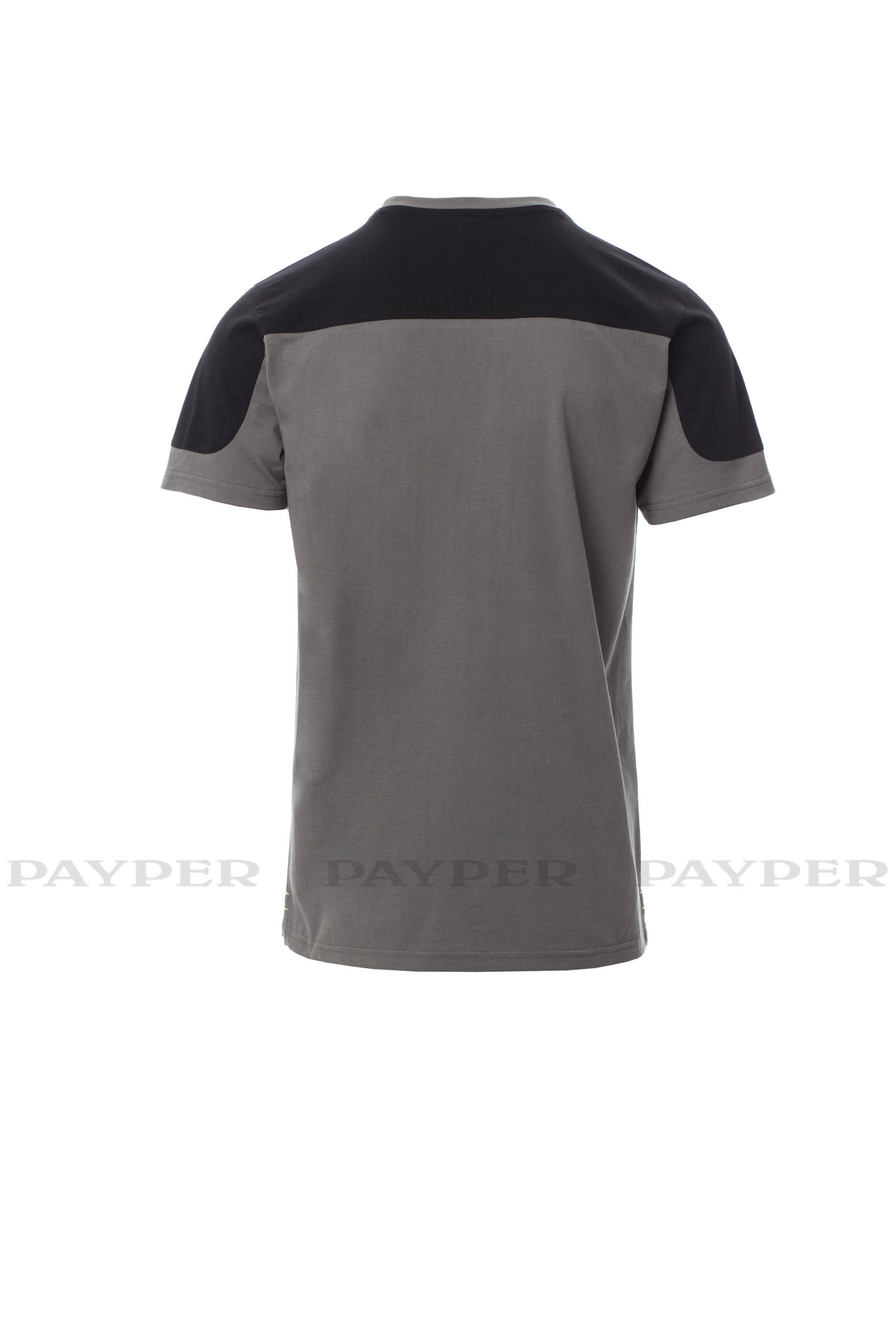 Zweifarbiges T-Shirt, Brusttasche mit Stifthalter, Nackenband und seitliches Verstärkungsband.