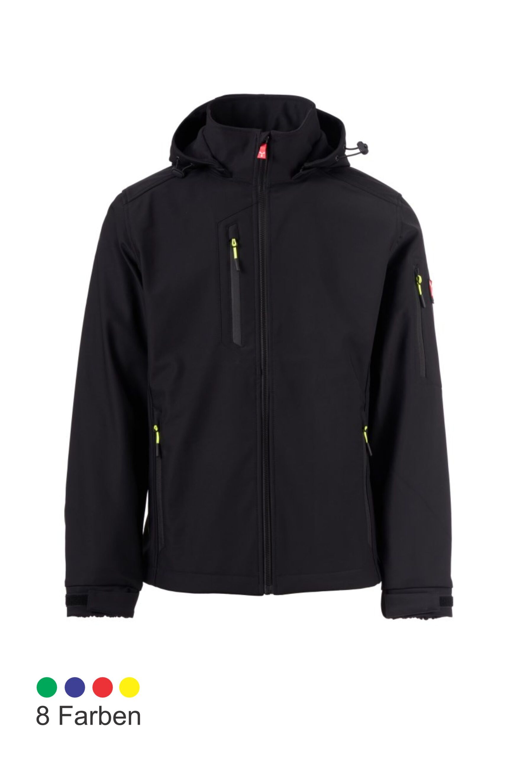 WP 8000 mm H₂O, MVP 5000 g/m² 24 h. Leichte Herren-Softshell, 3-lagig, SBS-Reißverschluss mit „Semi-Auto-Lock“-Metallschieber und personalisiertem Schiebergriff. Abtrennbare Kapuze mit regulierbarem Kordelzug. Reflexstreifen im unteren Rückenbereich und auf der Rückseite der Kapuze. Elastische Ärmelbündchen mit Klettverschluss zur Weitenregulierung. 2 Seitentaschen mit Reißverschluss, 1 Brusttasche mit beschichtetem Reißverschluss und 1 Tasche mit Reißverschluss und integriertem Stifthalter auf dem linken Arm. Fluoreszierende Schiebergriffe. 1 Innentasche mit einfacher Paspel und Klettverschluss. Regulierbarer Saum mit personalisierten Stoppern.
