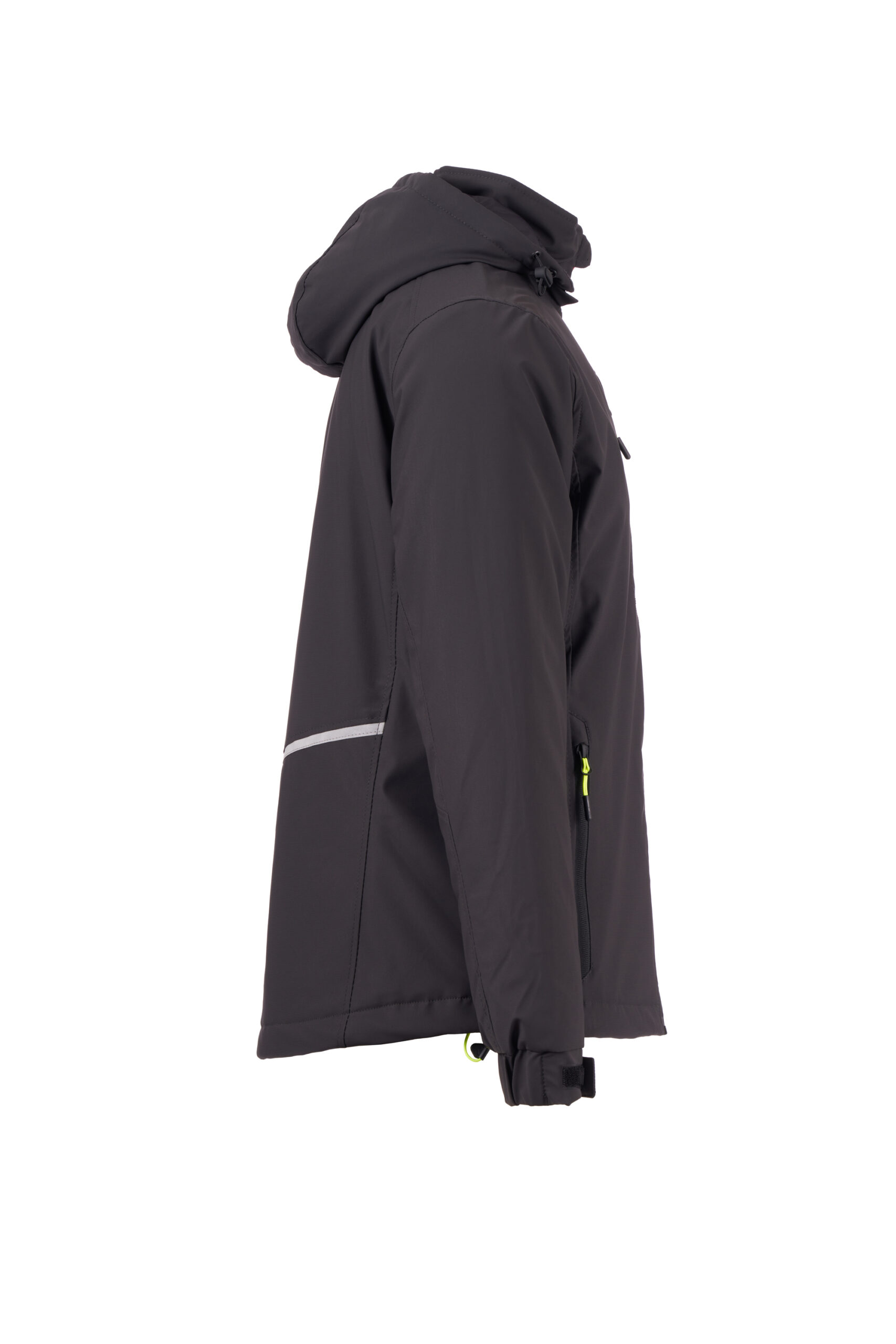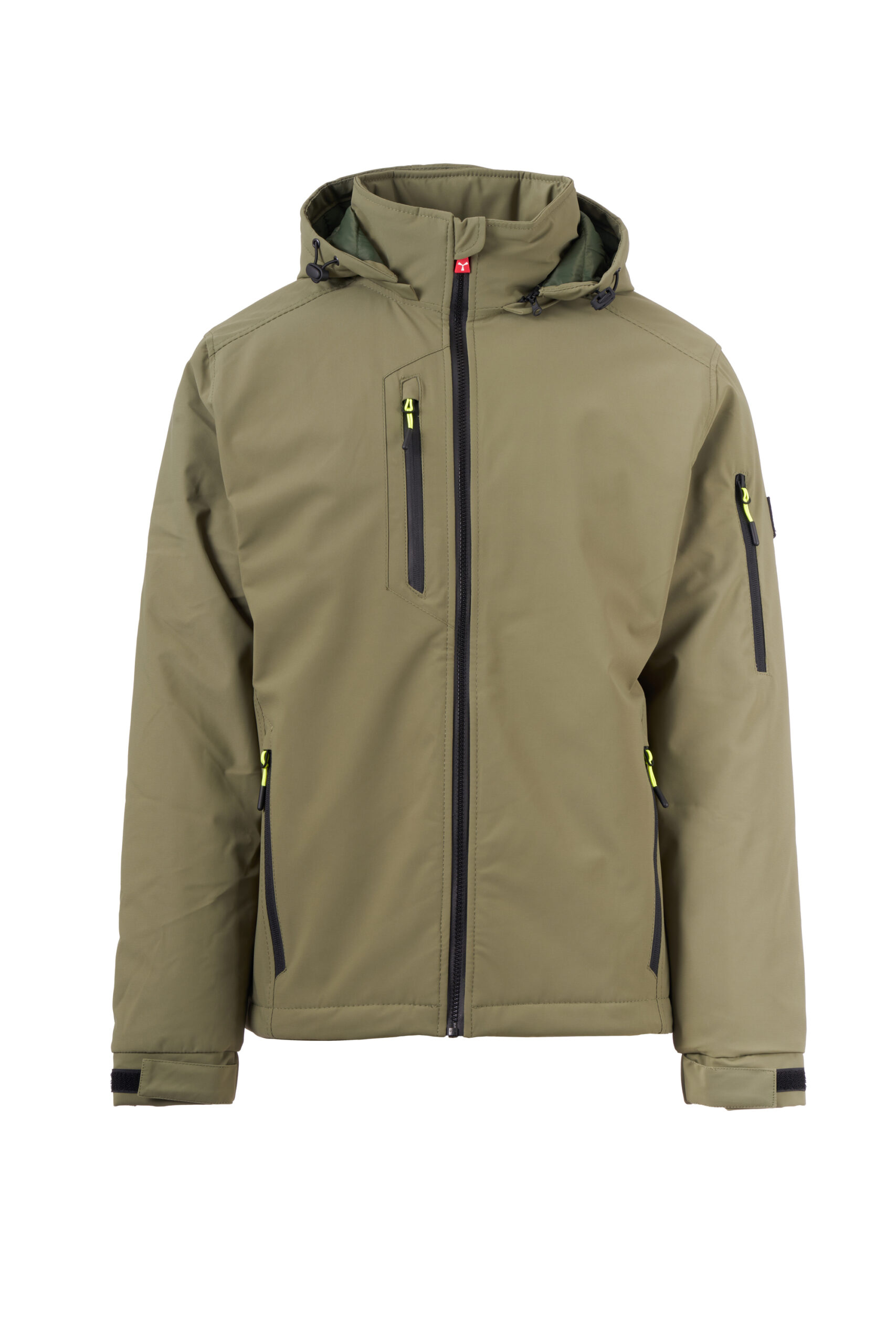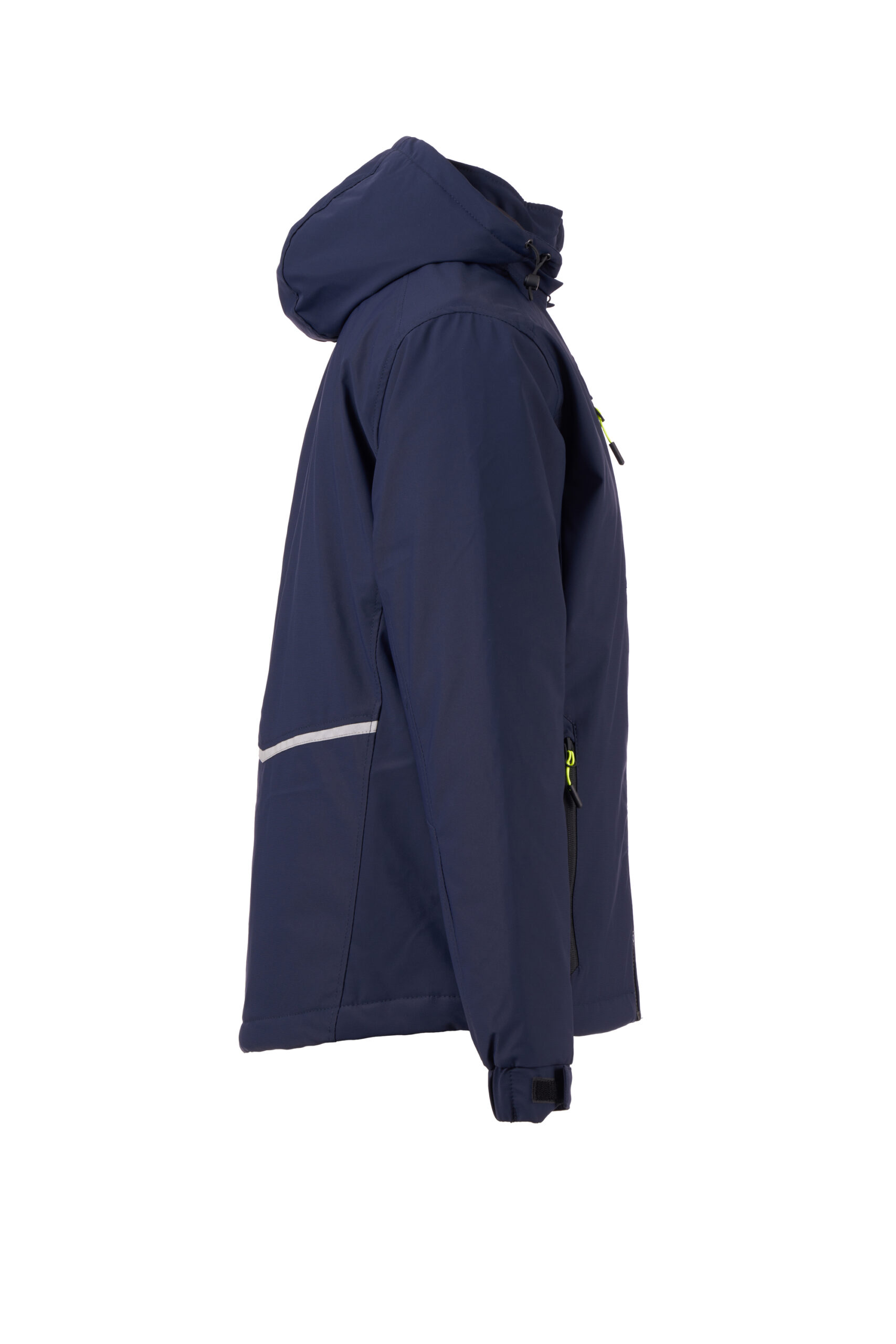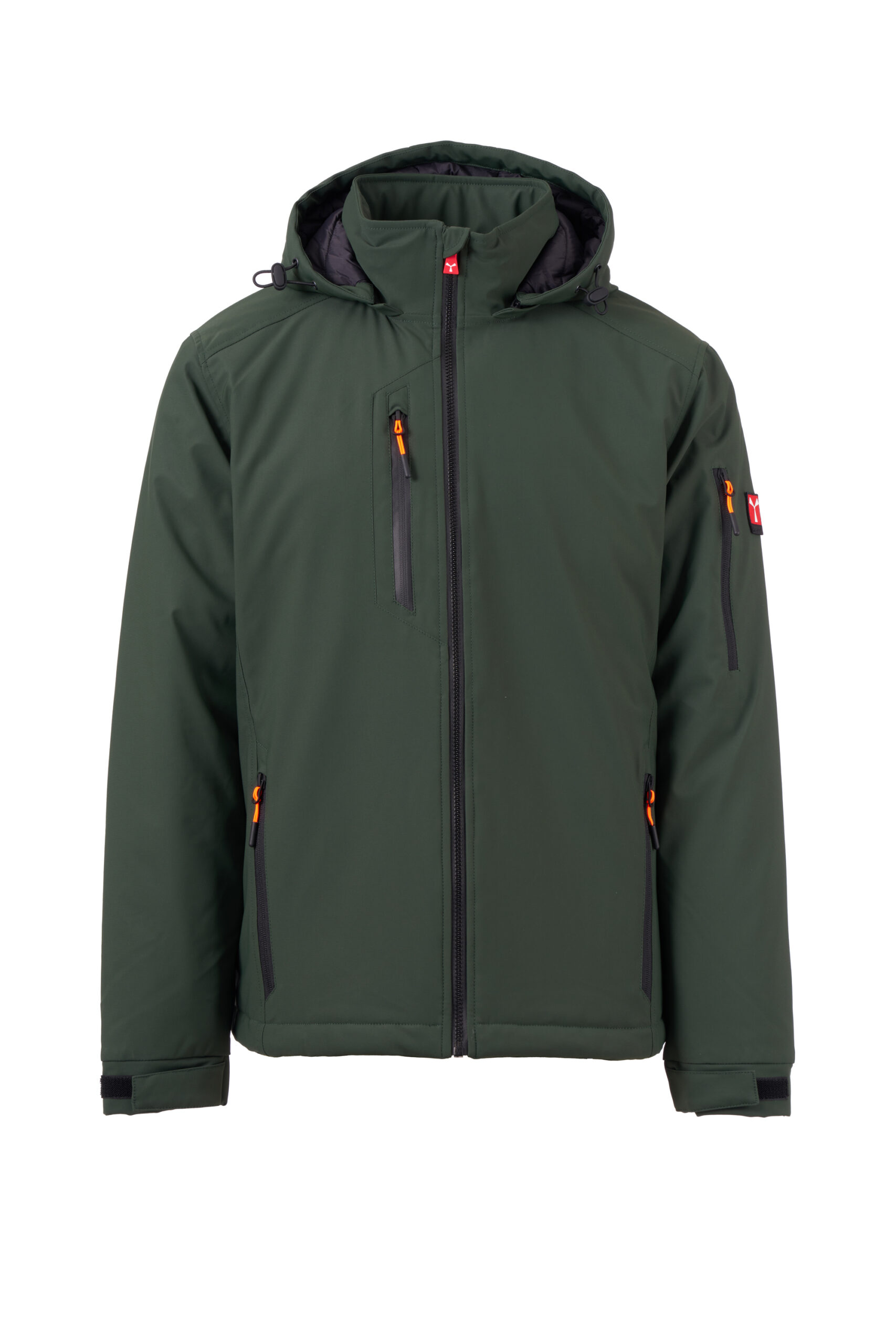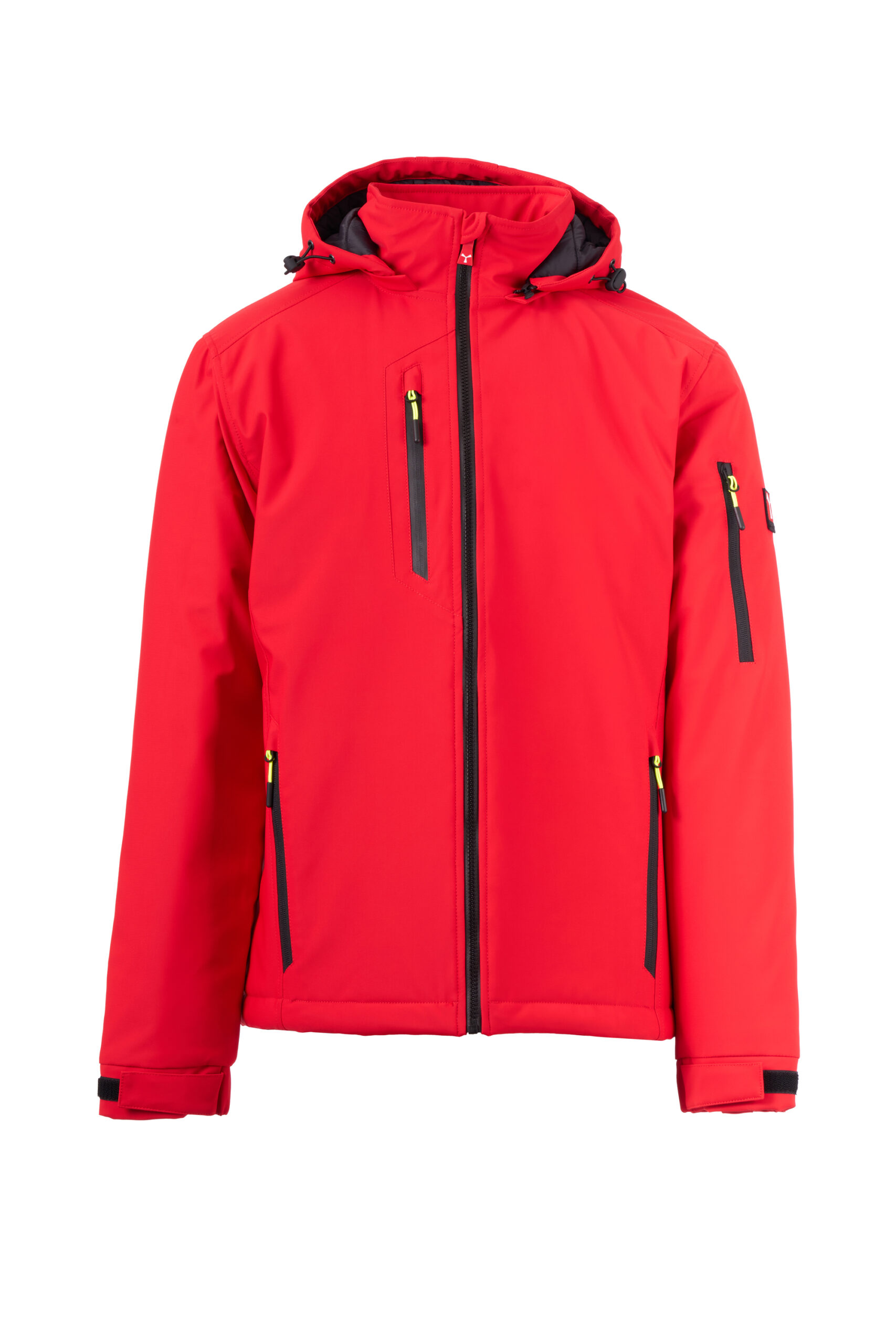 WP 8000 mm H₂O, MVP 5000 g/m² 24 h. Herren-Softshell, 3-lagig, mit mittelstarker Wattierung (140 g/m²), SBS-Reißverschluss mit „Semi-Auto-Lock“-Metallschieber und personalisiertem Schiebergriff. Abtrennbare Kapuze mit regulierbarem Kordelzug. Reflexstreifen im unteren Rückenbereich und auf der Rückseite der Kapuze. Elastische Ärmelbündchen mit Klettverschluss zur Weitenregulierung. 2 Seitentaschen mit Reißverschluss, 1 Brusttasche mit beschichtetem Reißverschluss und 1 Tasche mit Reißverschluss und integriertem Stifthalter auf dem linken Arm. Fluoreszierende Schiebergriffe. 1 Innentasche mit einfacher Paspel und Klettverschluss. Regulierbarer Saum mit personalisierten Stoppern.