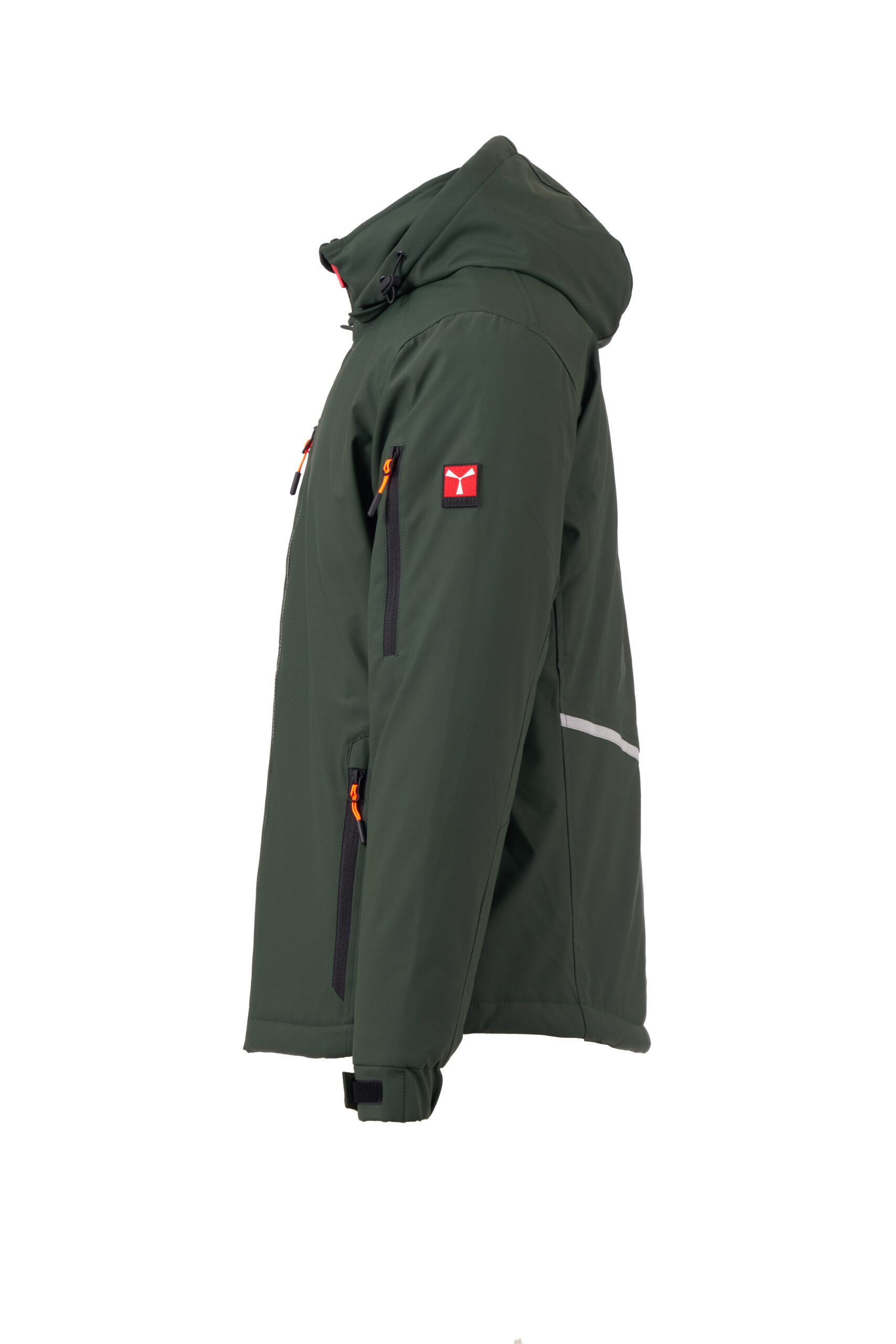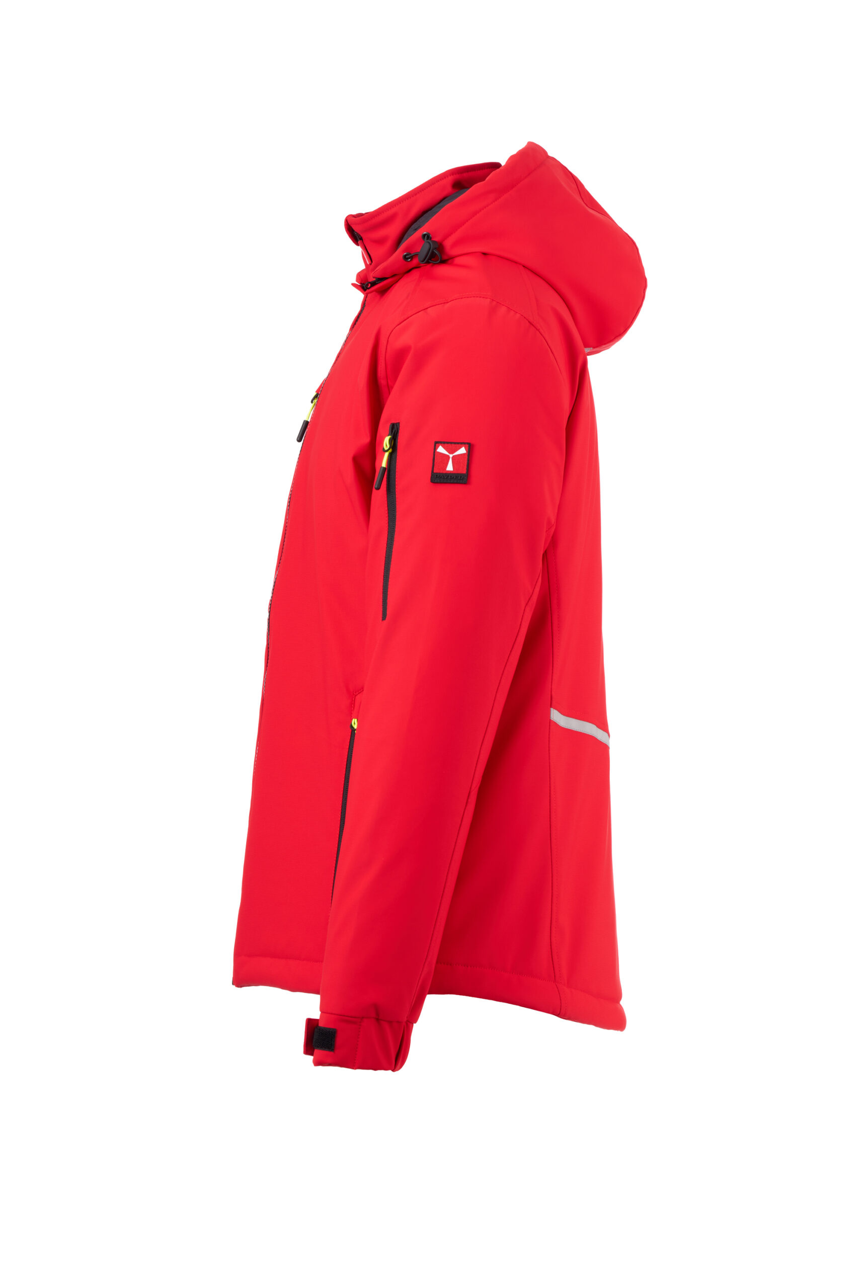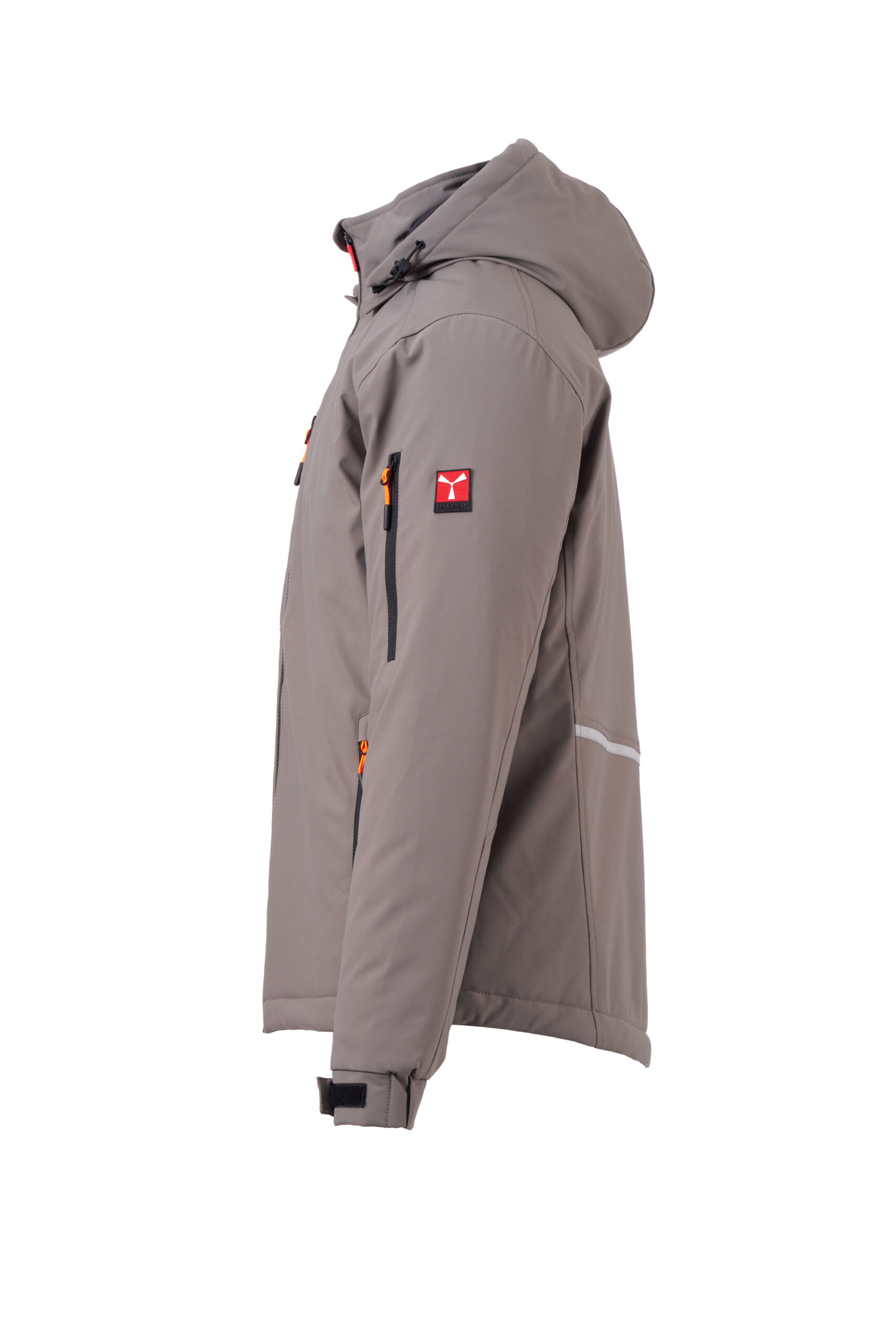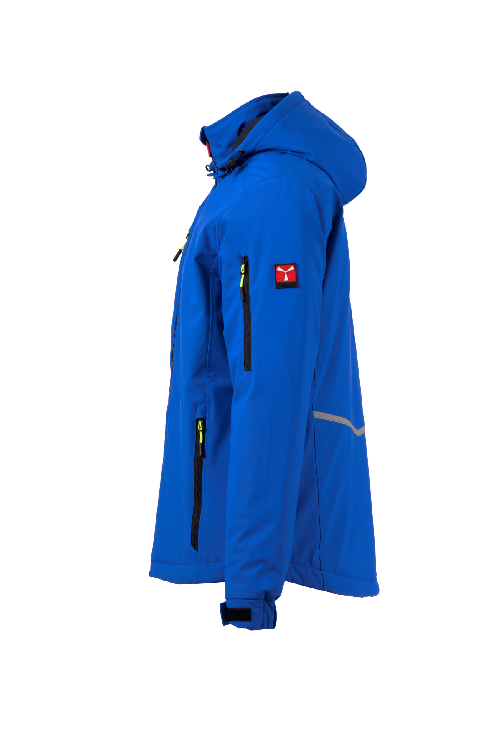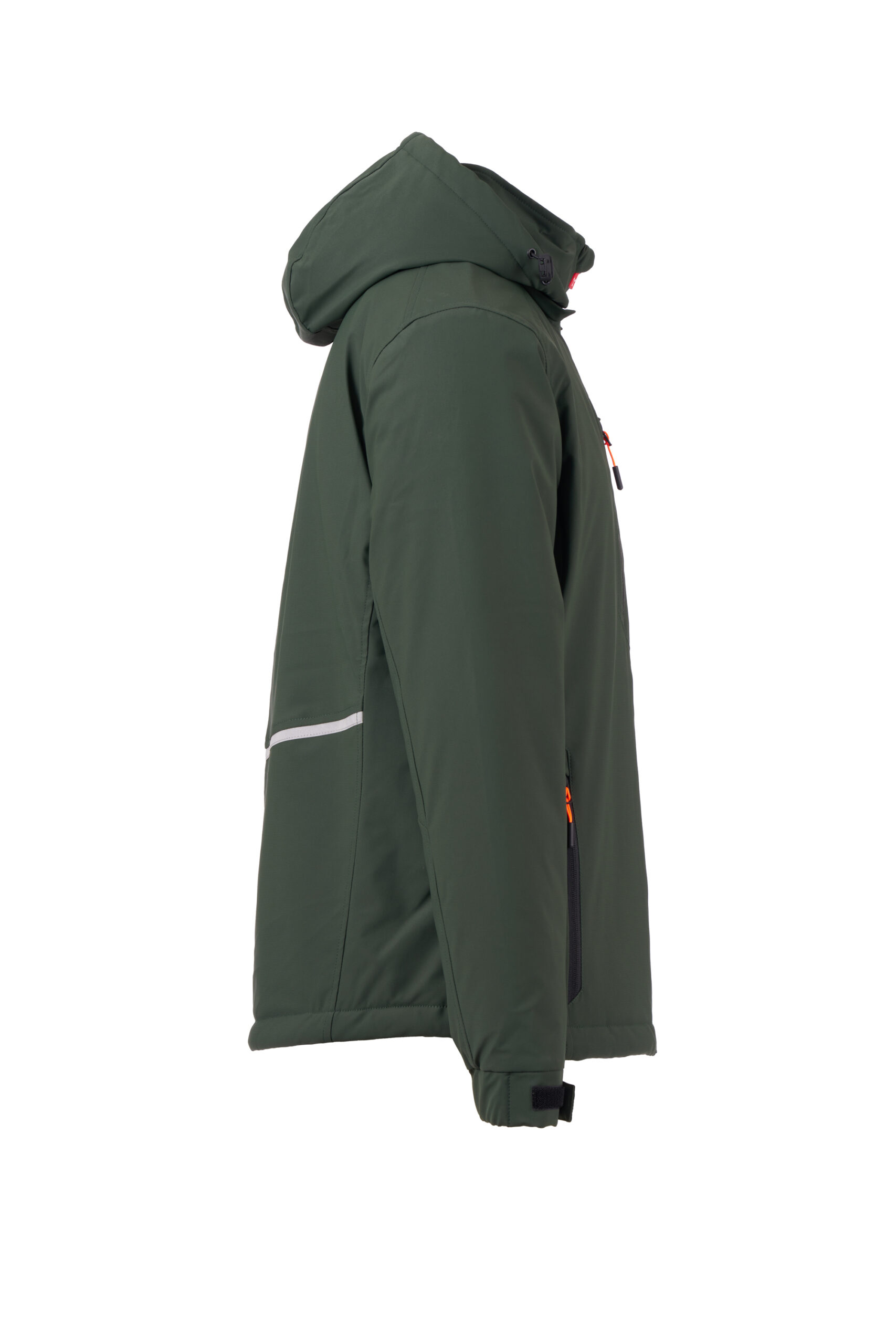 WP 8000 mm H₂O, MVP 5000 g/m² 24 h. Herren-Softshell, 3-lagig, mit mittelstarker Wattierung (140 g/m²), SBS-Reißverschluss mit „Semi-Auto-Lock“-Metallschieber und personalisiertem Schiebergriff. Abtrennbare Kapuze mit regulierbarem Kordelzug. Reflexstreifen im unteren Rückenbereich und auf der Rückseite der Kapuze. Elastische Ärmelbündchen mit Klettverschluss zur Weitenregulierung. 2 Seitentaschen mit Reißverschluss, 1 Brusttasche mit beschichtetem Reißverschluss und 1 Tasche mit Reißverschluss und integriertem Stifthalter auf dem linken Arm. Fluoreszierende Schiebergriffe. 1 Innentasche mit einfacher Paspel und Klettverschluss. Regulierbarer Saum mit personalisierten Stoppern.