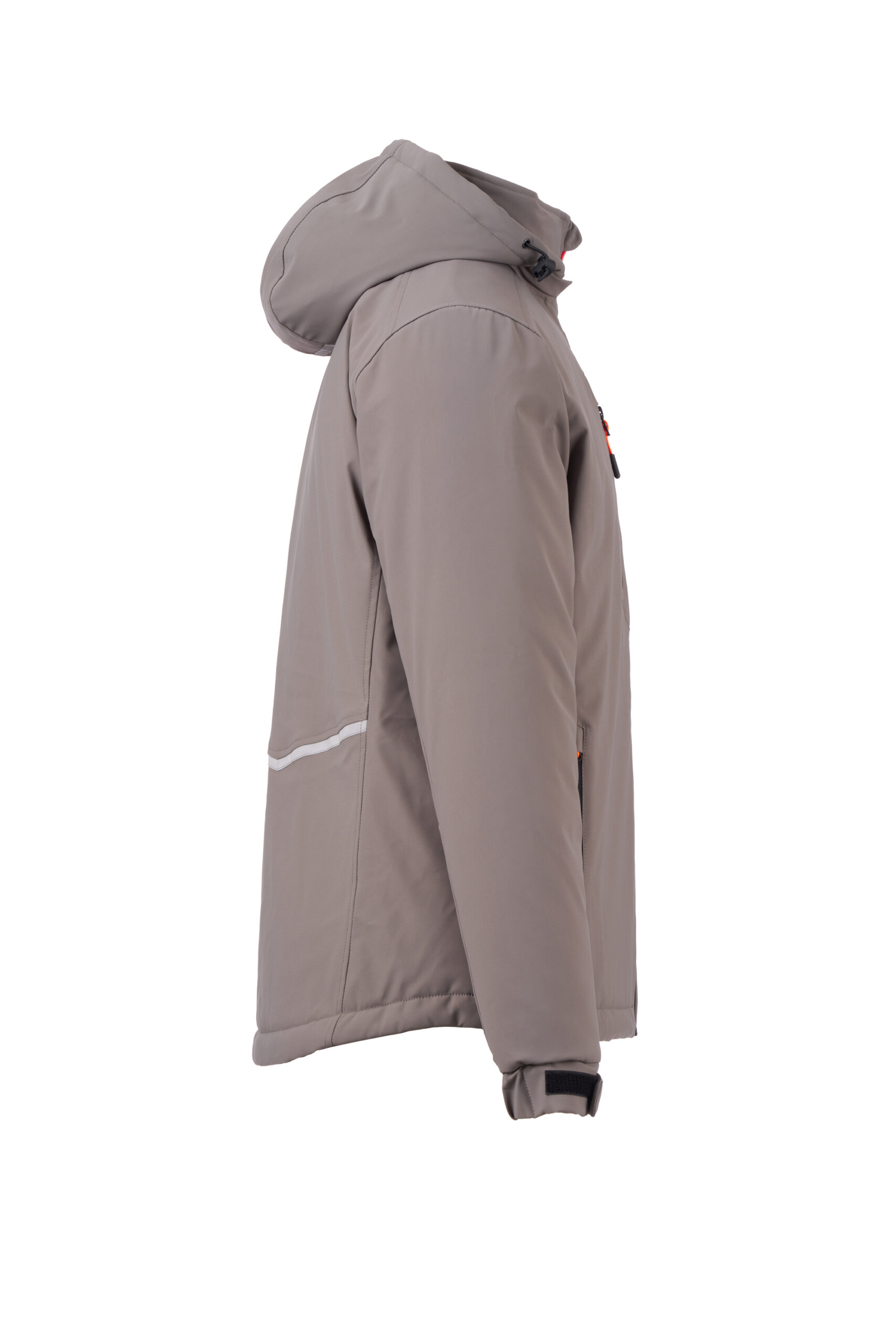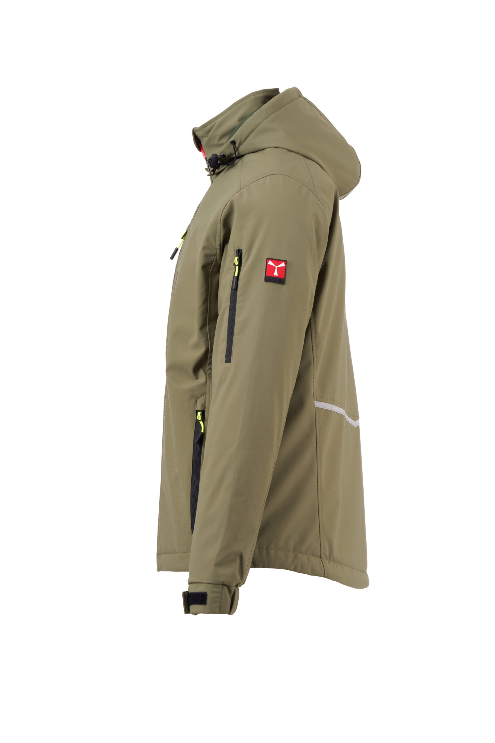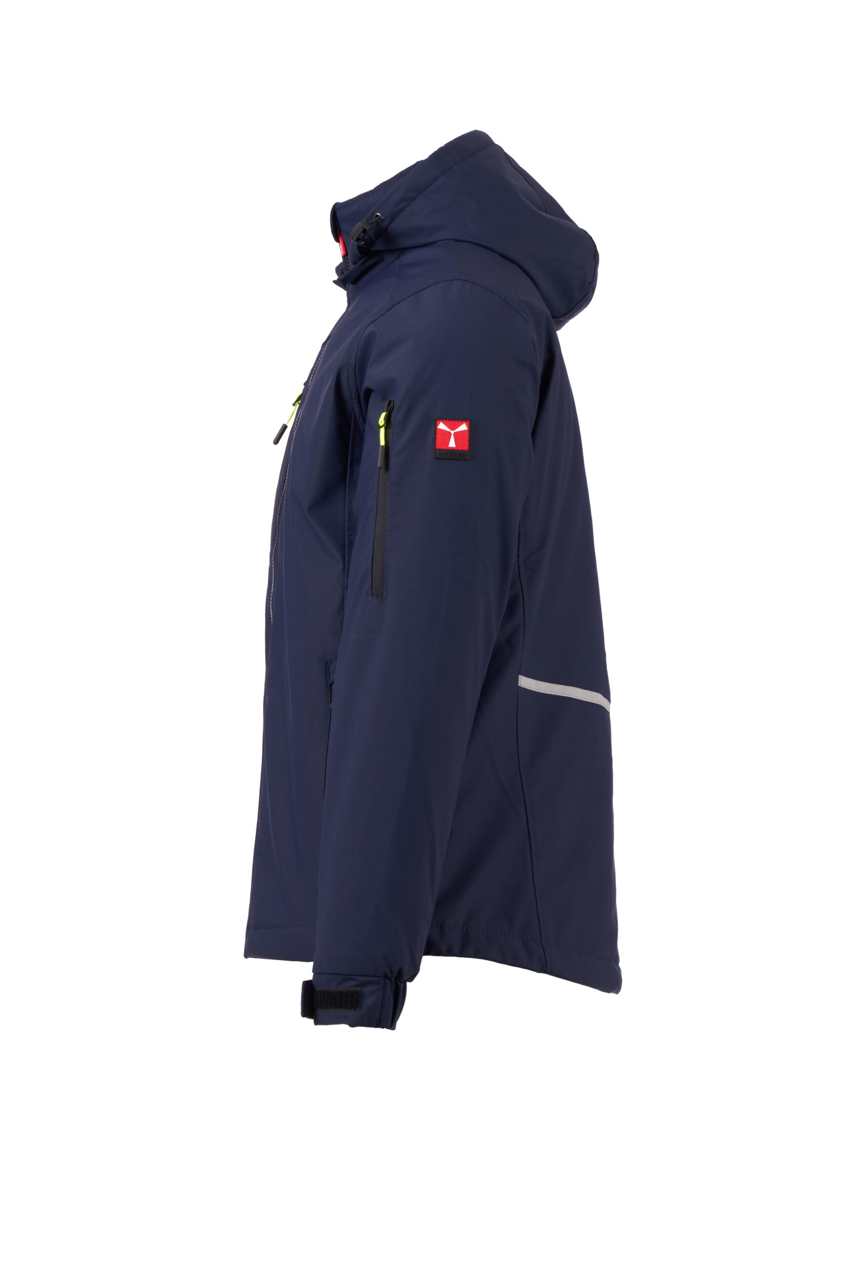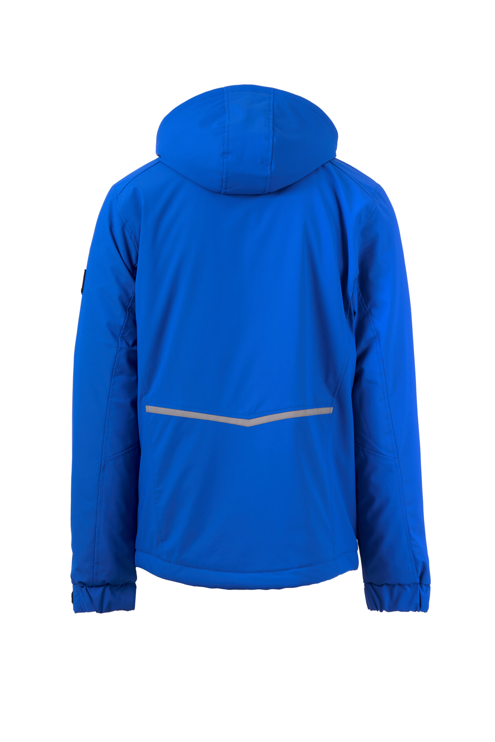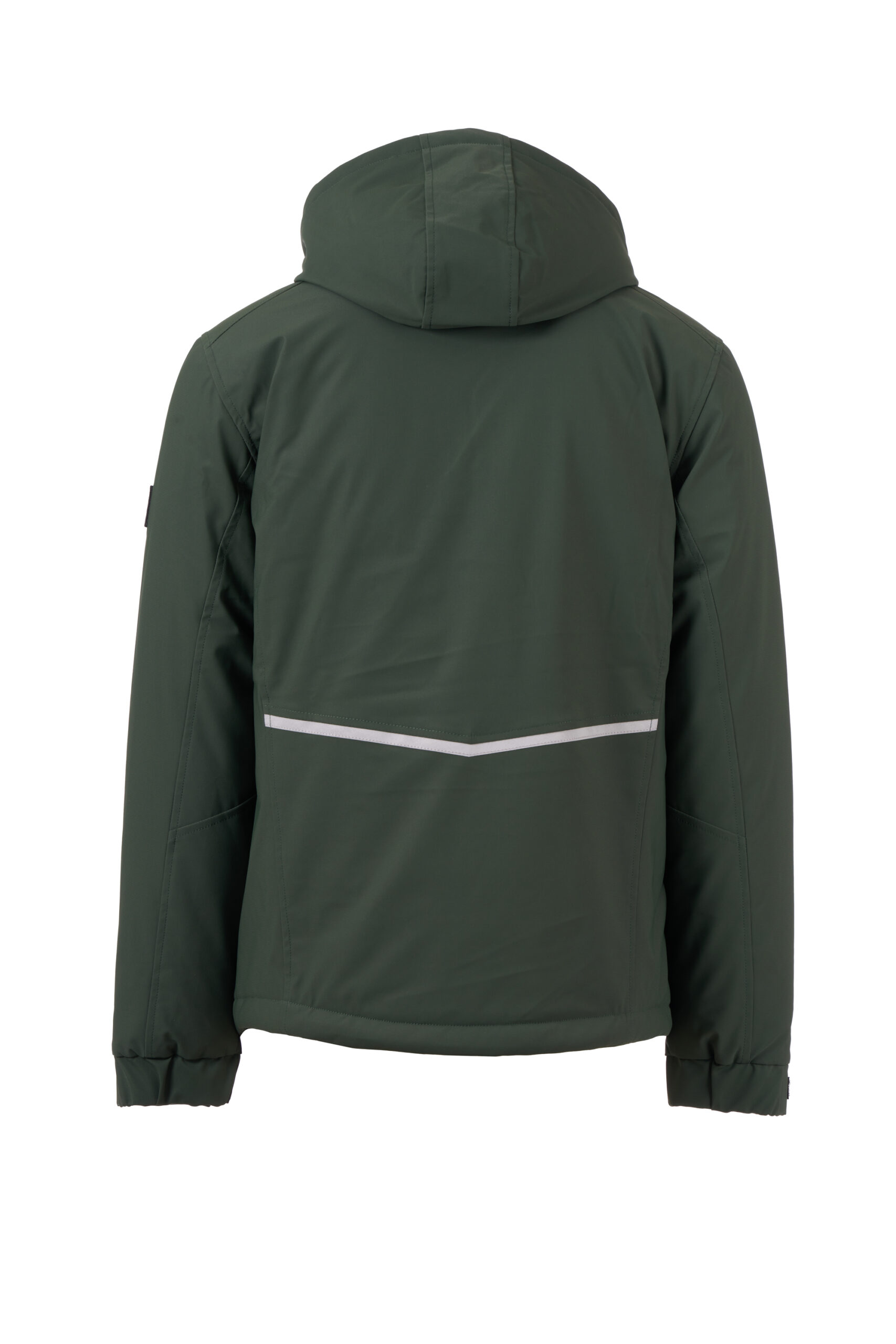 WP 8000 mm H₂O, MVP 5000 g/m² 24 h. Herren-Softshell, 3-lagig, mit mittelstarker Wattierung (140 g/m²), SBS-Reißverschluss mit „Semi-Auto-Lock“-Metallschieber und personalisiertem Schiebergriff. Abtrennbare Kapuze mit regulierbarem Kordelzug. Reflexstreifen im unteren Rückenbereich und auf der Rückseite der Kapuze. Elastische Ärmelbündchen mit Klettverschluss zur Weitenregulierung. 2 Seitentaschen mit Reißverschluss, 1 Brusttasche mit beschichtetem Reißverschluss und 1 Tasche mit Reißverschluss und integriertem Stifthalter auf dem linken Arm. Fluoreszierende Schiebergriffe. 1 Innentasche mit einfacher Paspel und Klettverschluss. Regulierbarer Saum mit personalisierten Stoppern.