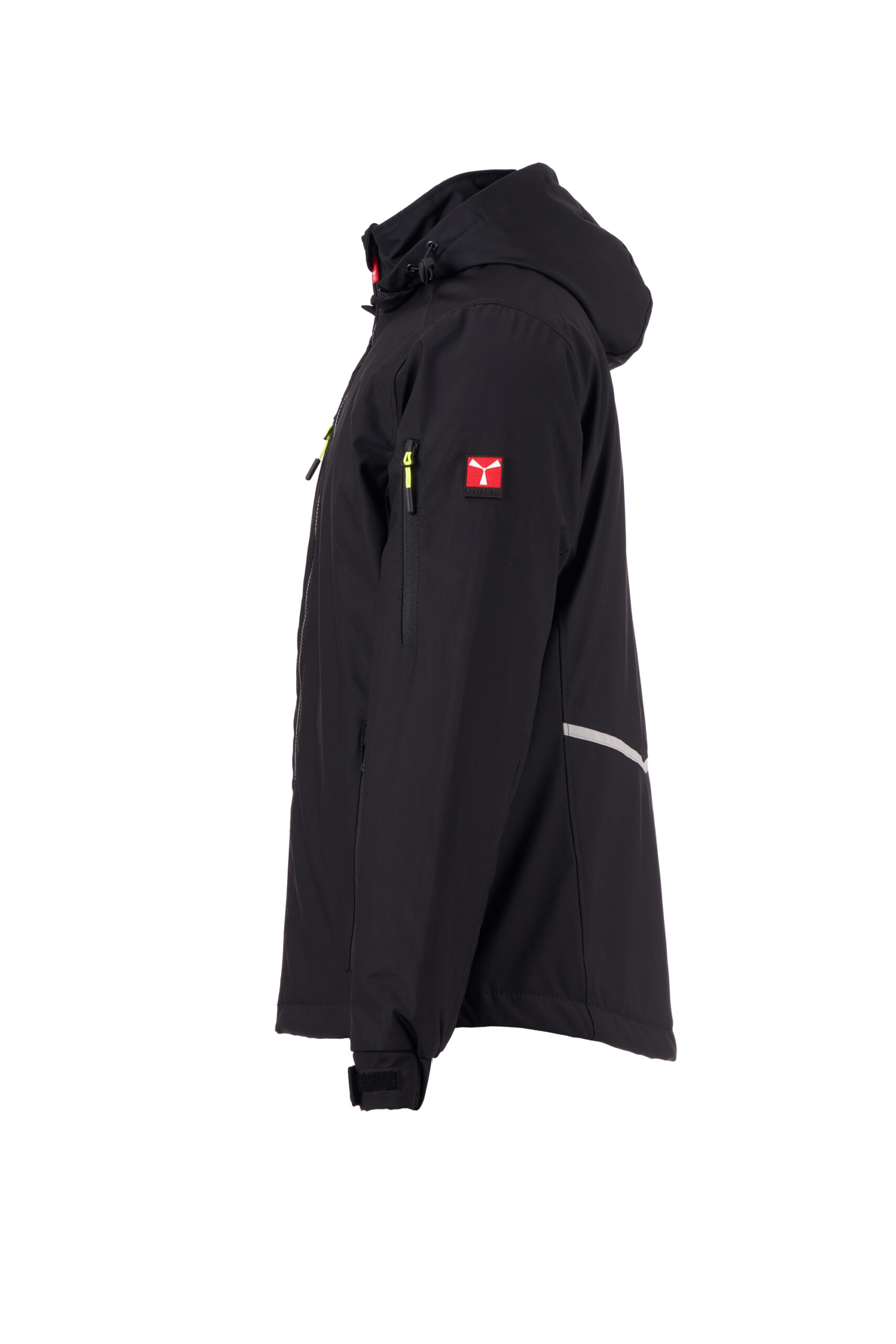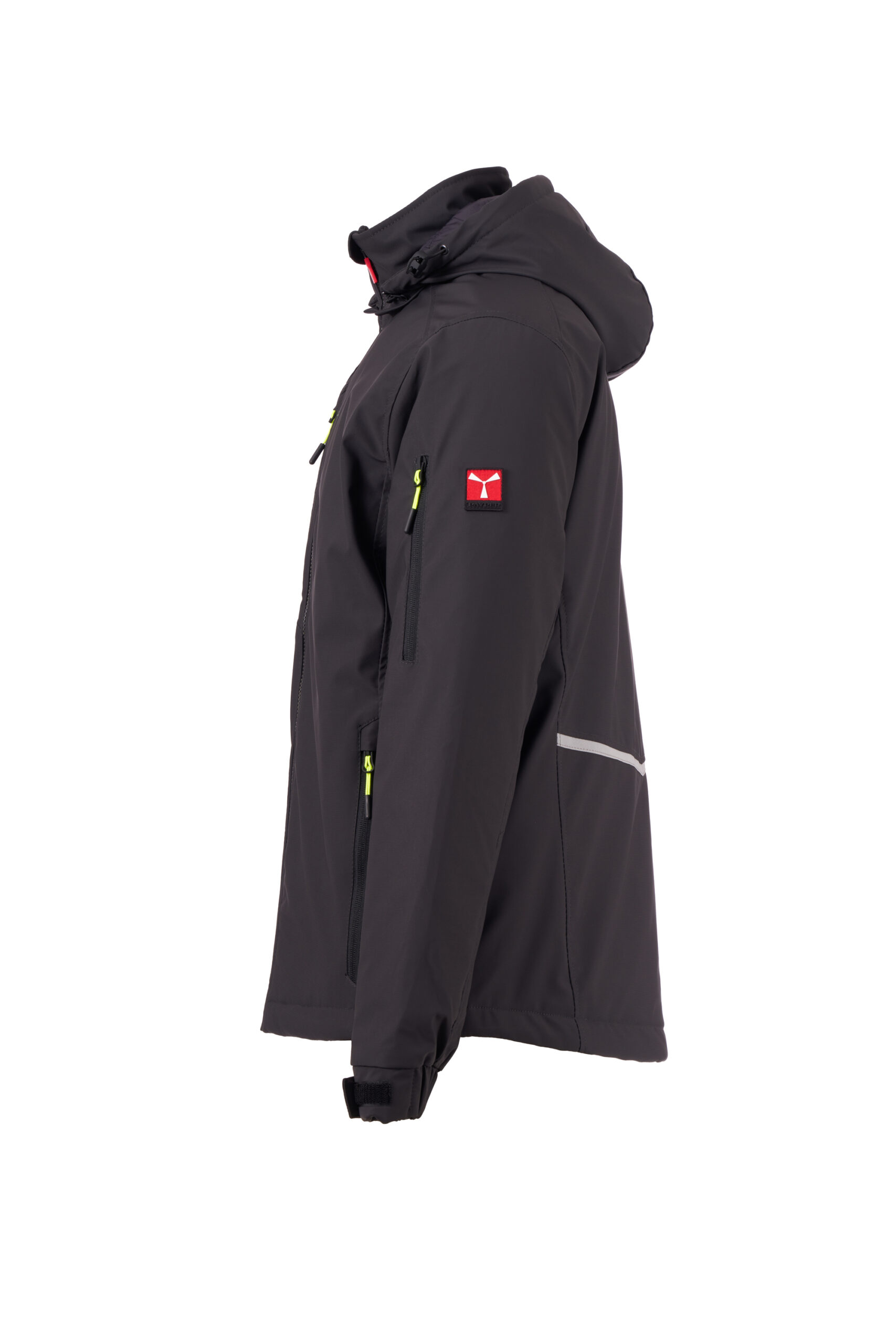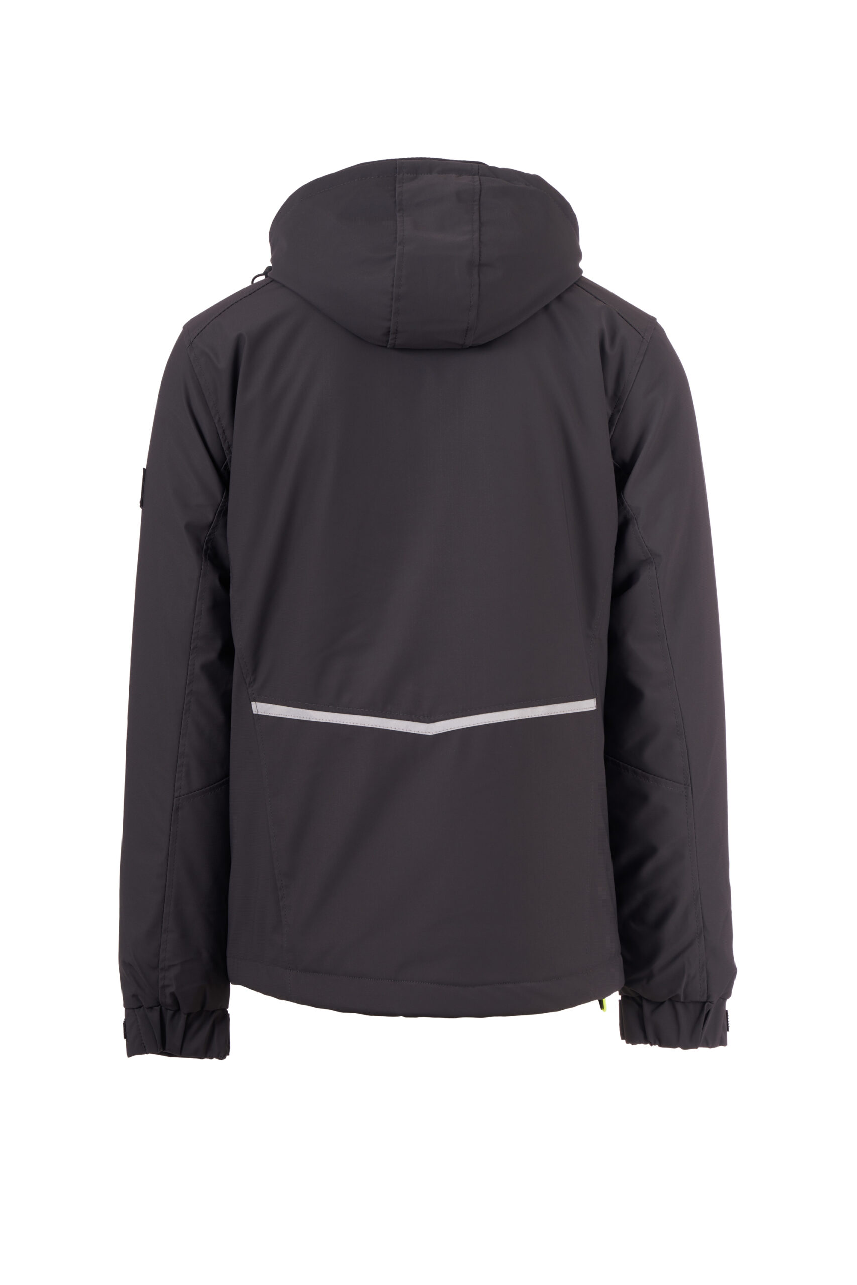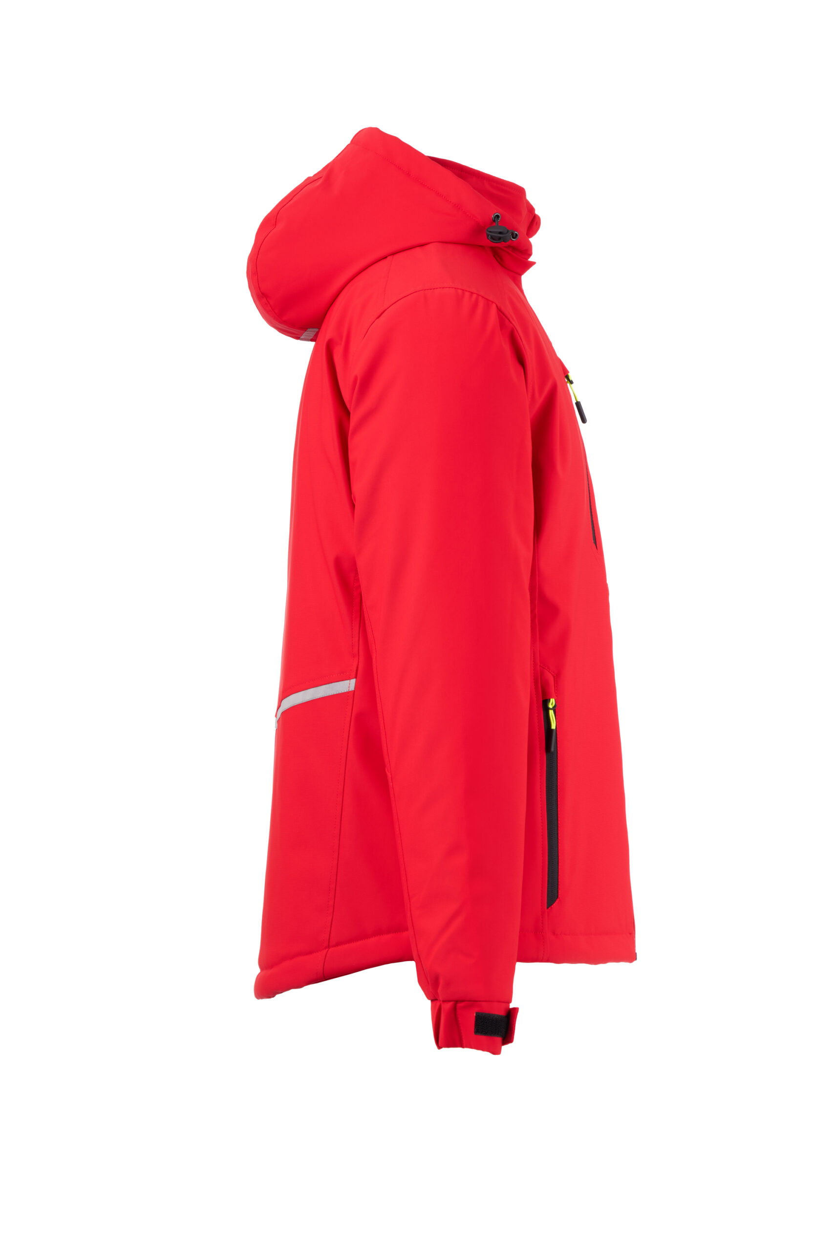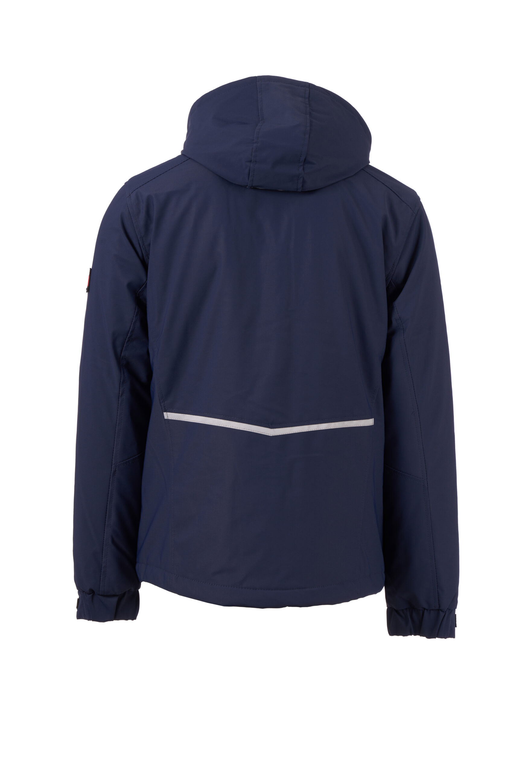 WP 8000 mm H₂O, MVP 5000 g/m² 24 h. Herren-Softshell, 3-lagig, mit mittelstarker Wattierung (140 g/m²), SBS-Reißverschluss mit „Semi-Auto-Lock“-Metallschieber und personalisiertem Schiebergriff. Abtrennbare Kapuze mit regulierbarem Kordelzug. Reflexstreifen im unteren Rückenbereich und auf der Rückseite der Kapuze. Elastische Ärmelbündchen mit Klettverschluss zur Weitenregulierung. 2 Seitentaschen mit Reißverschluss, 1 Brusttasche mit beschichtetem Reißverschluss und 1 Tasche mit Reißverschluss und integriertem Stifthalter auf dem linken Arm. Fluoreszierende Schiebergriffe. 1 Innentasche mit einfacher Paspel und Klettverschluss. Regulierbarer Saum mit personalisierten Stoppern.