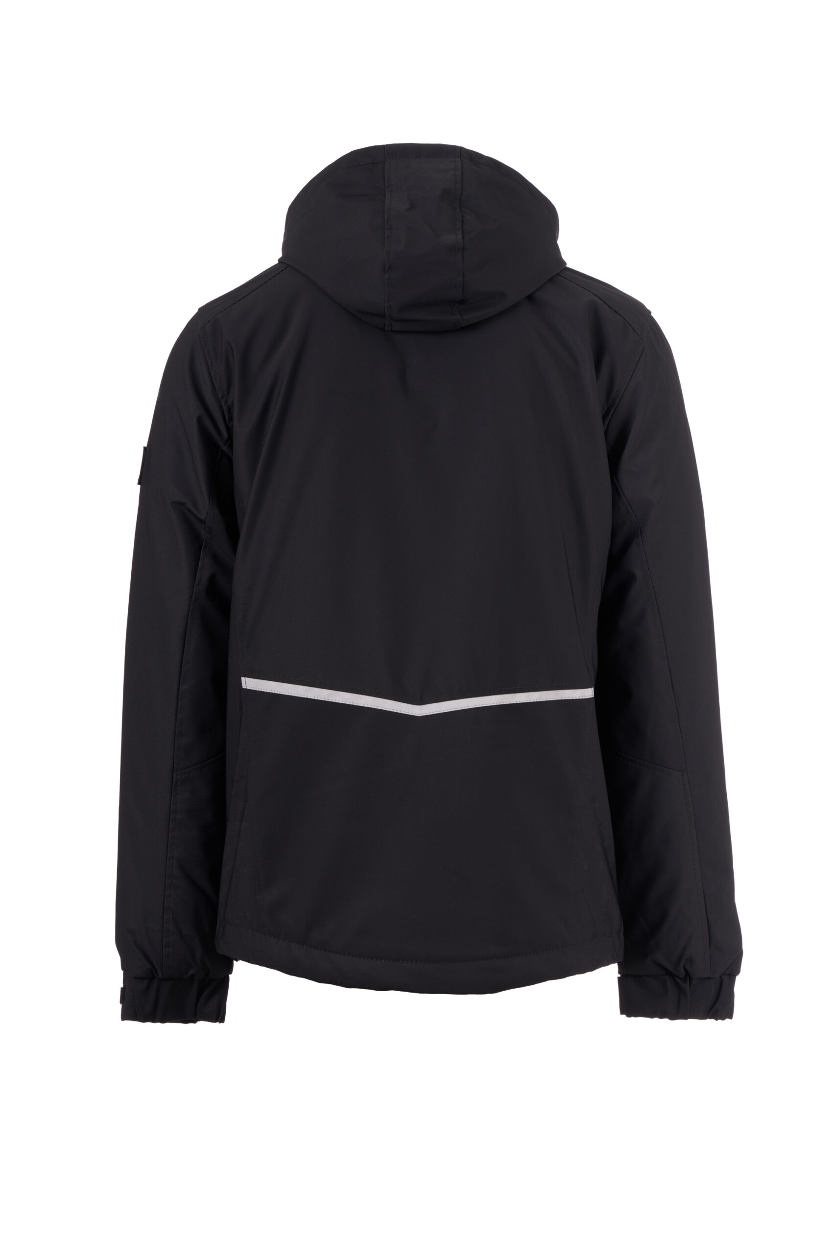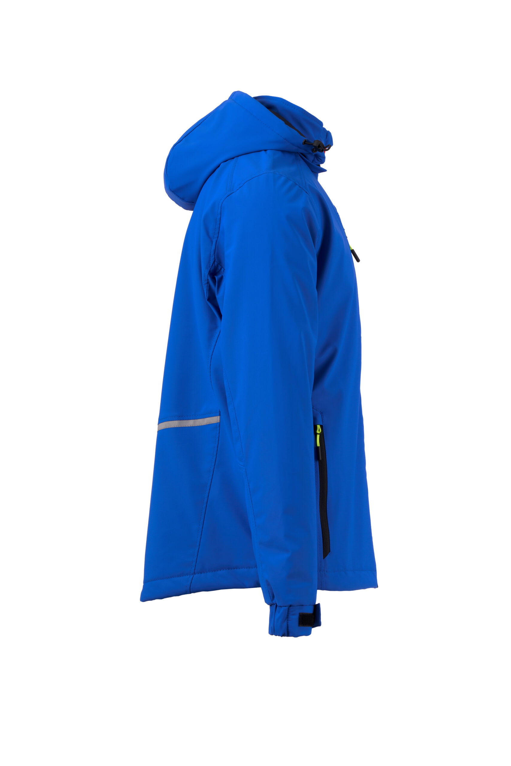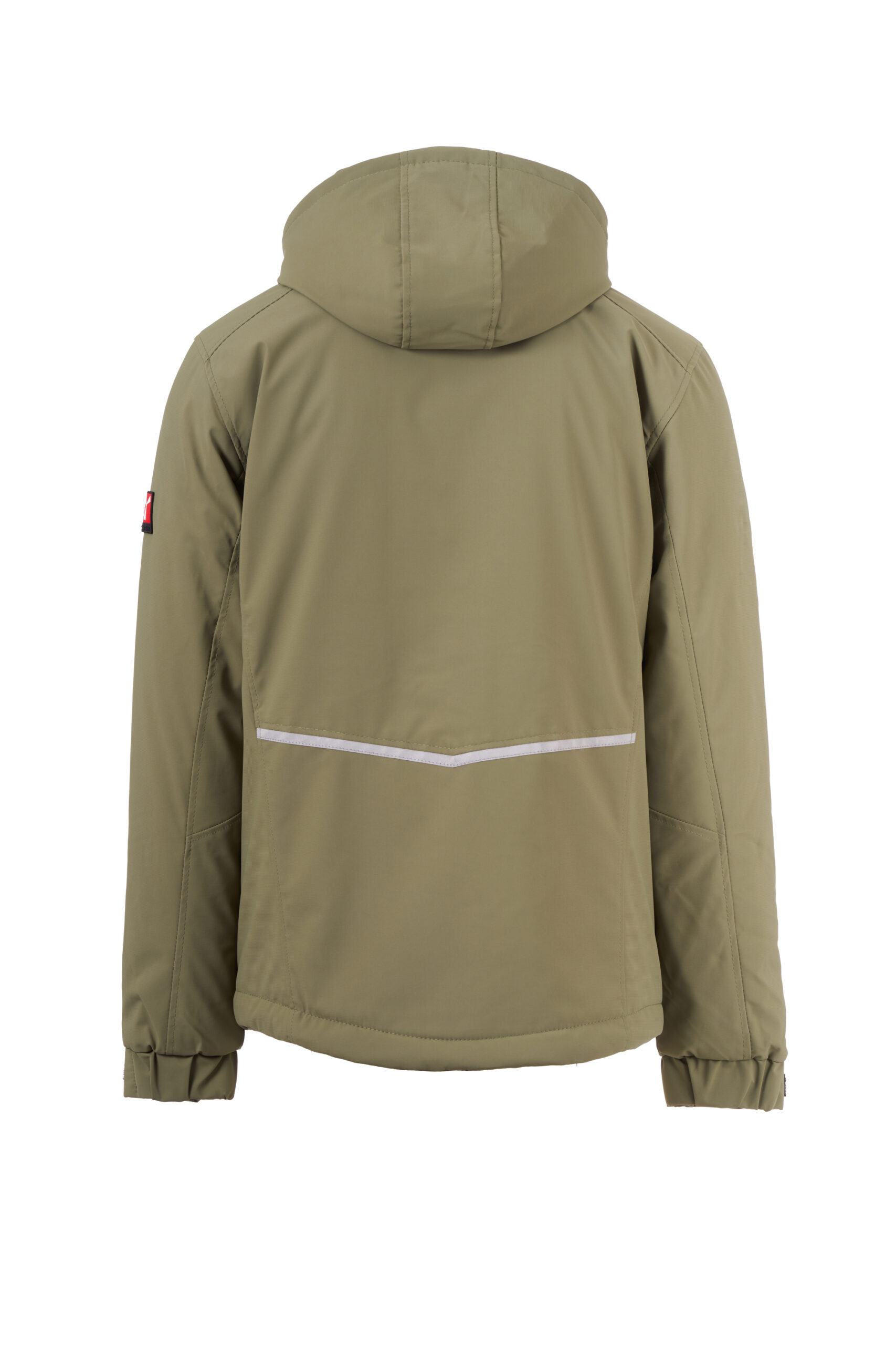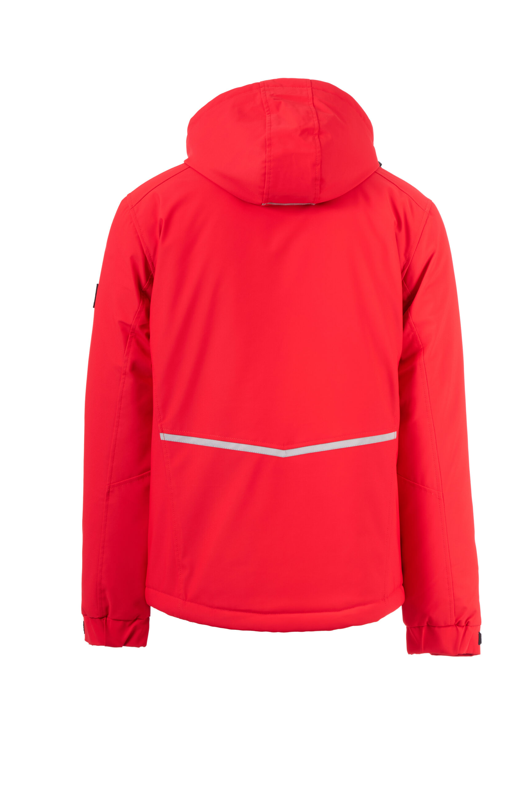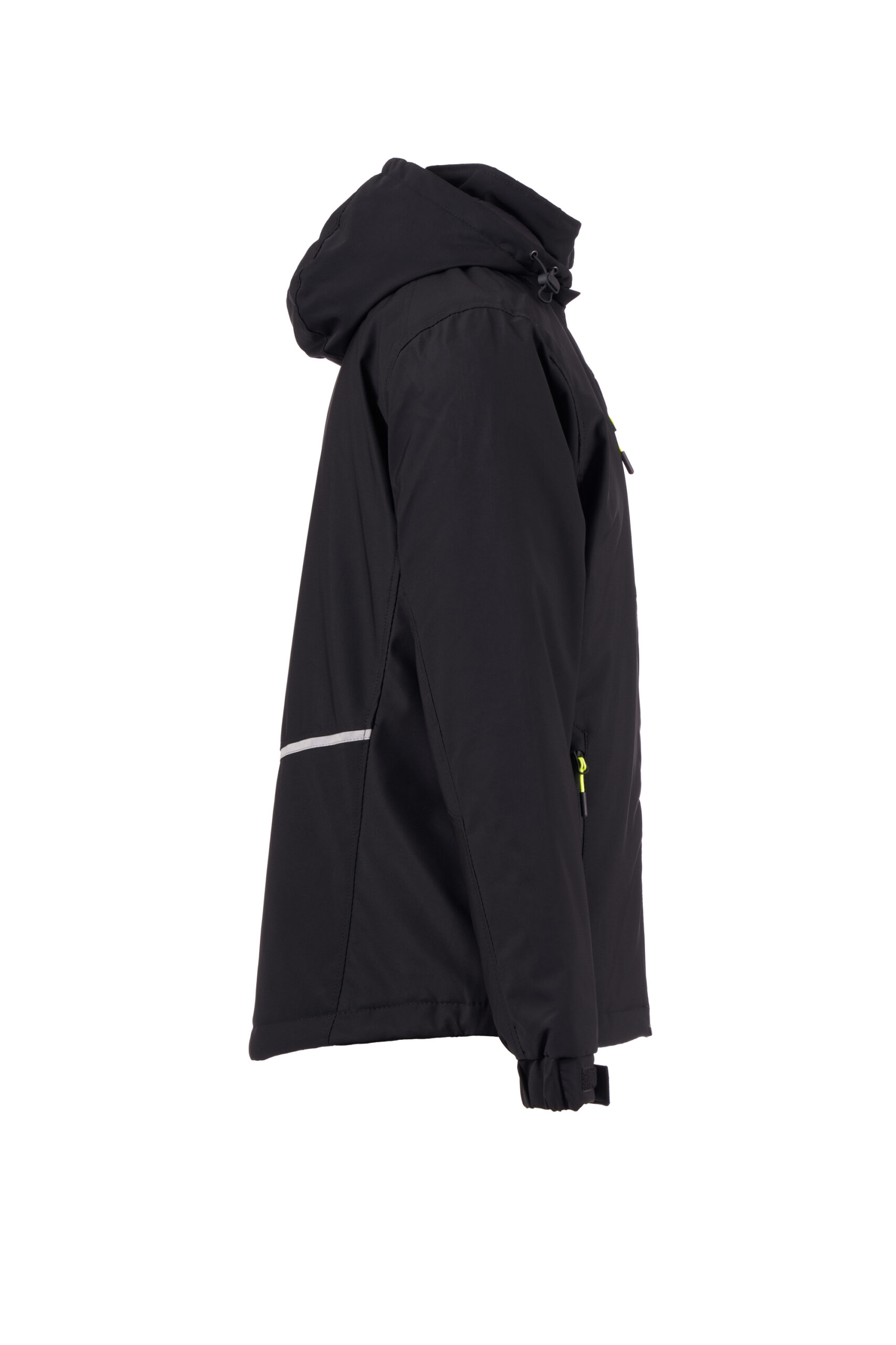 WP 8000 mm H₂O, MVP 5000 g/m² 24 h. Herren-Softshell, 3-lagig, mit mittelstarker Wattierung (140 g/m²), SBS-Reißverschluss mit „Semi-Auto-Lock“-Metallschieber und personalisiertem Schiebergriff. Abtrennbare Kapuze mit regulierbarem Kordelzug. Reflexstreifen im unteren Rückenbereich und auf der Rückseite der Kapuze. Elastische Ärmelbündchen mit Klettverschluss zur Weitenregulierung. 2 Seitentaschen mit Reißverschluss, 1 Brusttasche mit beschichtetem Reißverschluss und 1 Tasche mit Reißverschluss und integriertem Stifthalter auf dem linken Arm. Fluoreszierende Schiebergriffe. 1 Innentasche mit einfacher Paspel und Klettverschluss. Regulierbarer Saum mit personalisierten Stoppern.