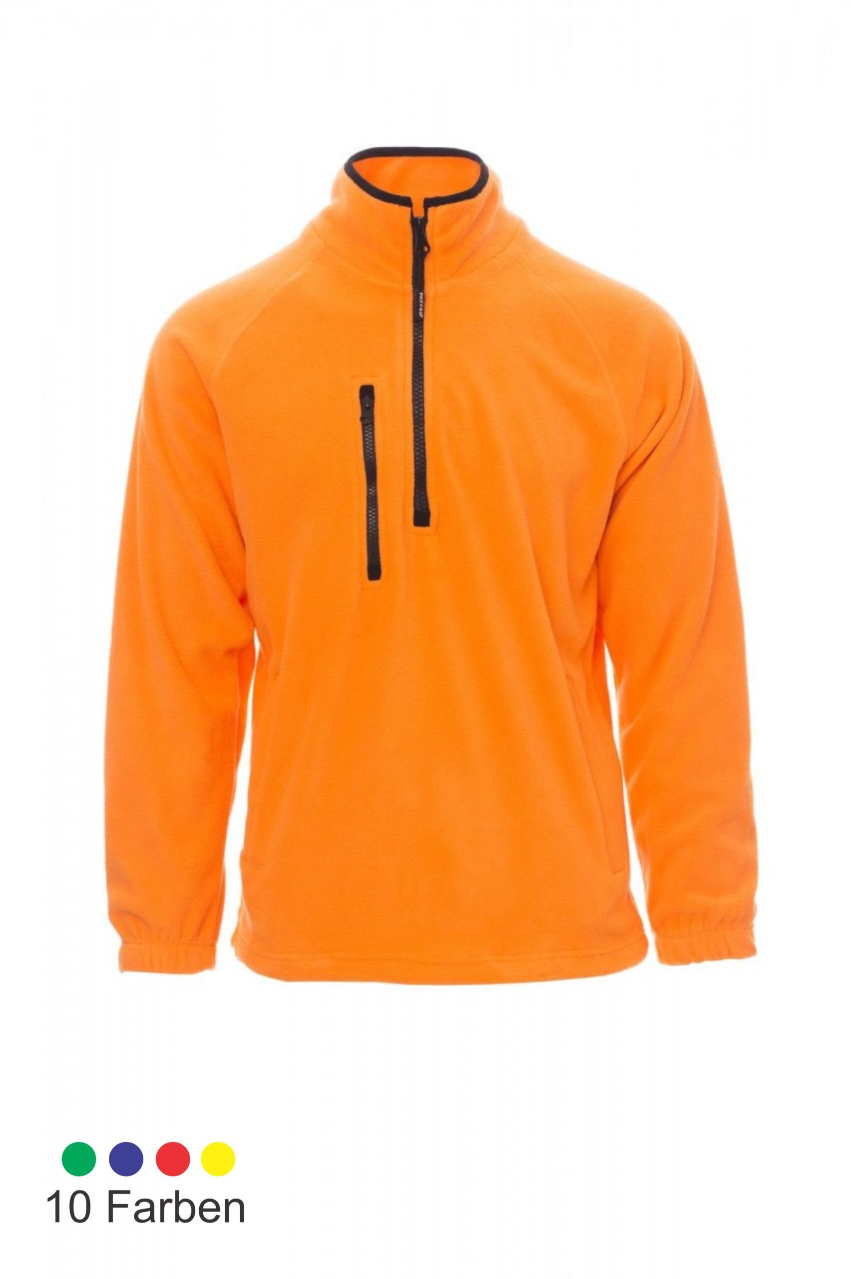 Fleecepullover mit kurzem, schwarzem 8 mm Reißverschluss aus Kunststoff, Raglanärmeln, regulierbarem Kordelzug in der Taille, elastischen Ärmelbündchen, zwei Taschen mit verdecktem Reißverschluss, einer Vordertasche mit Reißverschluss, Kragen mit verstärktem Rand in Kontrastfarbe, verstärkten Nähten.
