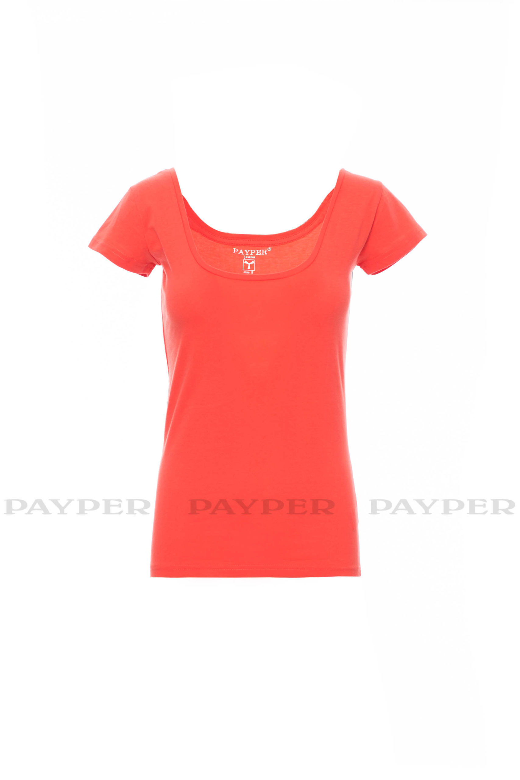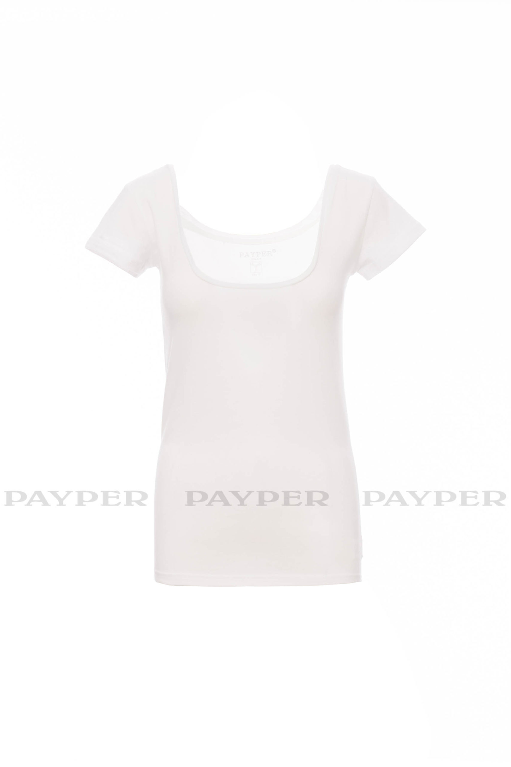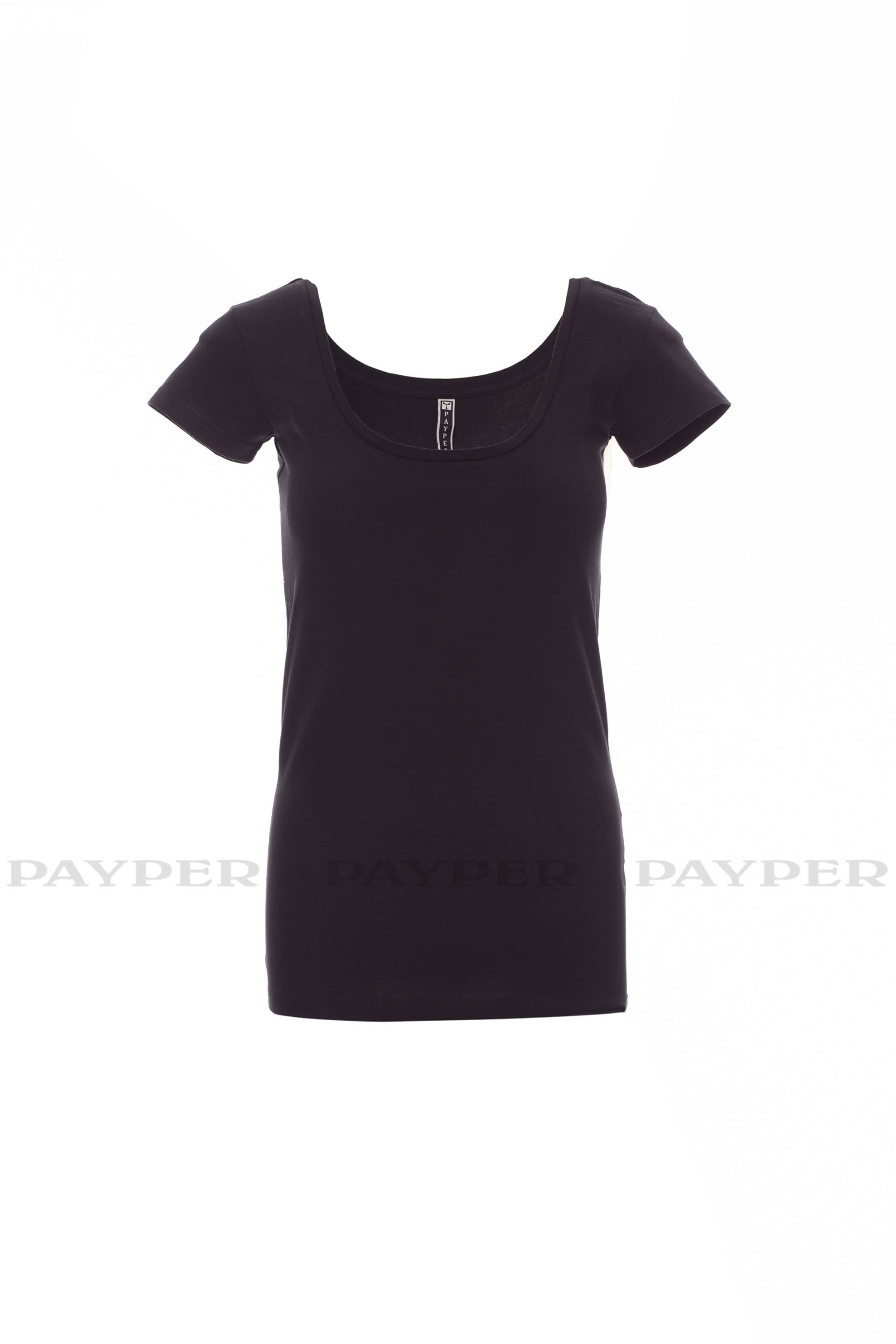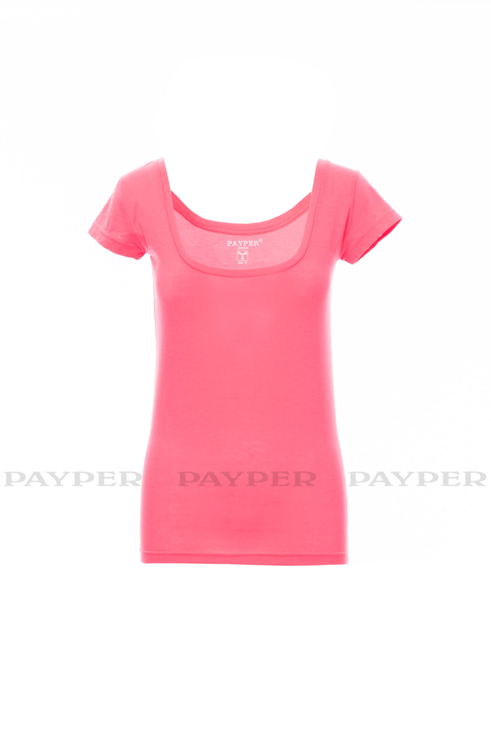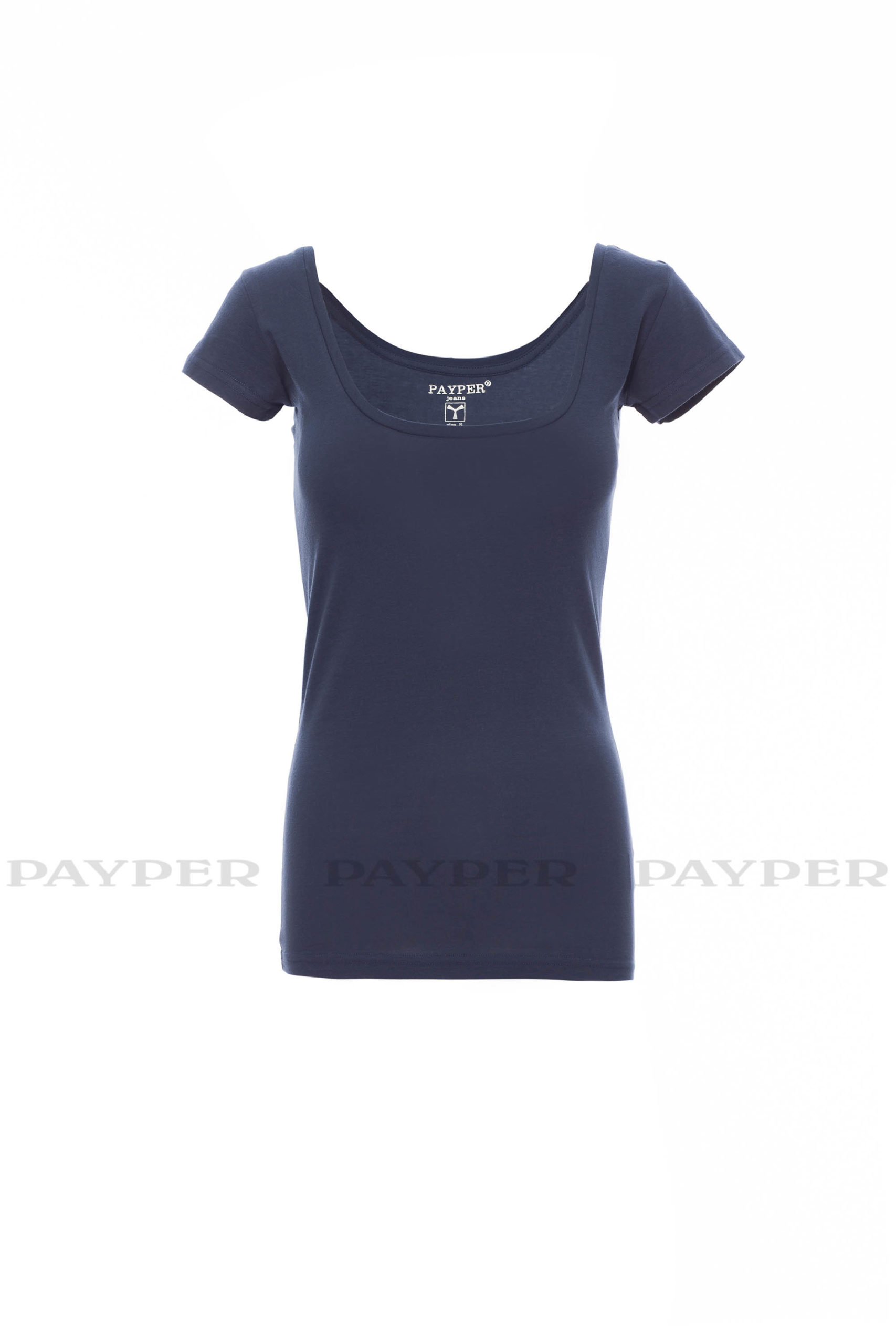 Tailliertes Damen-T-Shirt, kurzärmelig, mit tiefem, rechteckigem Ausschnitt, schmalem 1 cm Halsabschluss, Seitennaht