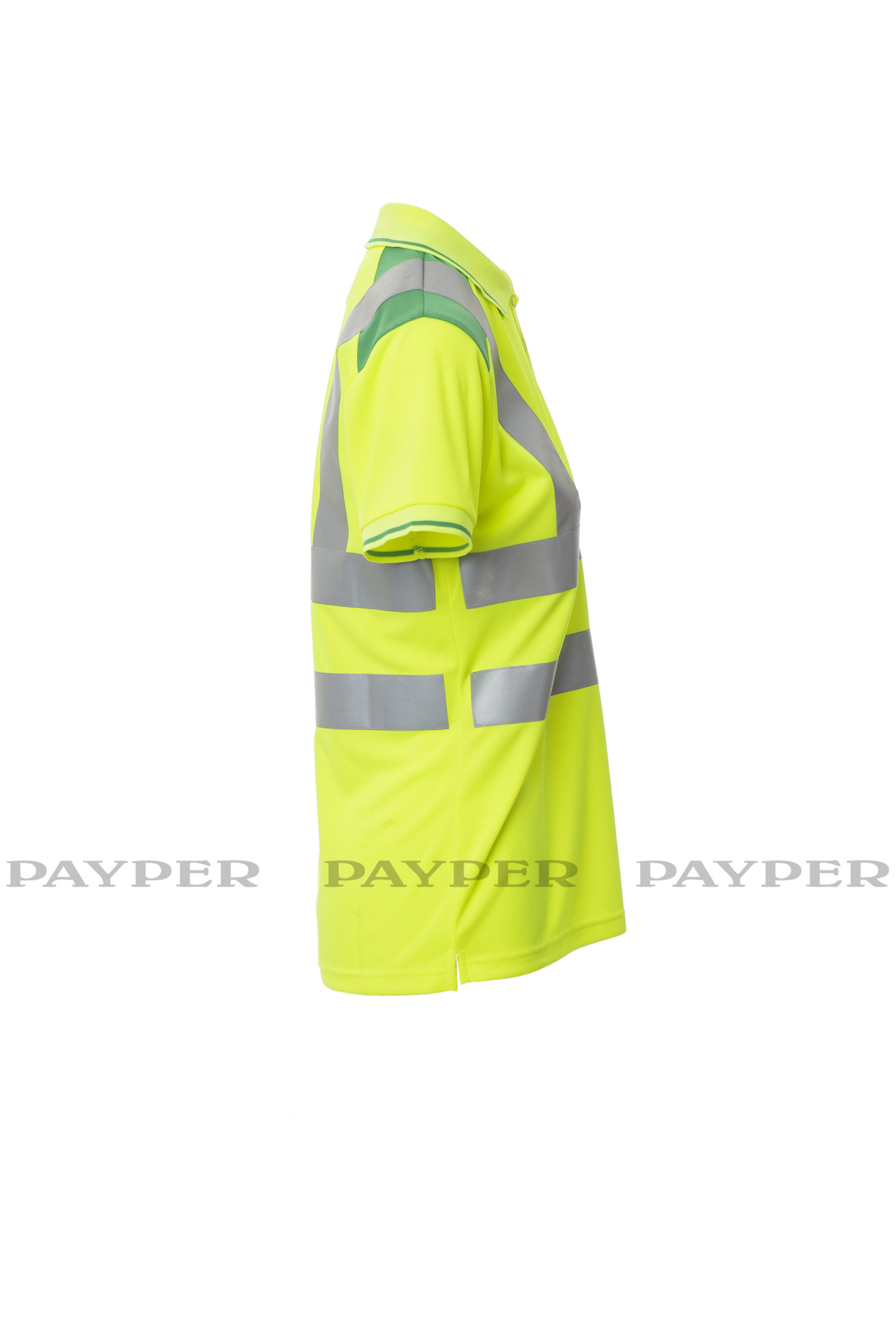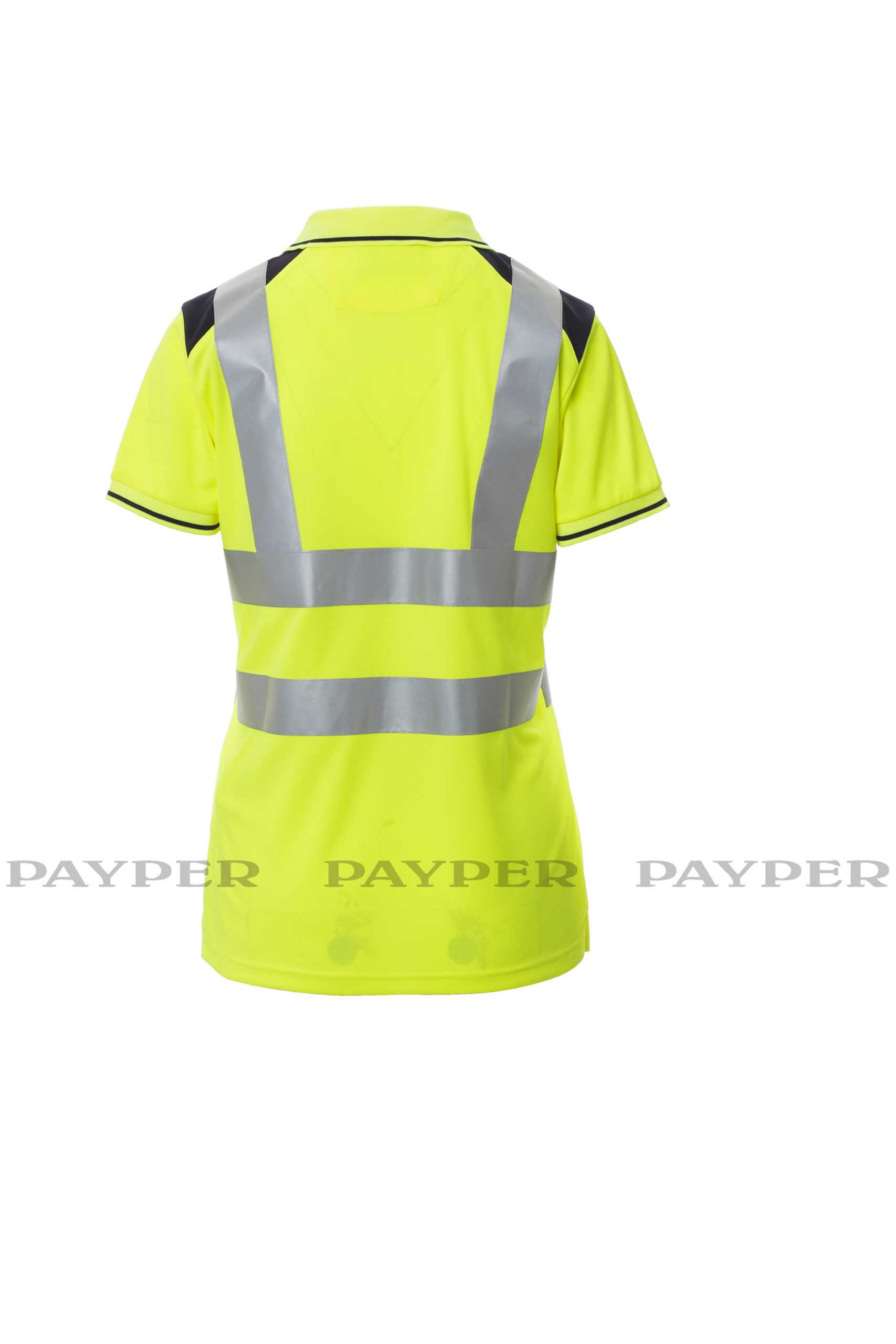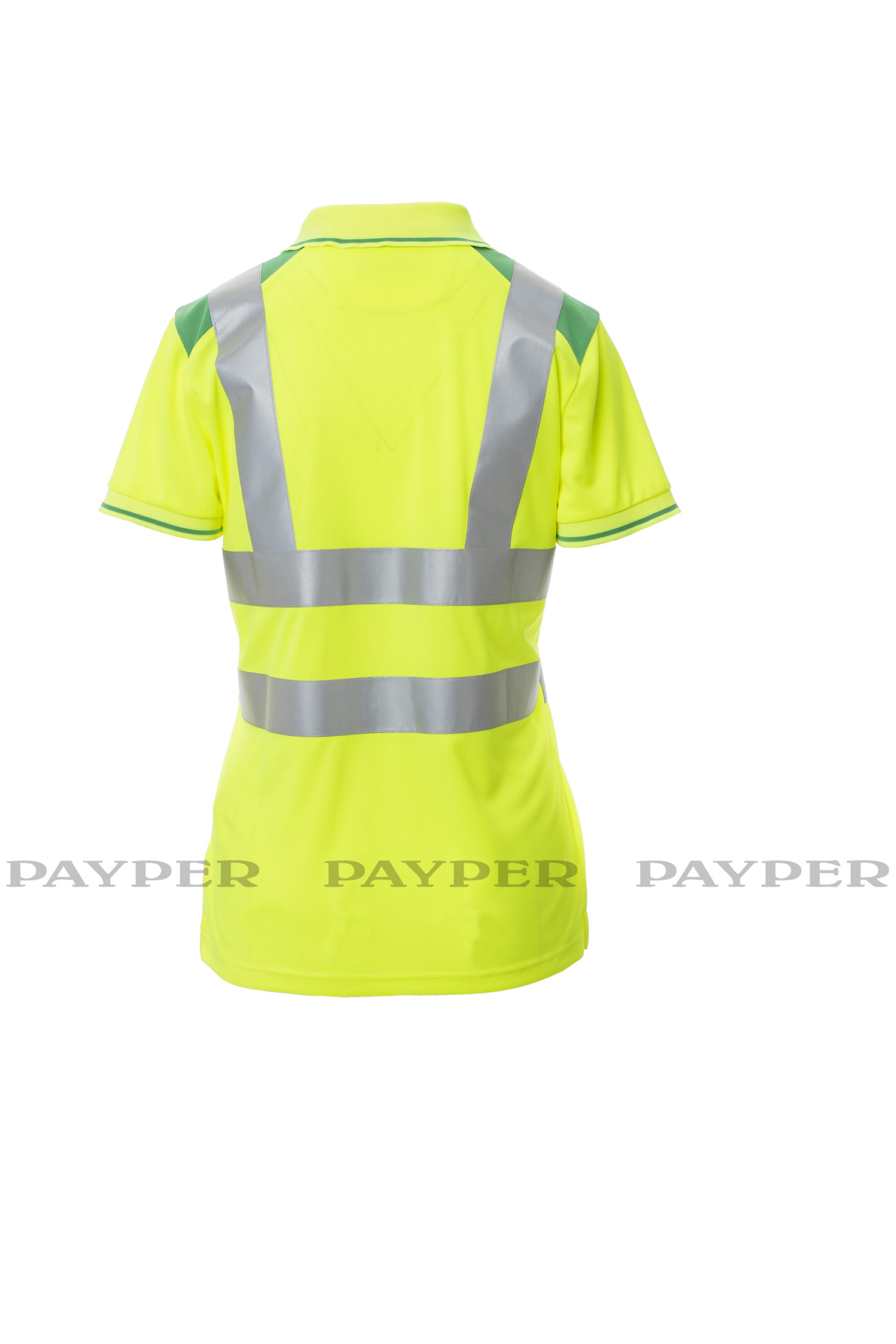 Zweifarbiges Damen-Warnschutz-Polo-Shirt, kurzärmelig, Reflexstreifen, 4 Knöpfe Ton-in-Ton mit Perlenoptik, Kragen und Ärmelrand aus Feinripp mit feinem Profil in Kontrastfarbe, Seitenschlitze, Nackenband.