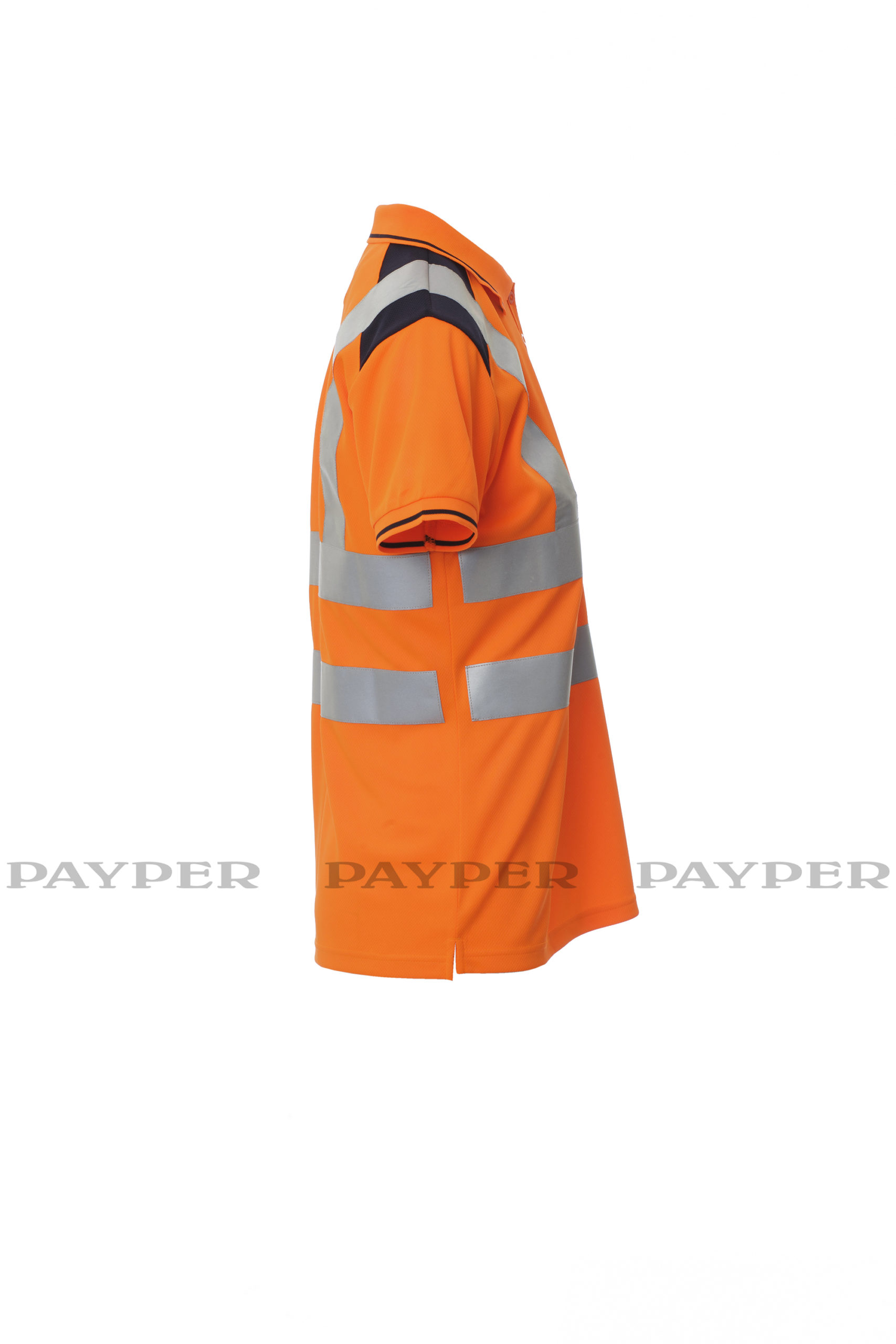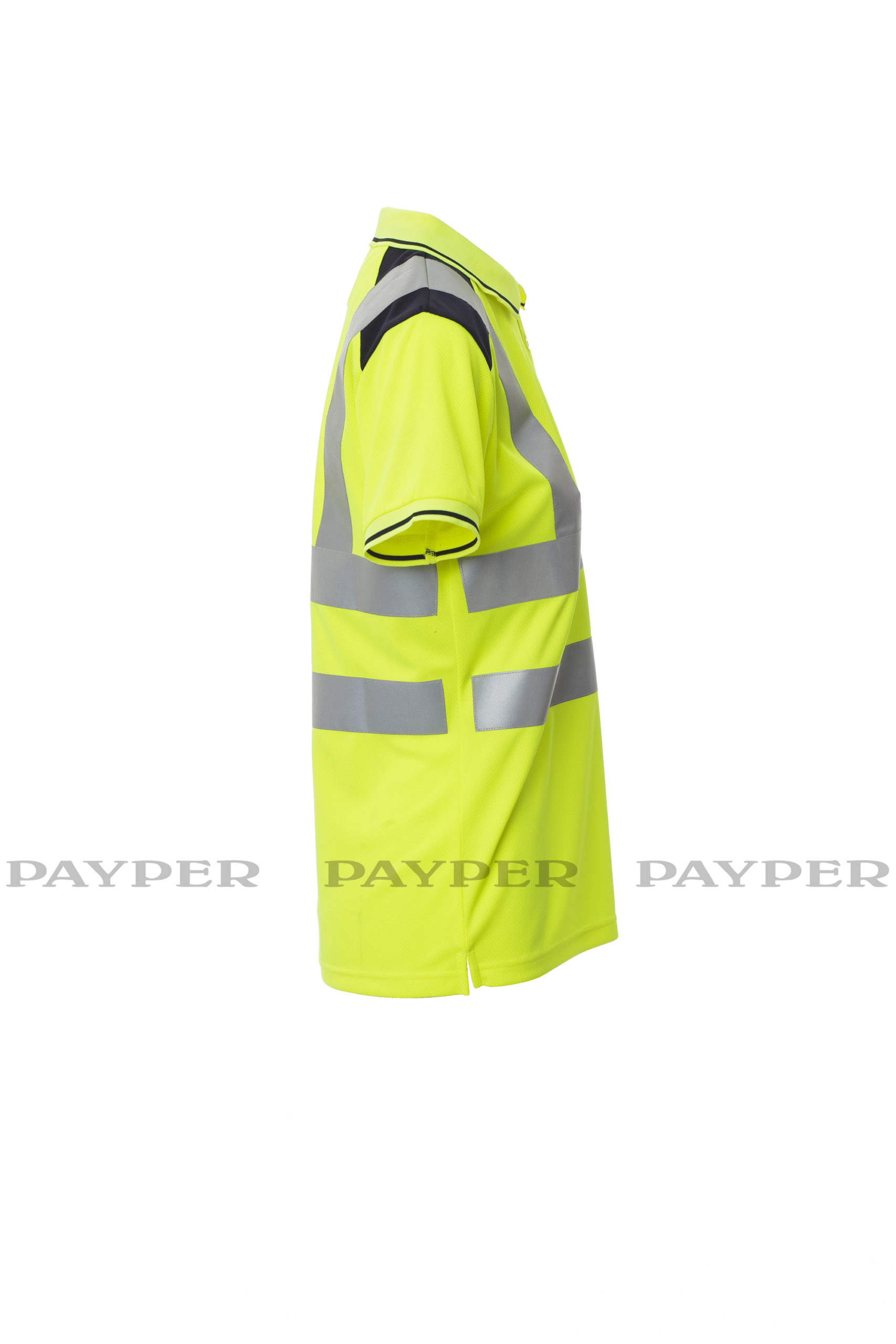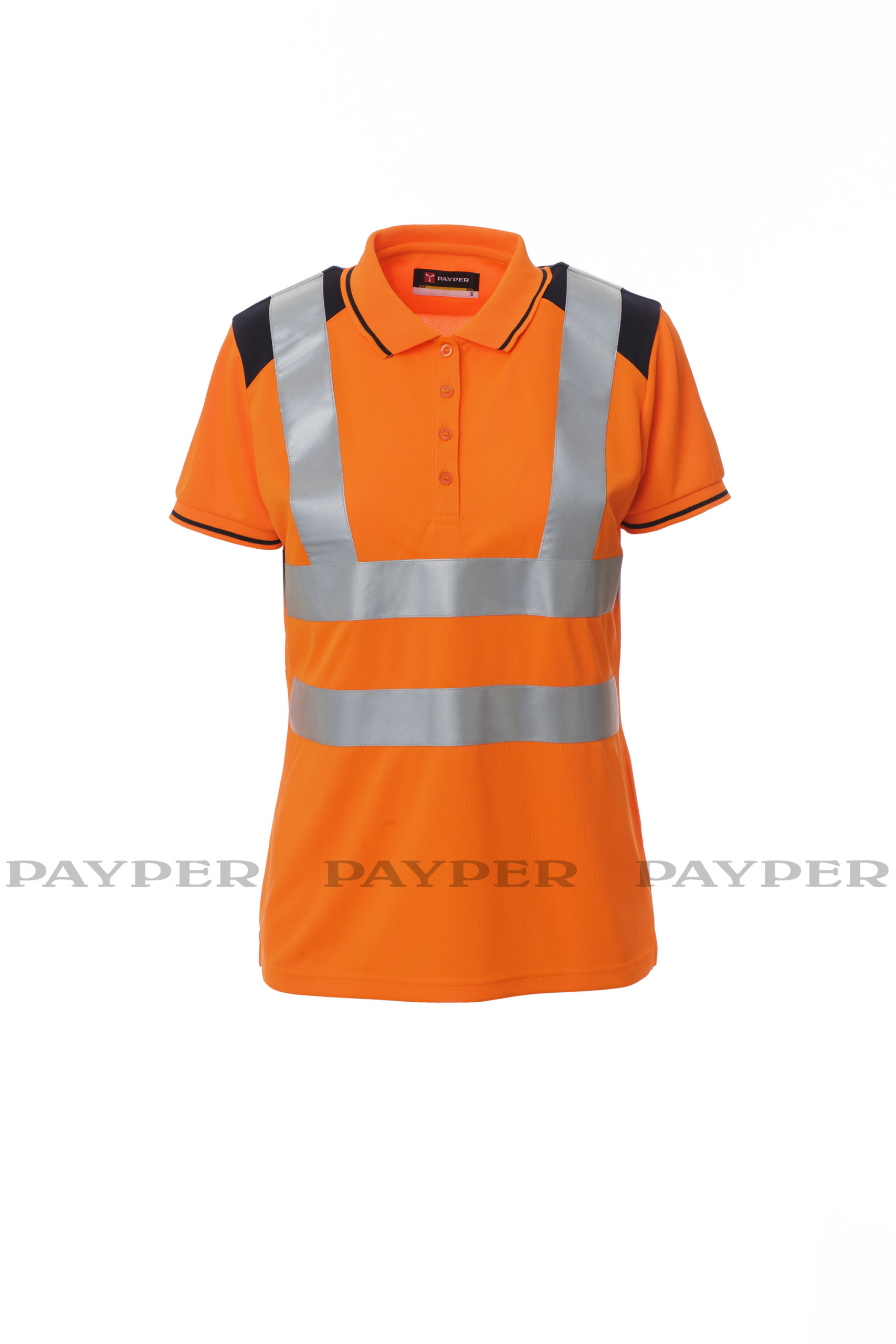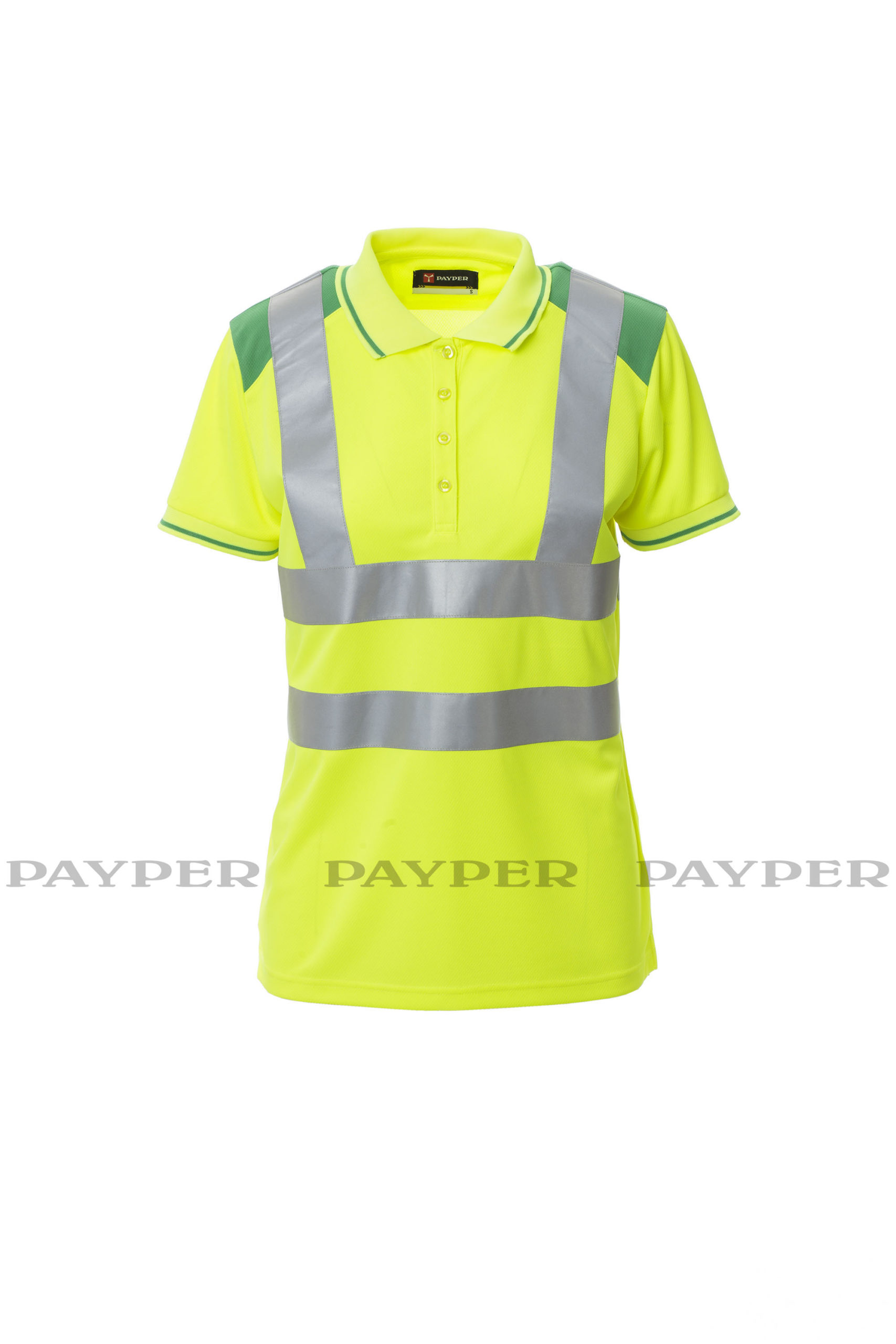 Zweifarbiges Damen-Warnschutz-Polo-Shirt, kurzärmelig, Reflexstreifen, 4 Knöpfe Ton-in-Ton mit Perlenoptik, Kragen und Ärmelrand aus Feinripp mit feinem Profil in Kontrastfarbe, Seitenschlitze, Nackenband.