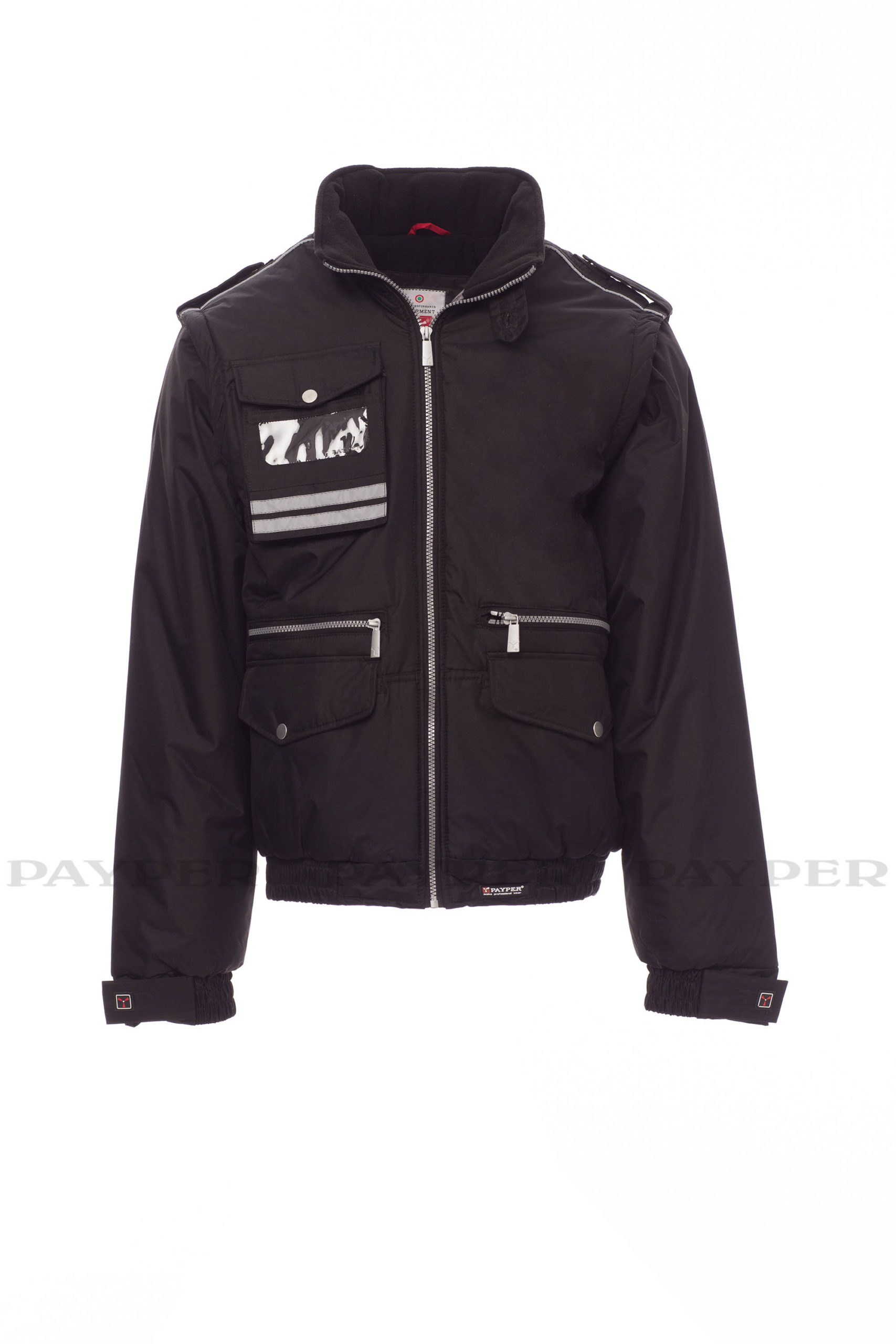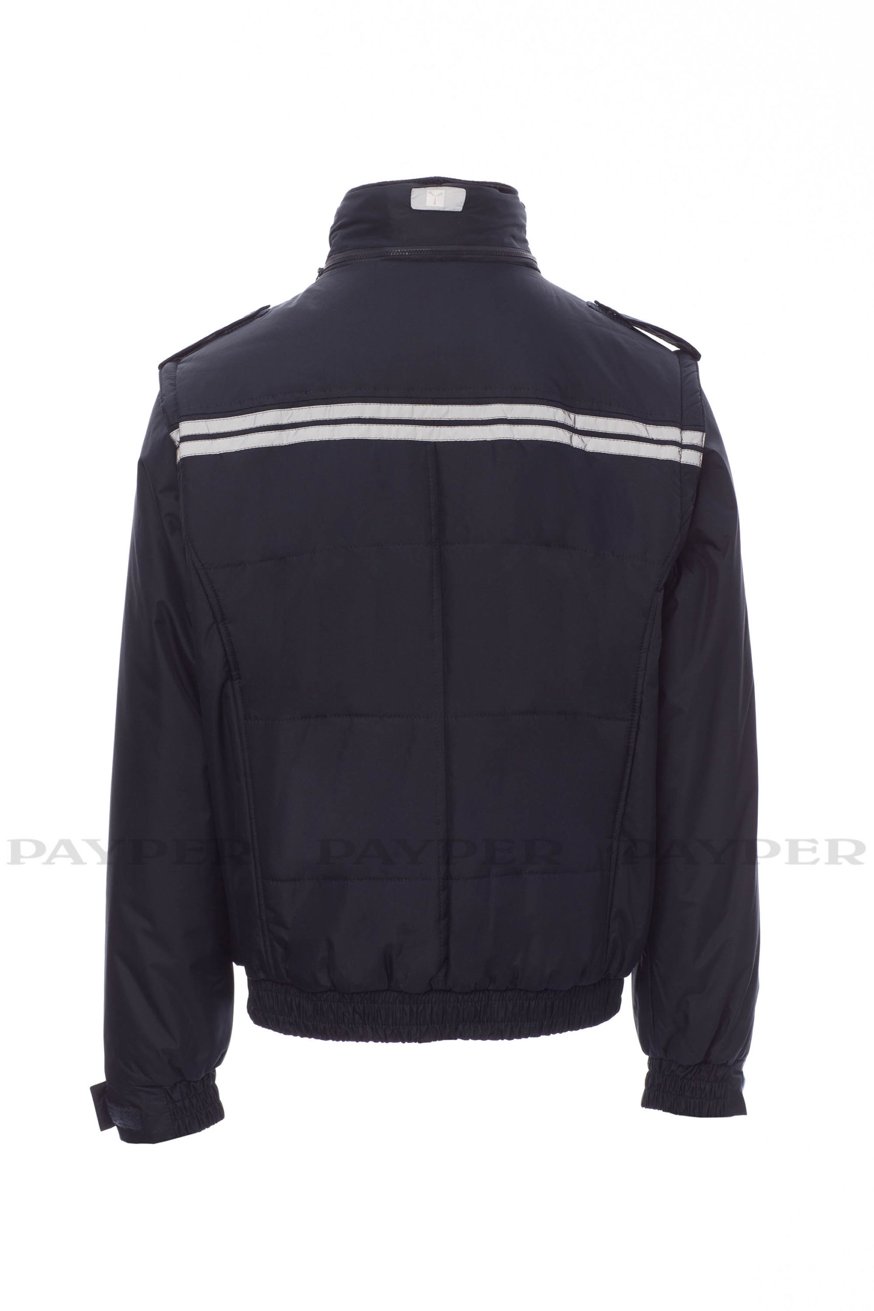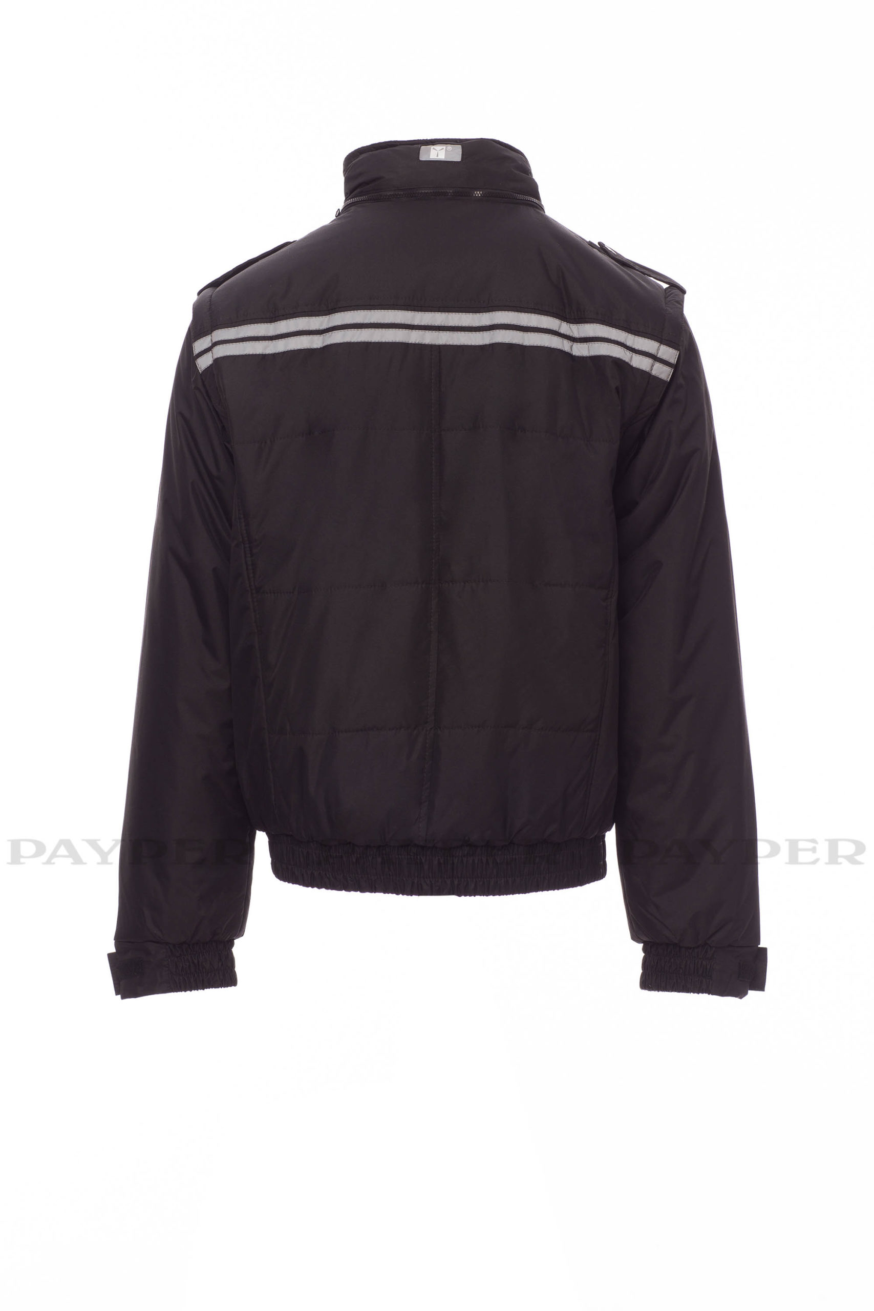 Saloppe Herren-Jacke mit abtrennbaren Ärmeln, schlank geschnitten, Reißverschluss aus Kunststoff mit Metallschieber, im Kragen einrollbarer Kapuze, elastischer Taille, regulierbaren Ärmelbündchen, Schulterklappen und Kragenverschluss, zwei Taschen mit LOCK SYSTEM, zwei Taschen mit Reißverschluss, einem nach innen wendbaren Ausweisfach, Reflex-Paspelierung an den Schultern und doppelten Reflexstreifen auf der Brusttasche und auf dem Rücken. Innenseite: wattiert, silberfarbenes High-Density-Futter, Rückenpartie aus Mikrofleece, Fleecekragen, eine Tasche.