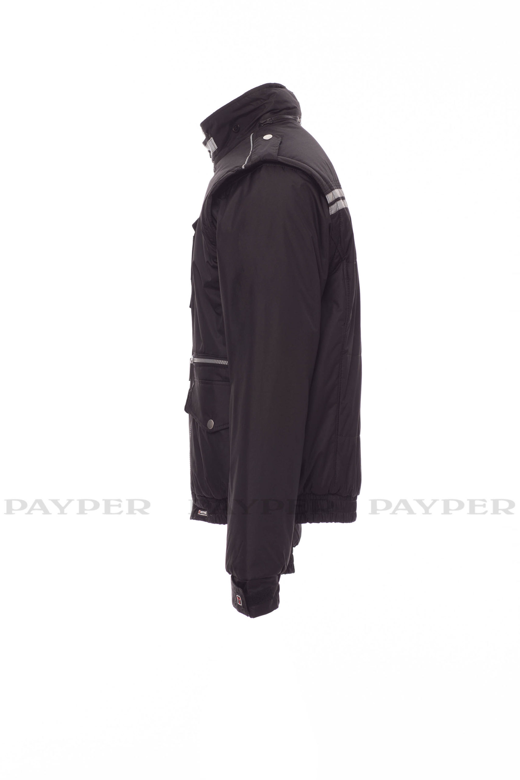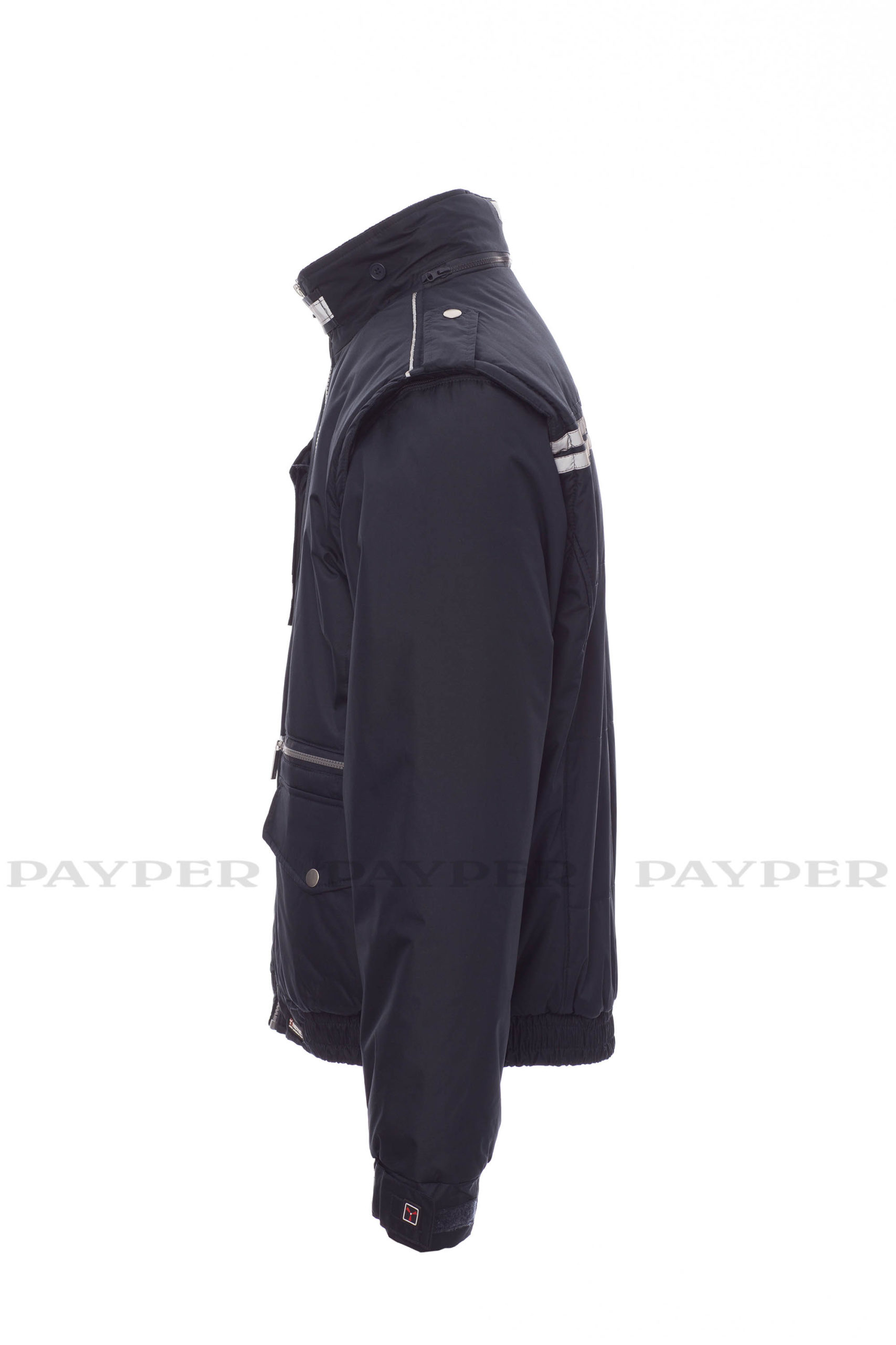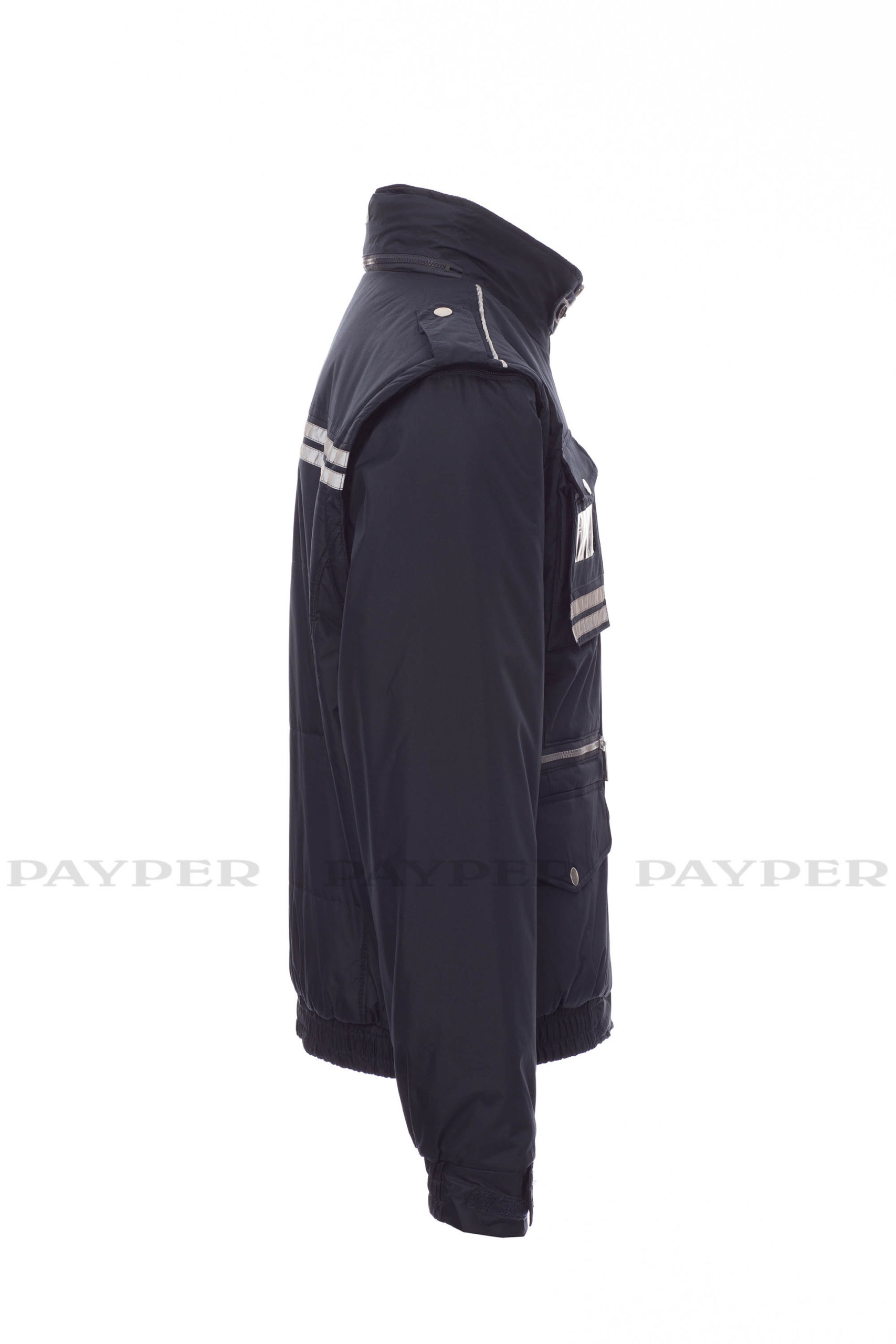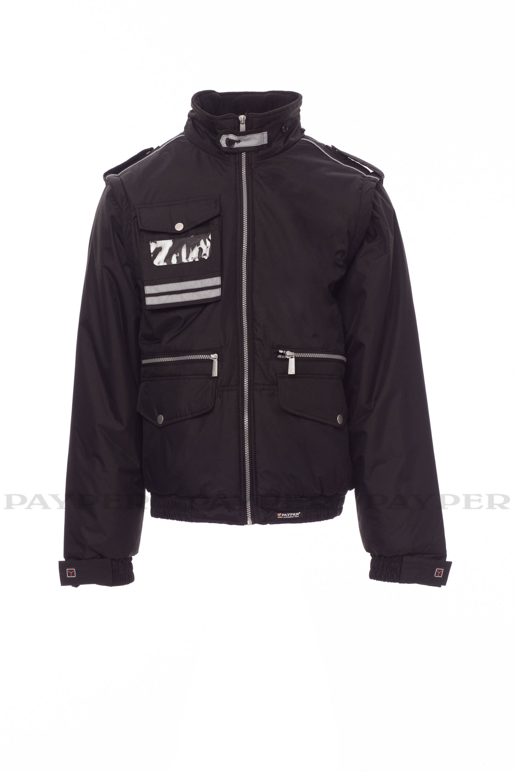 Saloppe Herren-Jacke mit abtrennbaren Ärmeln, schlank geschnitten, Reißverschluss aus Kunststoff mit Metallschieber, im Kragen einrollbarer Kapuze, elastischer Taille, regulierbaren Ärmelbündchen, Schulterklappen und Kragenverschluss, zwei Taschen mit LOCK SYSTEM, zwei Taschen mit Reißverschluss, einem nach innen wendbaren Ausweisfach, Reflex-Paspelierung an den Schultern und doppelten Reflexstreifen auf der Brusttasche und auf dem Rücken. Innenseite: wattiert, silberfarbenes High-Density-Futter, Rückenpartie aus Mikrofleece, Fleecekragen, eine Tasche.