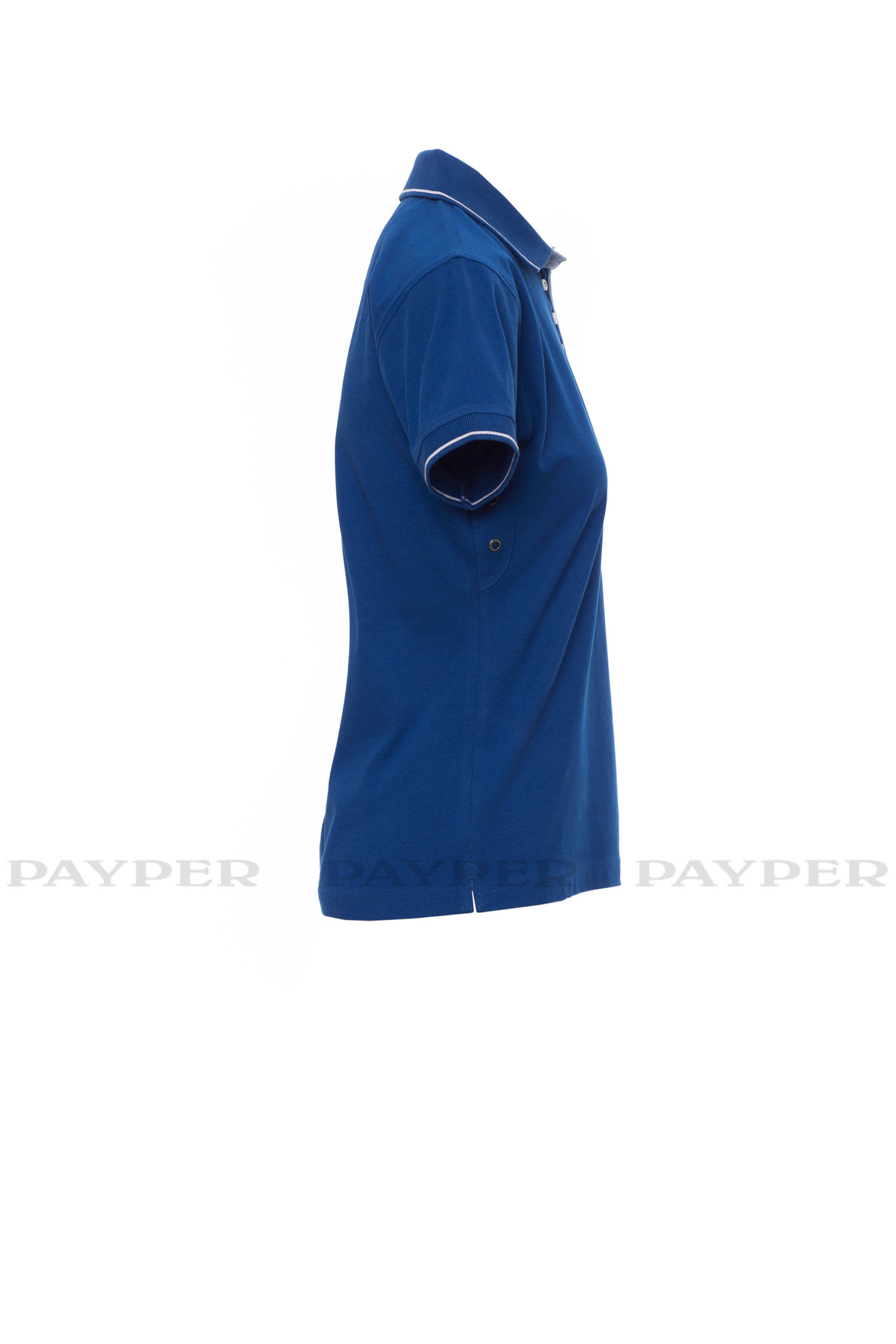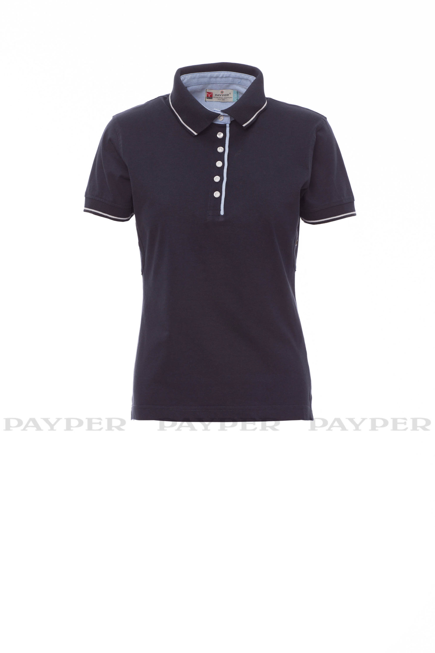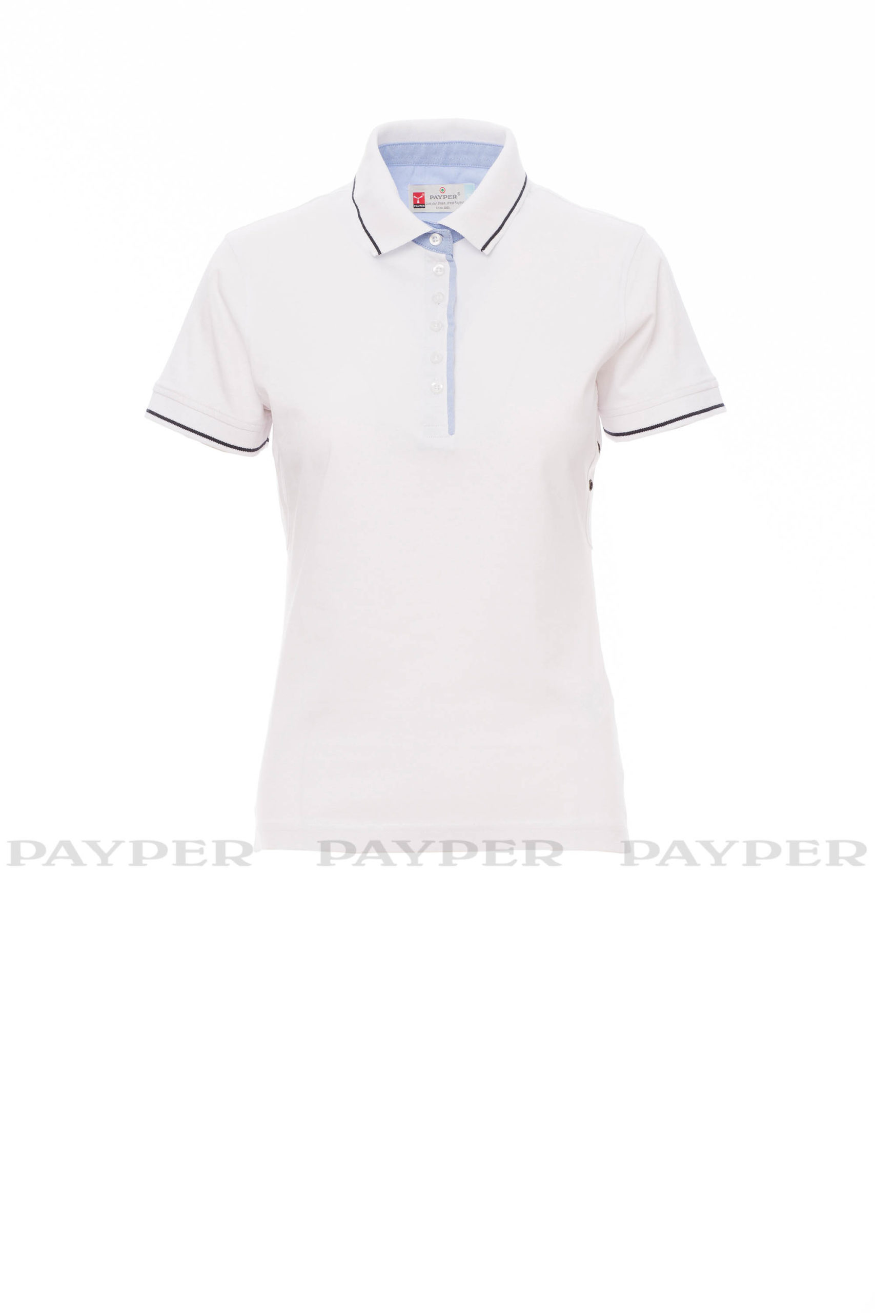 Tailliertes Damen-Poloshirt, kurzärmelig, mit sechs weißen Knöpfen, Innenseite des Kragens, der Knopfleiste und Seitenschlitze in Oxford-Hellblau, Kragen und Ärmelrand aus Rippstrick mit feiner kontrastfarbiger Einfassung, Lüftungsösen unter den Achseln, Seitenschlitzen mit Verstärkungsnaht, seitlichem Verstärkungsband, Stretchnähten, Nackensattel