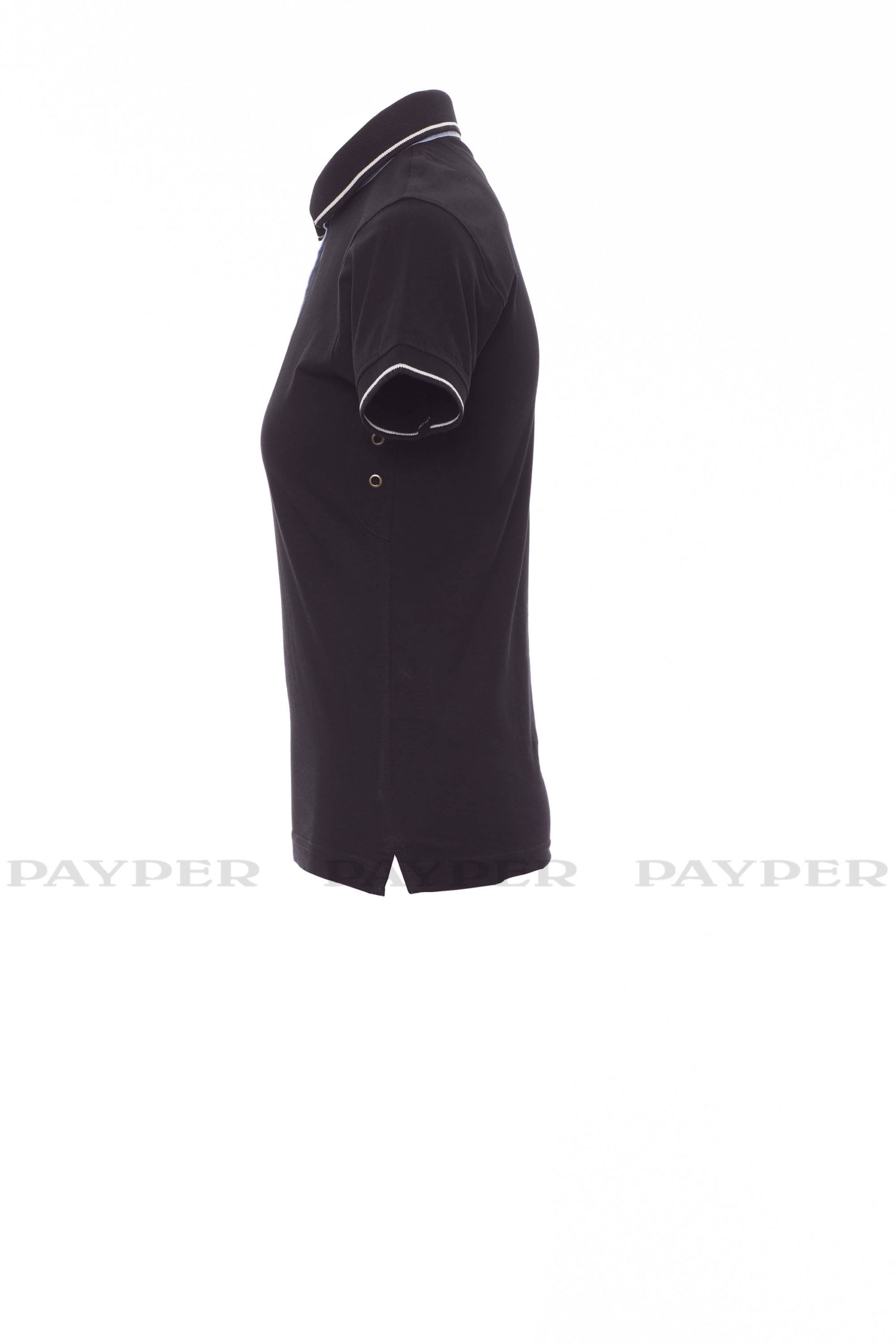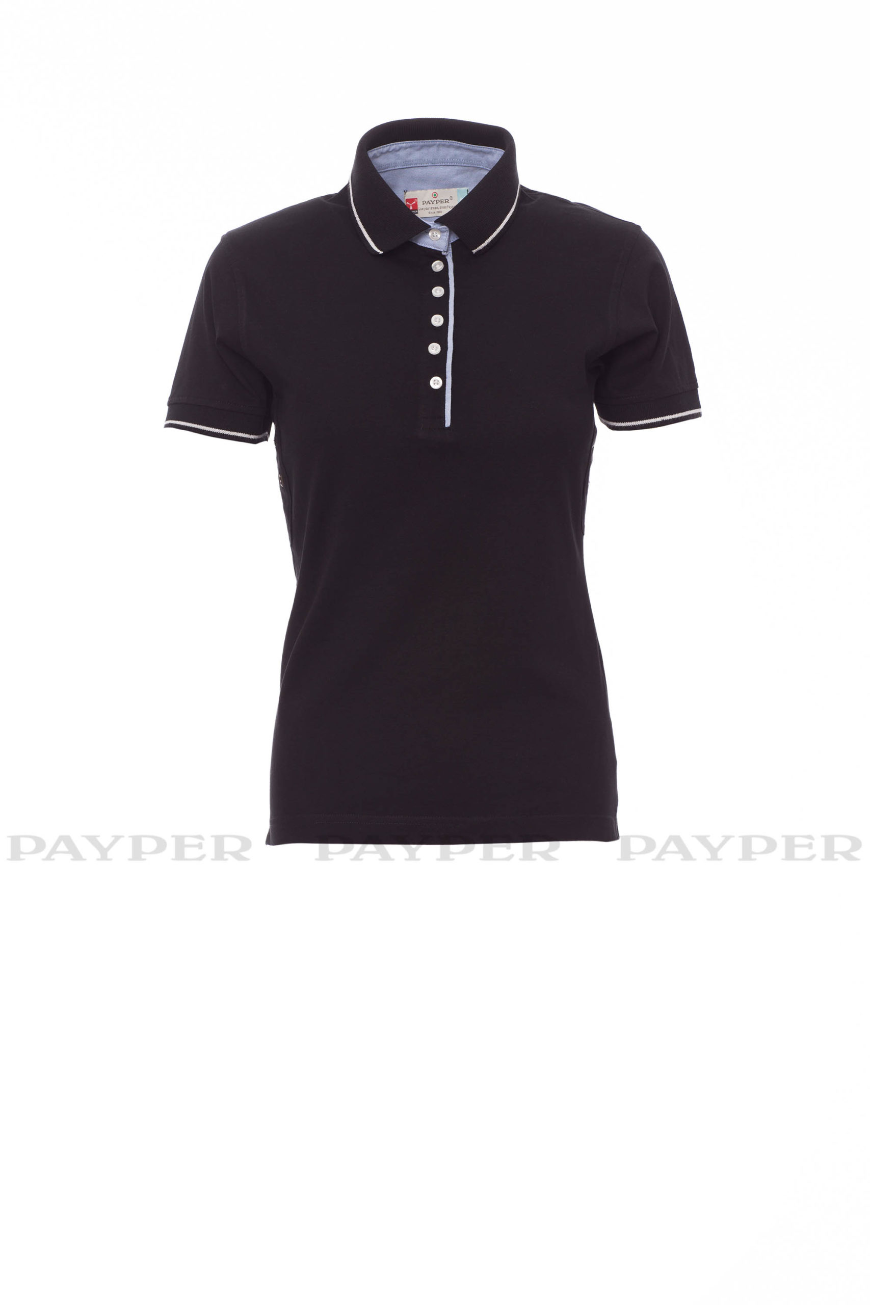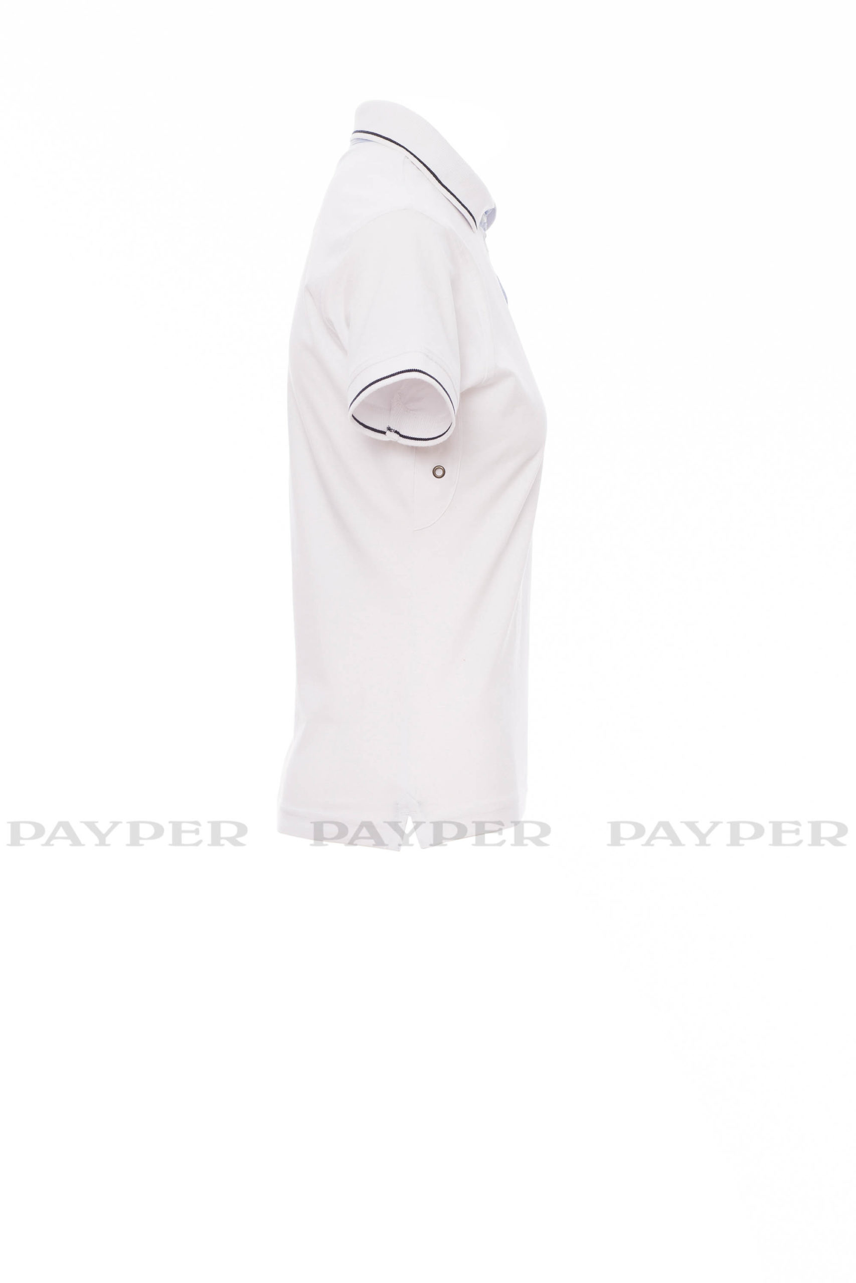 Tailliertes Damen-Poloshirt, kurzärmelig, mit sechs weißen Knöpfen, Innenseite des Kragens, der Knopfleiste und Seitenschlitze in Oxford-Hellblau, Kragen und Ärmelrand aus Rippstrick mit feiner kontrastfarbiger Einfassung, Lüftungsösen unter den Achseln, Seitenschlitzen mit Verstärkungsnaht, seitlichem Verstärkungsband, Stretchnähten, Nackensattel