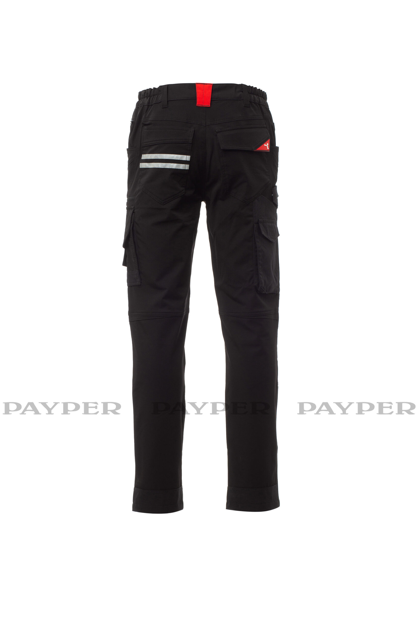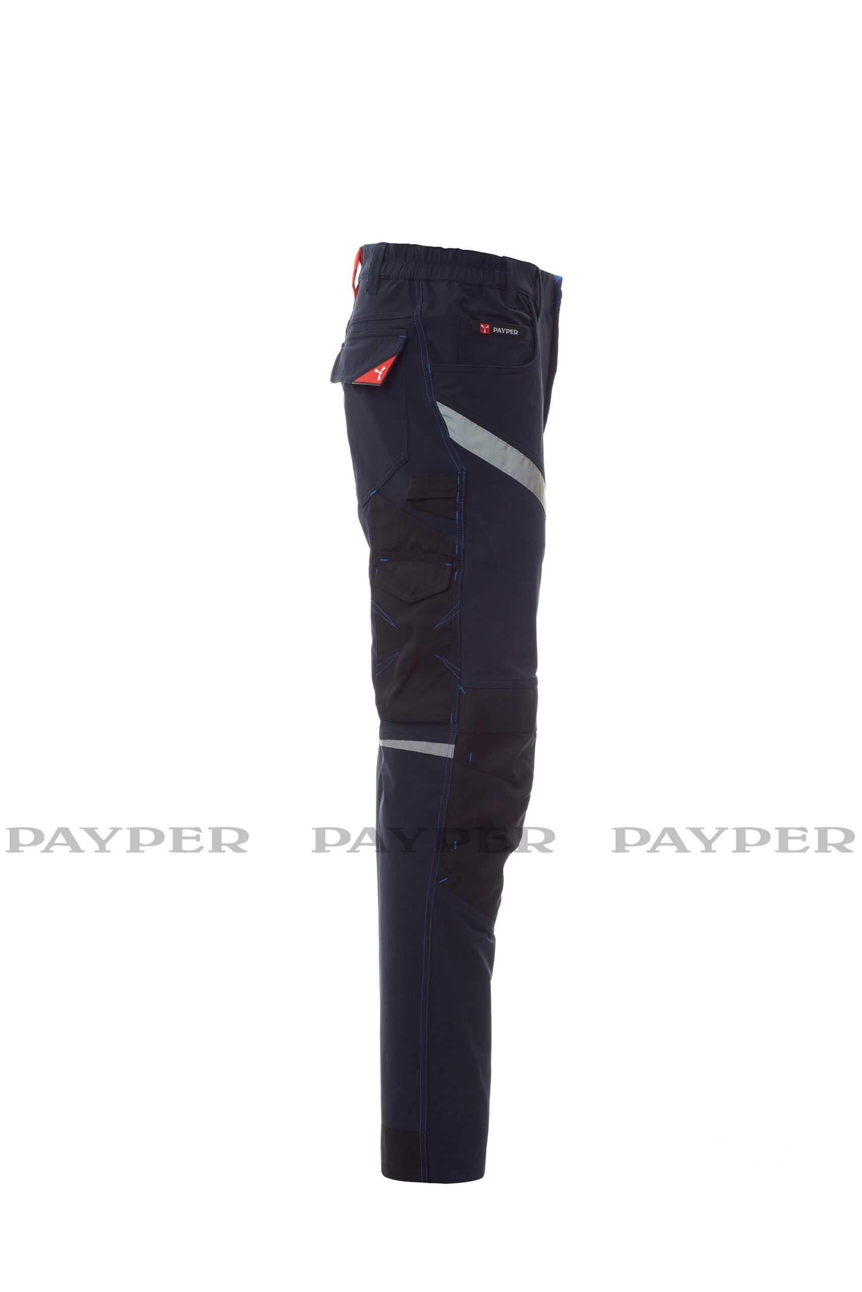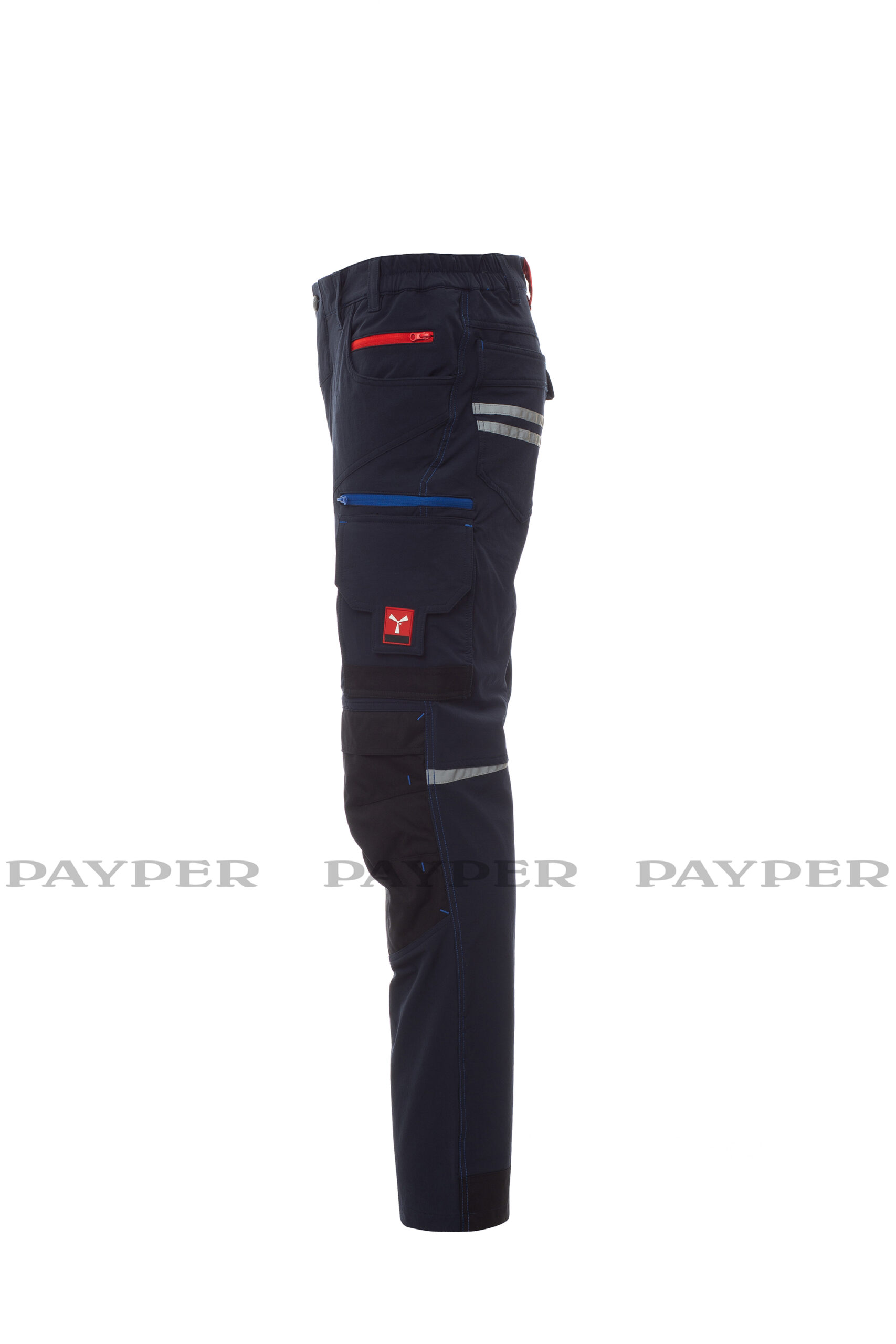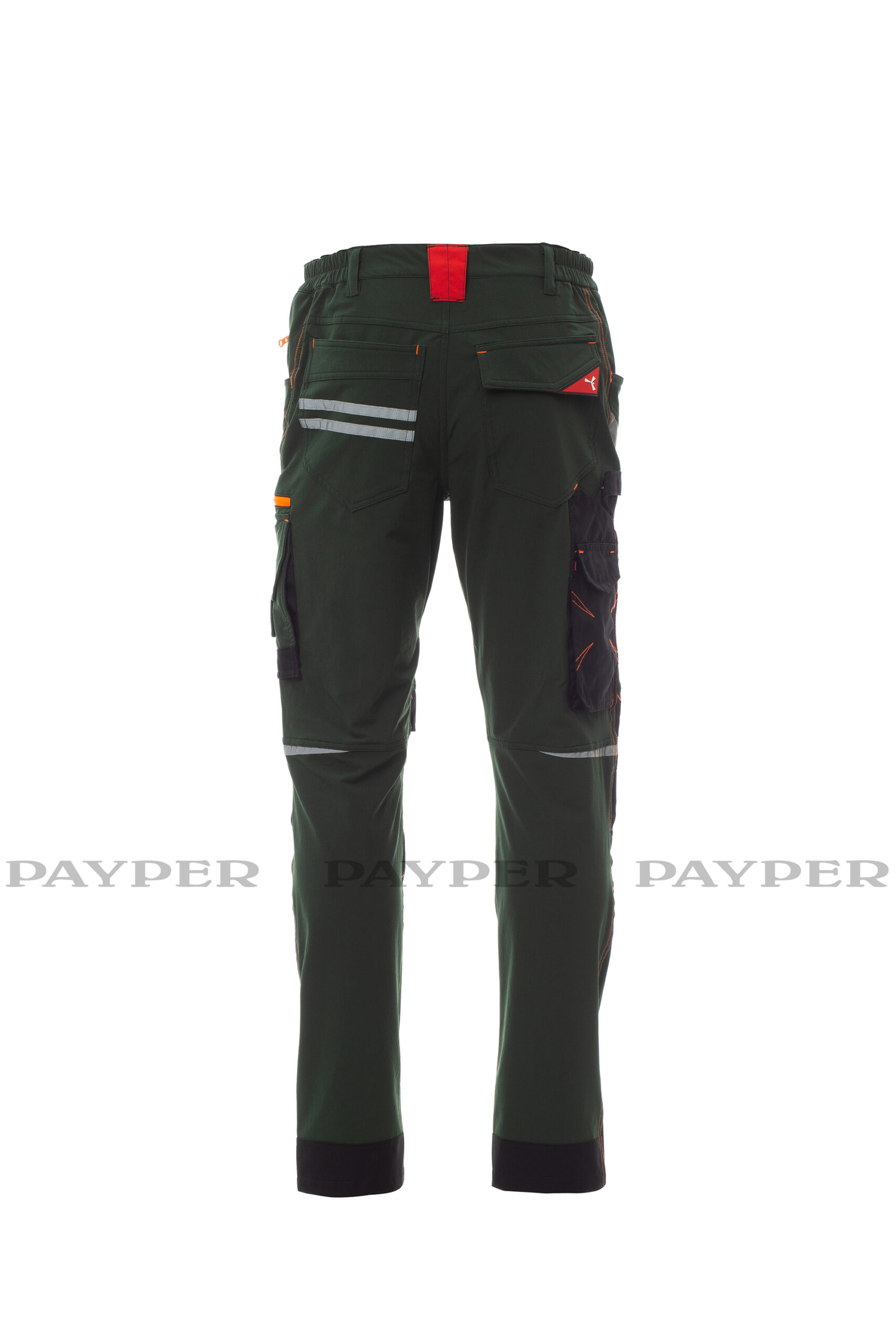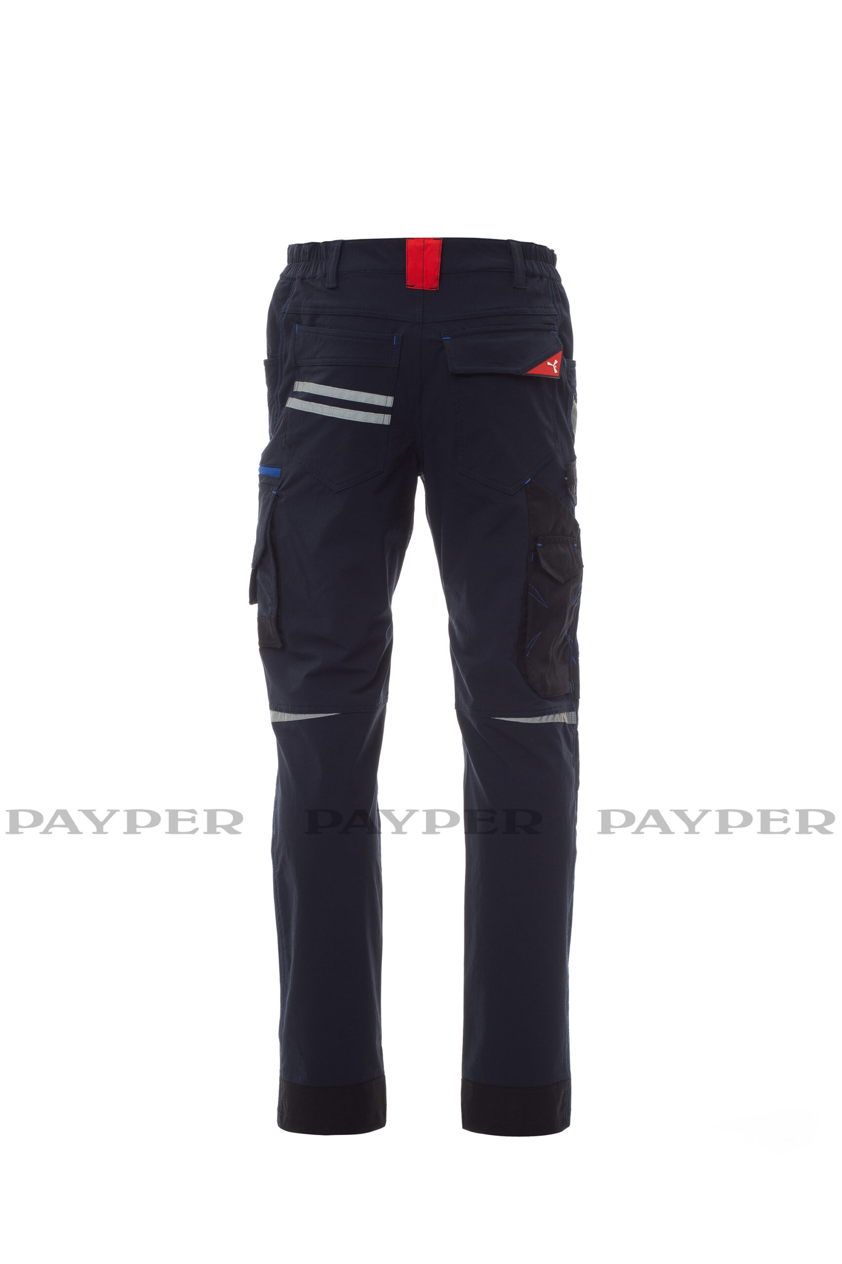 Ganzjährig tragbare 4-Way-Stretch-Unisex-Hose. Seitlicher Gummizug und Gürtelschlaufen. Hosenschlitz mit Reißverschluss und personalisierter Knopf. Auf der Vorderseite 2 abgerundete Taschen. 1 Münztäschchen auf der rechten Seite und 1 Sicherheitstasche mit Reißverschluss auf der linken Seite. Auf der Vorderseite des linken Beins befinden sich 3 Taschen: 1 waagrechte Tasche mit Reißverschluss. 1 Tasche mit geformter Patte. Klettverschluss und Ausweisfach. 1 kleine senkrechte Tasche mit Reißverschluss. Reflektierender Streifen auf der Vorderseite des rechten Beins. Beide Beine besitzen Kniepolstertaschen aus kontrastfarbigem Nylon Oxford 500D (Öffnung von oben). Rückseite: 1 Tasche mit Patte und Klettverschluss und 1 Tasche ohne Patte, aber mit 2 reflektierenden Streifen, 1 Hammerschlaufe (rechtes Bein), 1 offene Zollstocktasche (rechtes Bein) und 1 Handytasche mit Patte und Klettverschluss (rechtes Bein), reflektierende Einsätze auf Kniehöhe (beide Beine), Stoßband in Kontrastfarbe (beide Beine). Außerdem seitliche Nähte und Quernähte zur Verstärkung an verschiedenen Stellen in Kontrastfarbe. Die mittleren (italienischen) Größen 48-50-52 besitzen eine reguläre Innenbeinlänge von 82 cm.