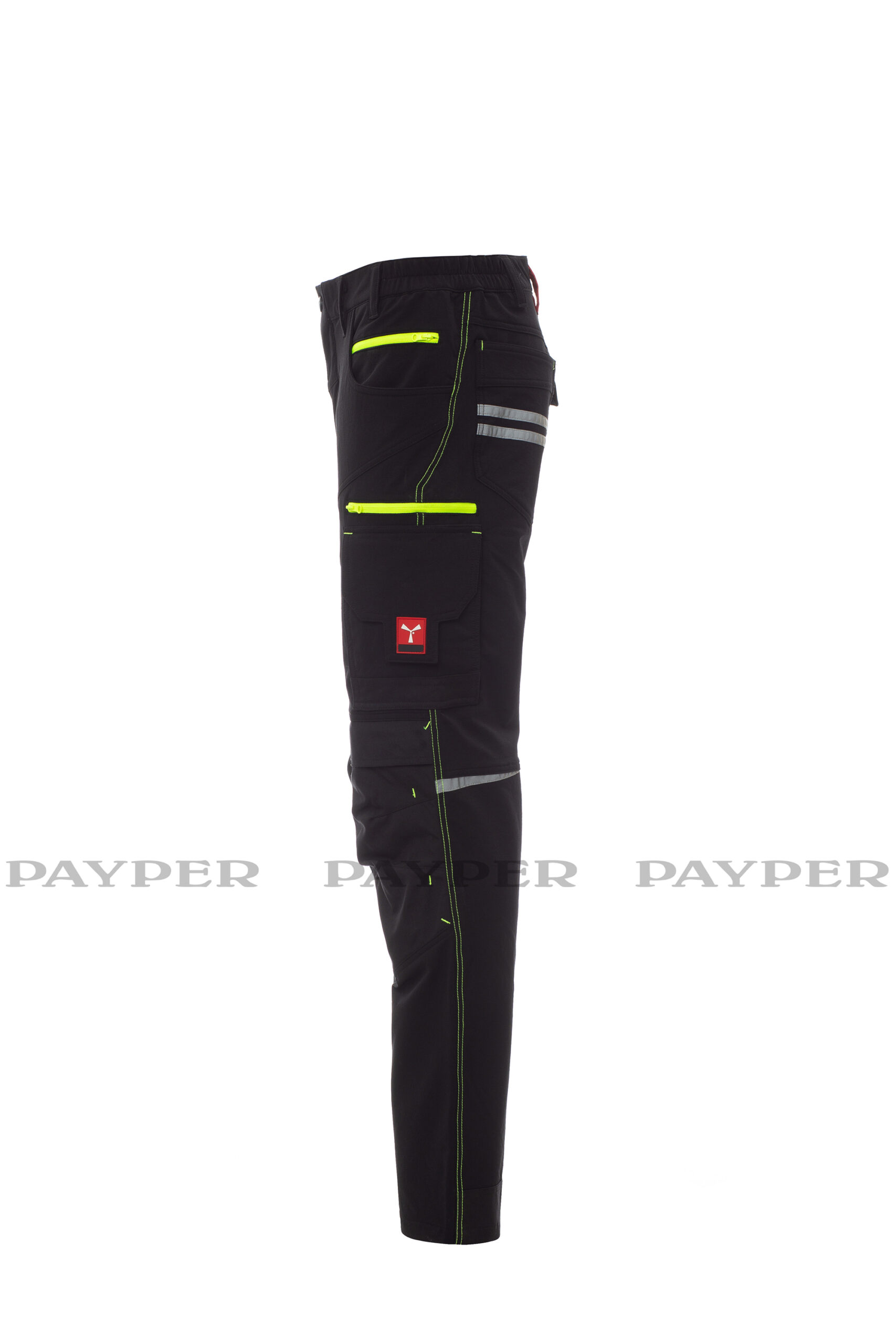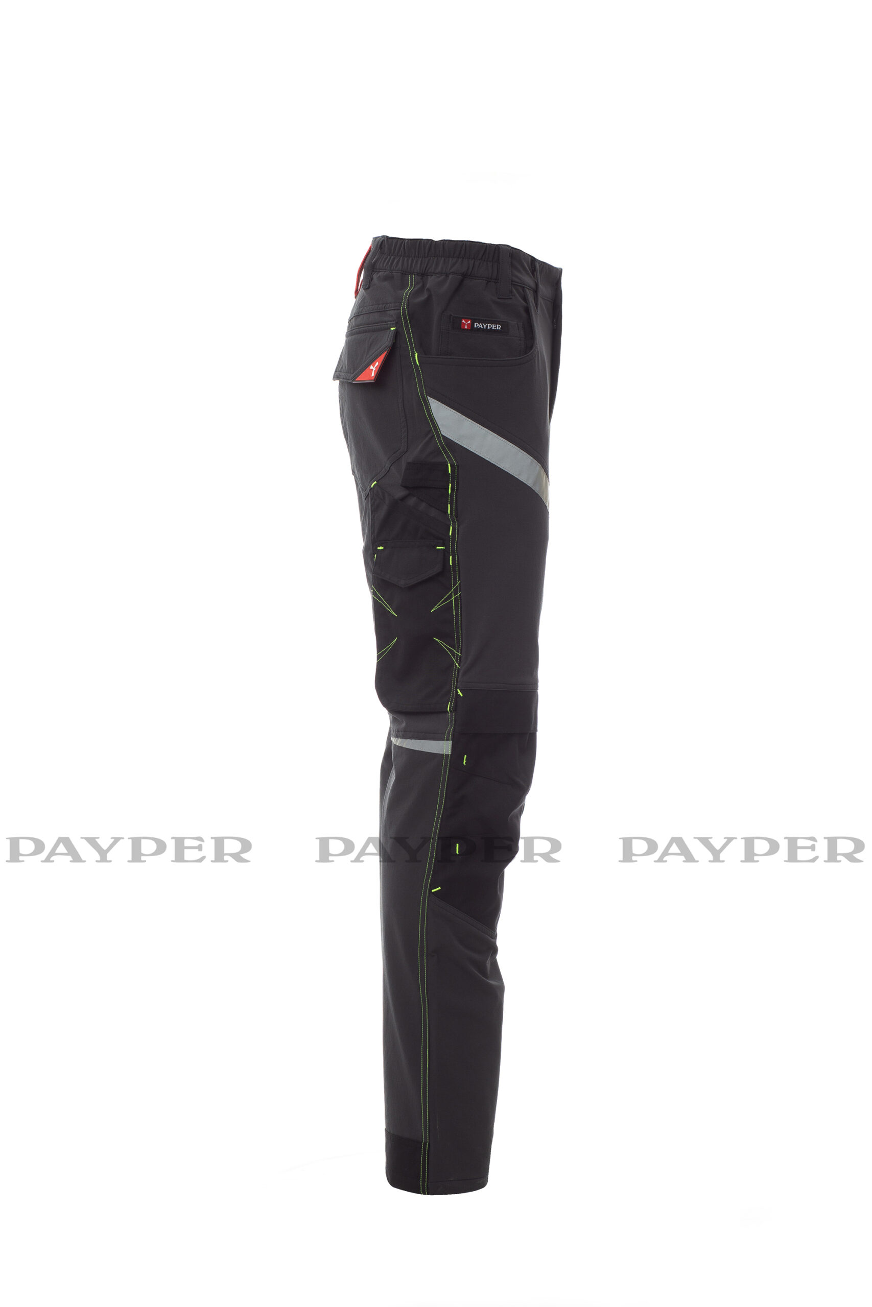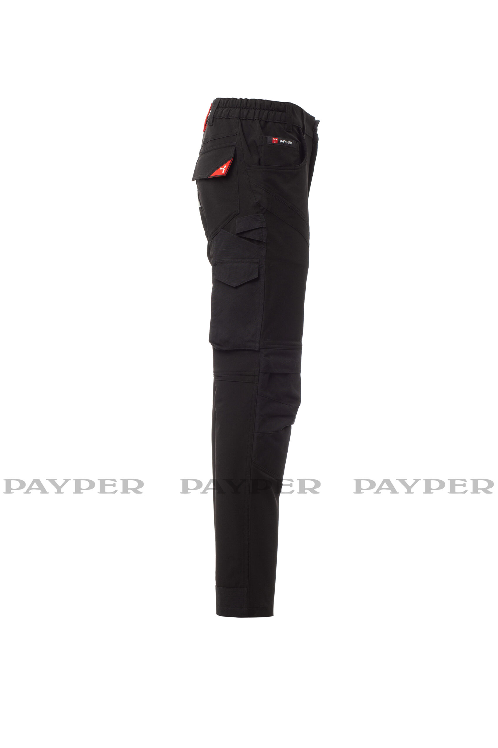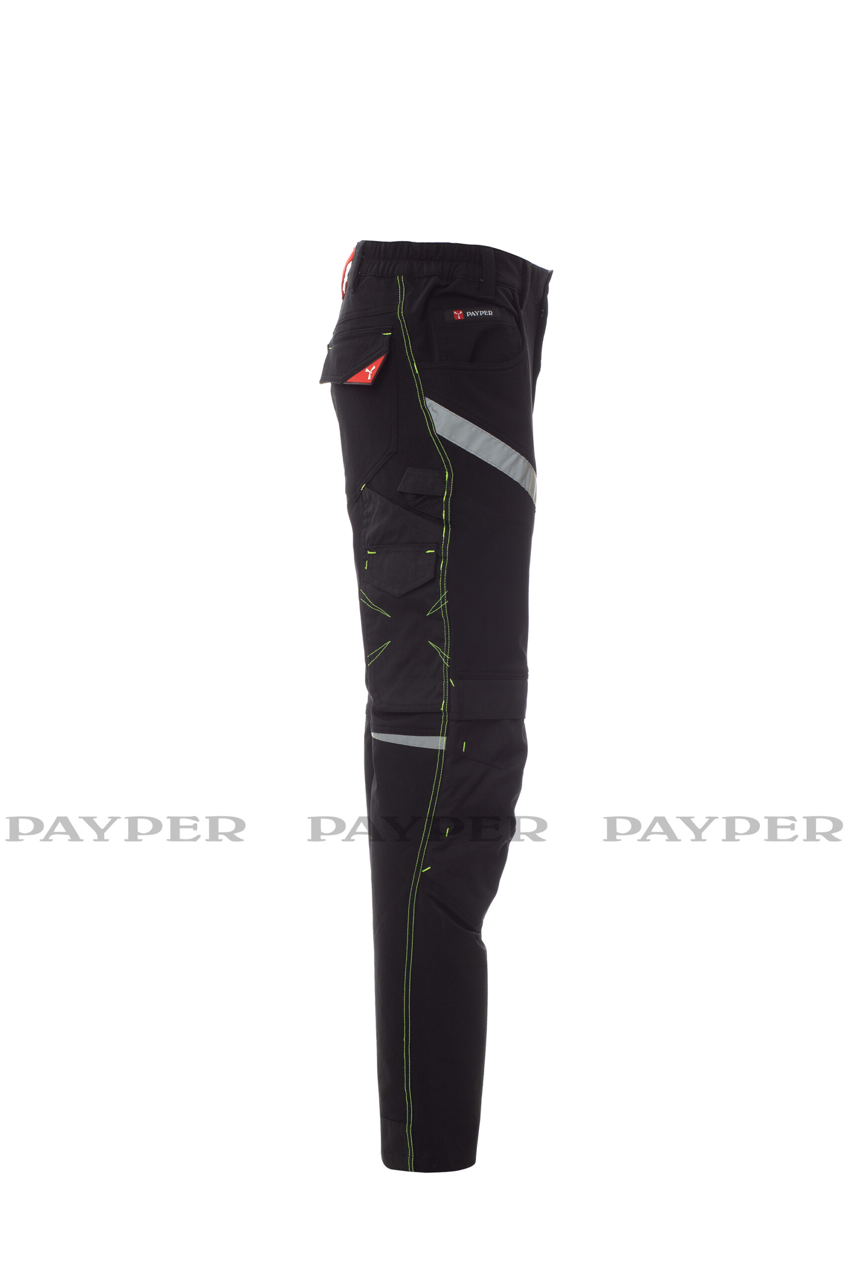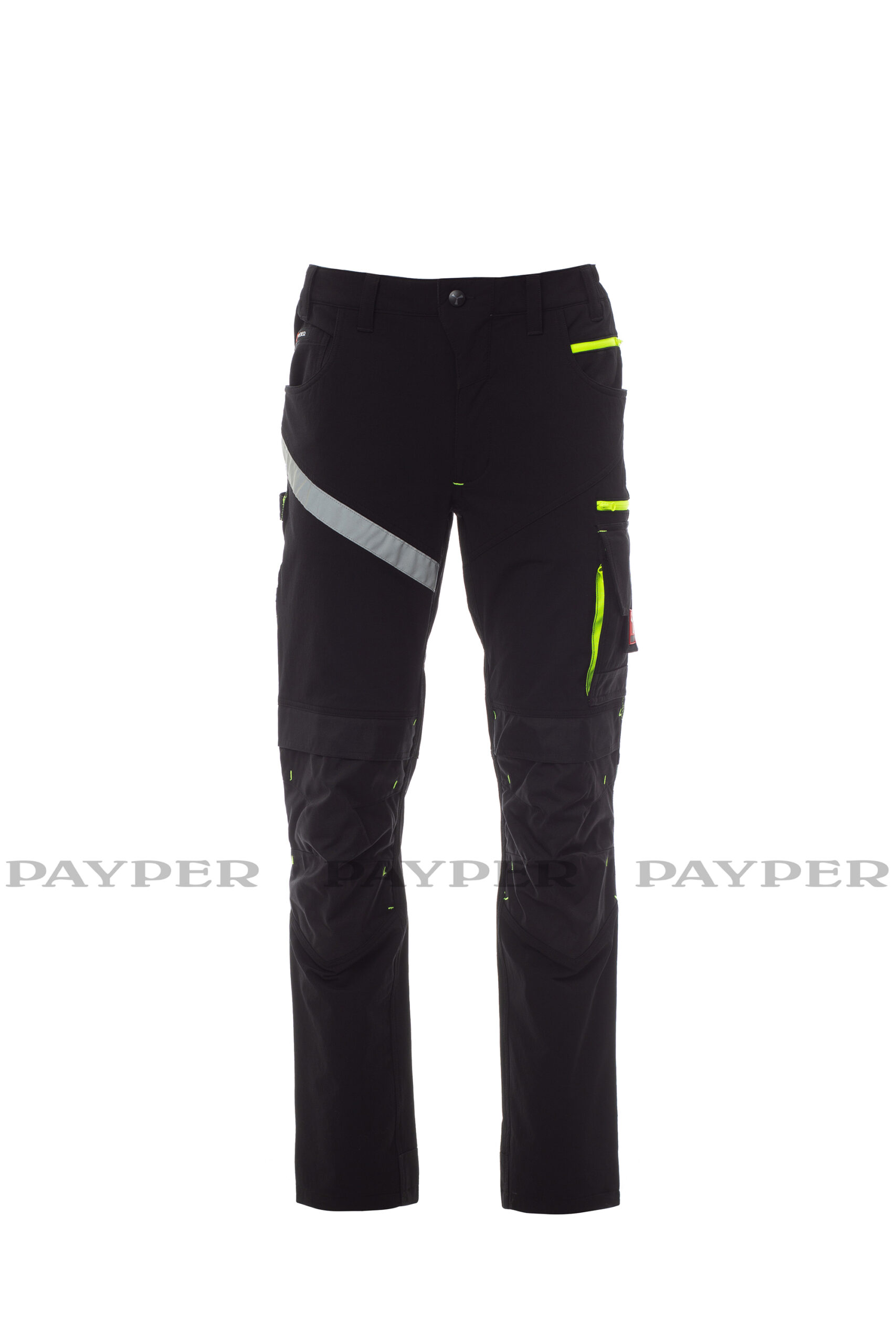 Ganzjährig tragbare 4-Way-Stretch-Unisex-Hose. Seitlicher Gummizug und Gürtelschlaufen. Hosenschlitz mit Reißverschluss und personalisierter Knopf. Auf der Vorderseite 2 abgerundete Taschen. 1 Münztäschchen auf der rechten Seite und 1 Sicherheitstasche mit Reißverschluss auf der linken Seite. Auf der Vorderseite des linken Beins befinden sich 3 Taschen: 1 waagrechte Tasche mit Reißverschluss. 1 Tasche mit geformter Patte. Klettverschluss und Ausweisfach. 1 kleine senkrechte Tasche mit Reißverschluss. Reflektierender Streifen auf der Vorderseite des rechten Beins. Beide Beine besitzen Kniepolstertaschen aus kontrastfarbigem Nylon Oxford 500D (Öffnung von oben). Rückseite: 1 Tasche mit Patte und Klettverschluss und 1 Tasche ohne Patte, aber mit 2 reflektierenden Streifen, 1 Hammerschlaufe (rechtes Bein), 1 offene Zollstocktasche (rechtes Bein) und 1 Handytasche mit Patte und Klettverschluss (rechtes Bein), reflektierende Einsätze auf Kniehöhe (beide Beine), Stoßband in Kontrastfarbe (beide Beine). Außerdem seitliche Nähte und Quernähte zur Verstärkung an verschiedenen Stellen in Kontrastfarbe. Die mittleren (italienischen) Größen 48-50-52 besitzen eine reguläre Innenbeinlänge von 82 cm.