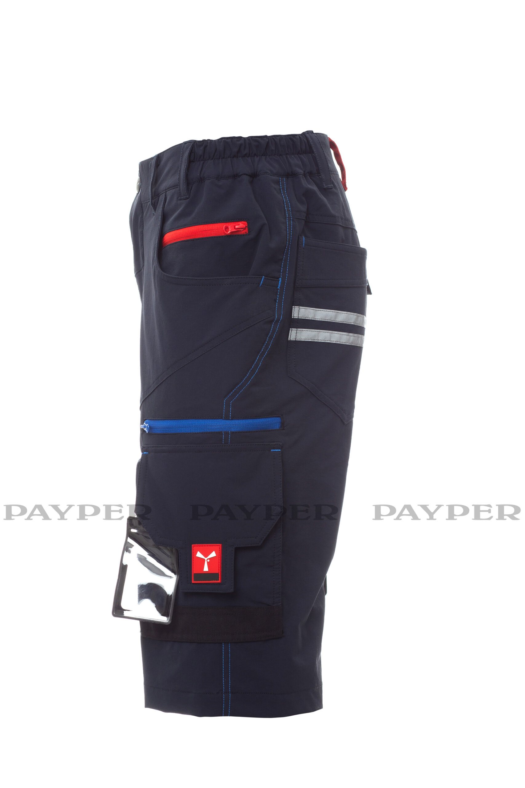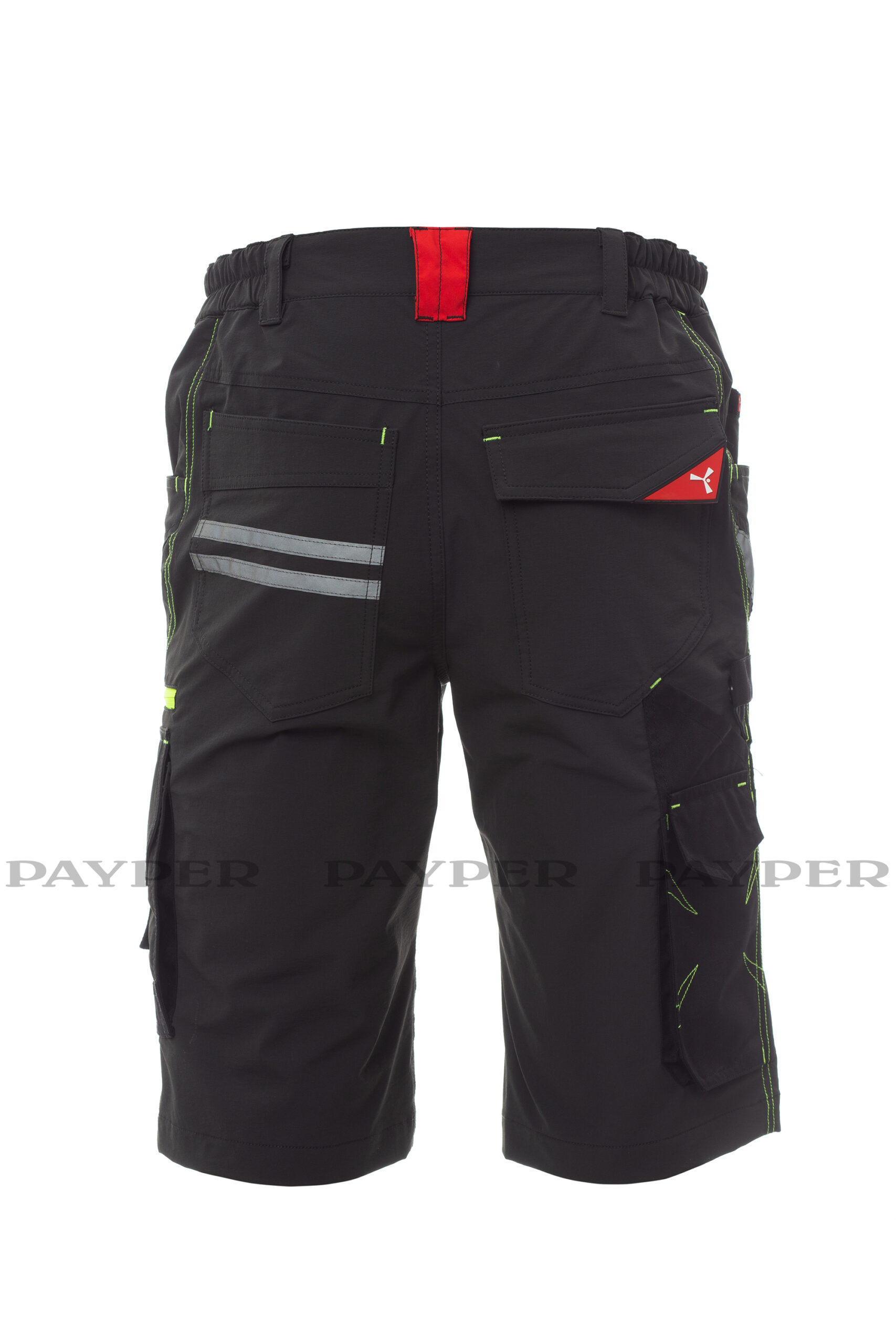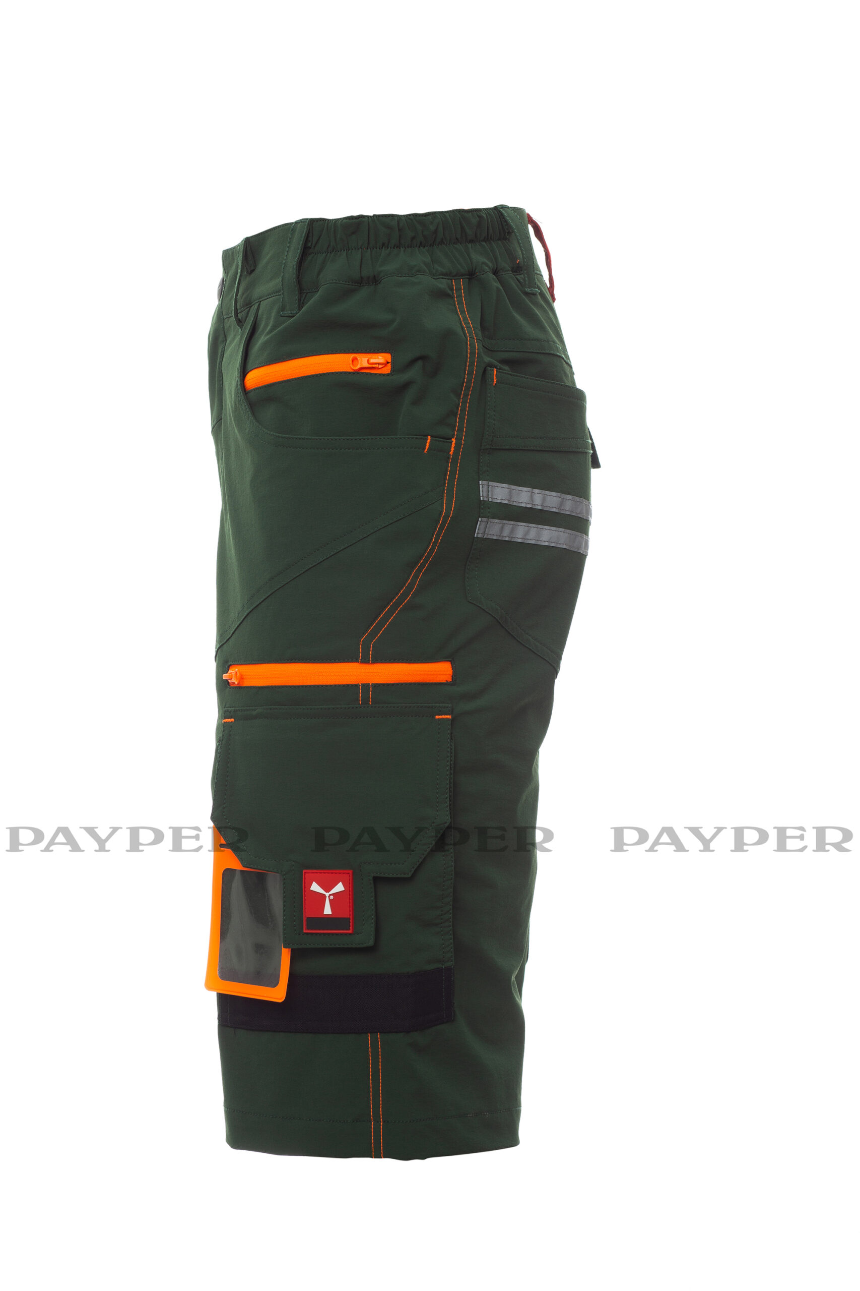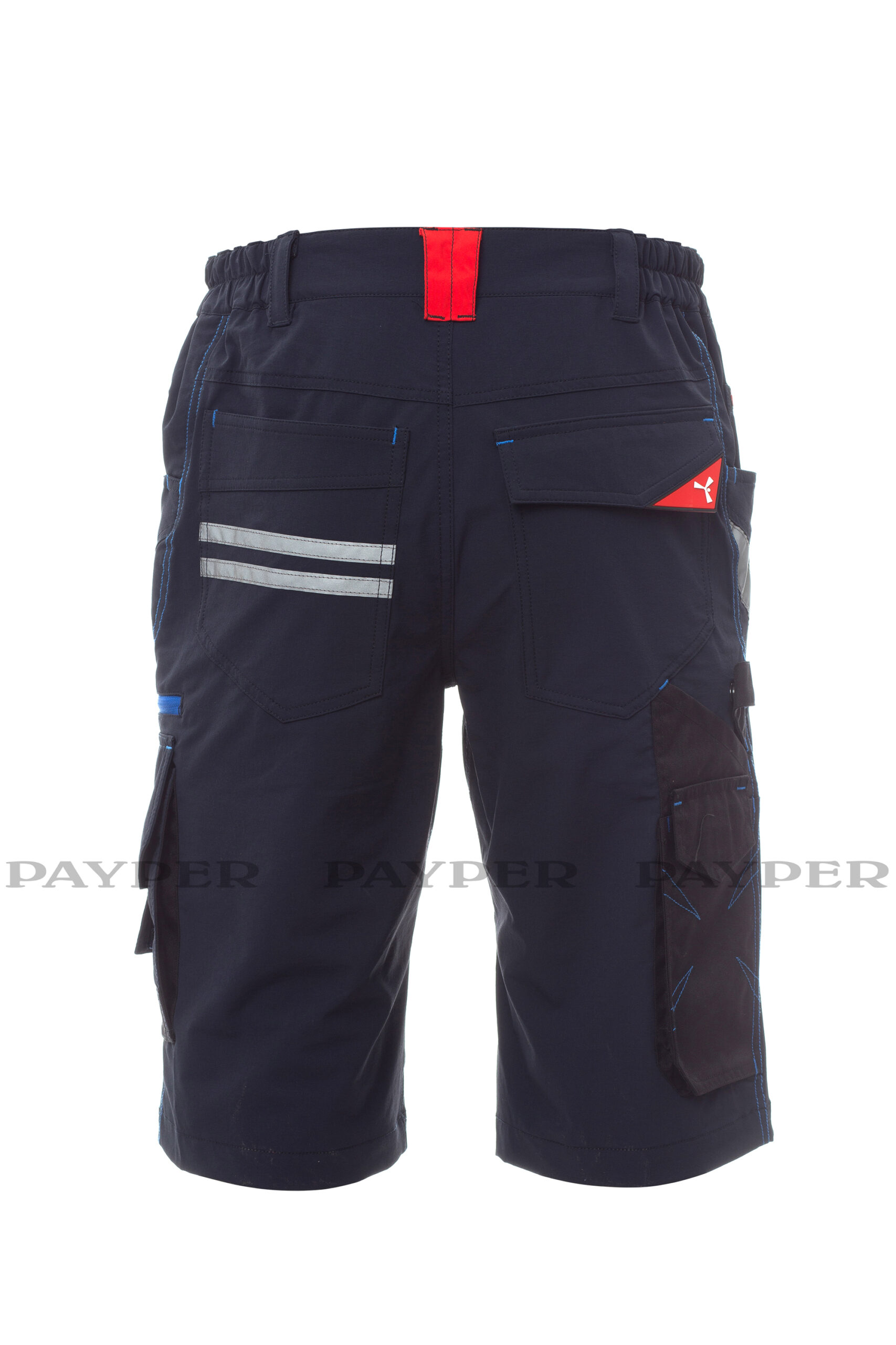 Unisex-Bermudashorts, 4-Way-Stretch, seitlicher Gummizug und Gürtelschlaufen, Hosenschlitz mit Reißverschluss, personalisierter Knopf. Auf der Vorderseite 2 abgerundete Taschen, 1 Münztäschchen auf der rechten Seite und 1 Sicherheitstasche mit Reißverschluss auf der linken Seite. Auf der Vorderseite des linken Beins befinden sich 3 Taschen: 1 waagrechte Tasche mit Reißverschluss, 1 Tasche mit geformter Patte, Klettverschluss und Ausweisfach, 1 kleine senkrechte Tasche mit Reißverschluss. Reflektierender Streifen auf der Vorderseite des rechten Beins. Rückseite: 1 Tasche mit Patte und Klettverschluss und 1 Tasche ohne Patte, aber mit 2 reflektierenden Streifen, 1 Hammerschlaufe (rechtes Bein), 1 offene Zollstocktasche (rechtes Bein) und 1 Handytasche mit Patte und Klettverschluss (rechtes Bein). Außerdem seitliche Nähte und Quernähte zur Verstärkung an verschiedenen Stellen in Kontrastfarbe. Die mittleren (italienischen) Größen 48-50-52 besitzen eine Innenbeinlänge von 31 cm.