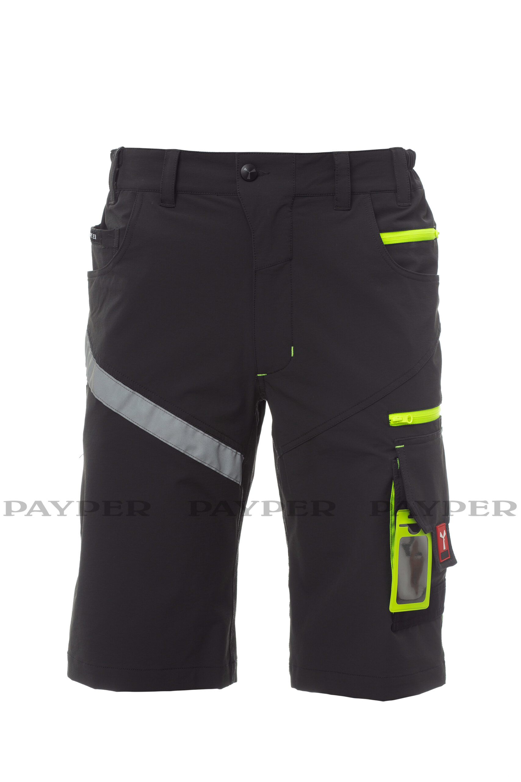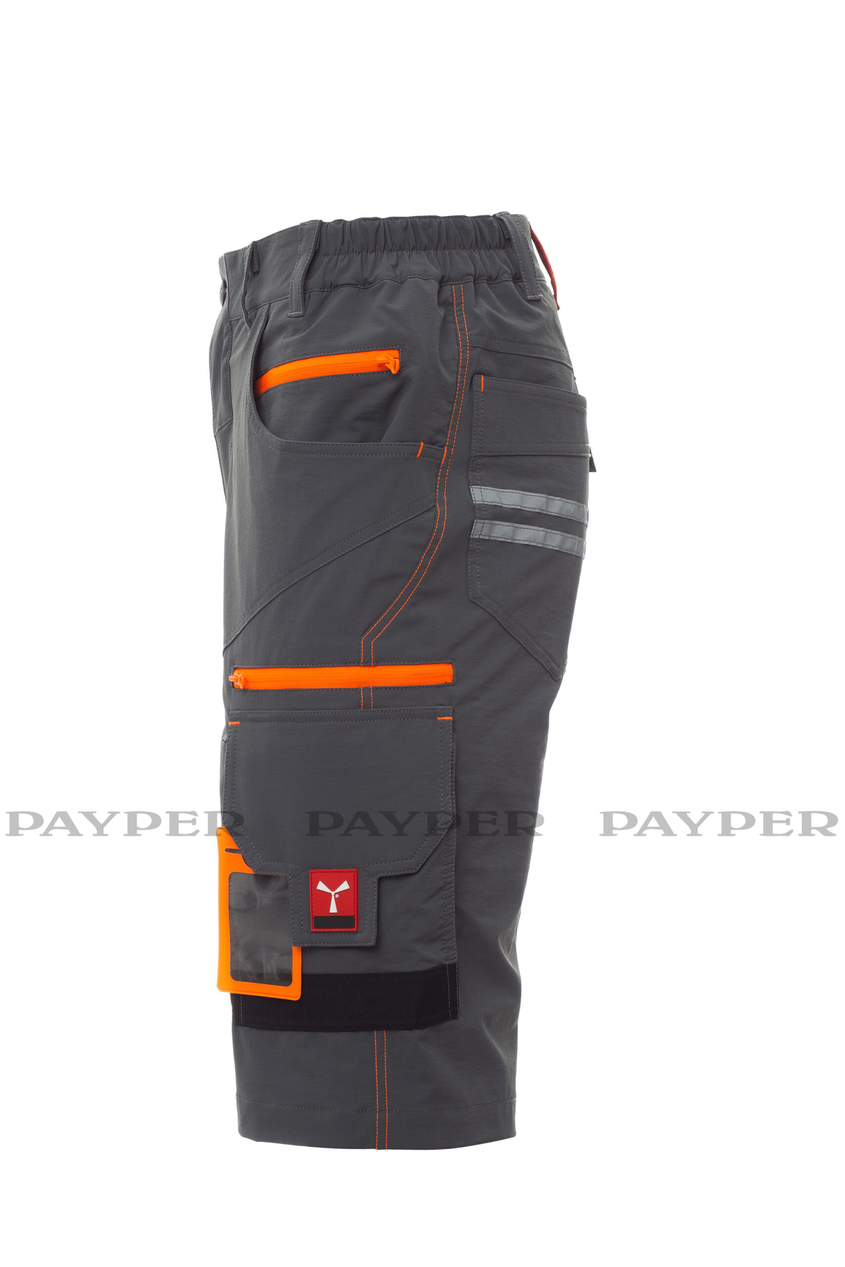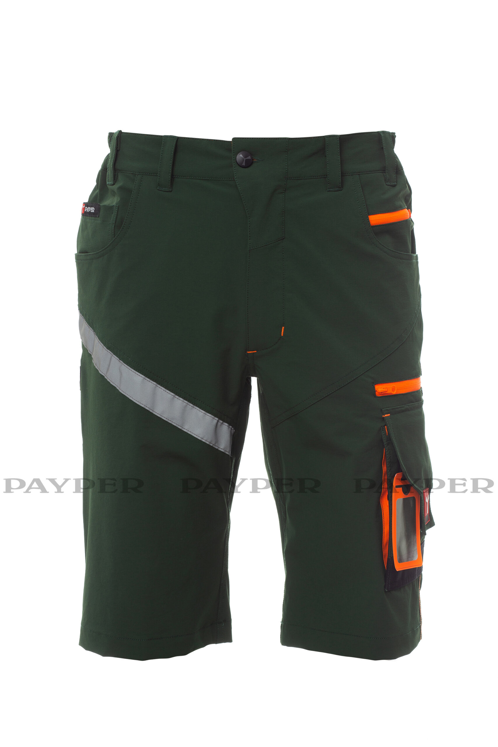 Unisex-Bermudashorts, 4-Way-Stretch, seitlicher Gummizug und Gürtelschlaufen, Hosenschlitz mit Reißverschluss, personalisierter Knopf. Auf der Vorderseite 2 abgerundete Taschen, 1 Münztäschchen auf der rechten Seite und 1 Sicherheitstasche mit Reißverschluss auf der linken Seite. Auf der Vorderseite des linken Beins befinden sich 3 Taschen: 1 waagrechte Tasche mit Reißverschluss, 1 Tasche mit geformter Patte, Klettverschluss und Ausweisfach, 1 kleine senkrechte Tasche mit Reißverschluss. Reflektierender Streifen auf der Vorderseite des rechten Beins. Rückseite: 1 Tasche mit Patte und Klettverschluss und 1 Tasche ohne Patte, aber mit 2 reflektierenden Streifen, 1 Hammerschlaufe (rechtes Bein), 1 offene Zollstocktasche (rechtes Bein) und 1 Handytasche mit Patte und Klettverschluss (rechtes Bein). Außerdem seitliche Nähte und Quernähte zur Verstärkung an verschiedenen Stellen in Kontrastfarbe. Die mittleren (italienischen) Größen 48-50-52 besitzen eine Innenbeinlänge von 31 cm.