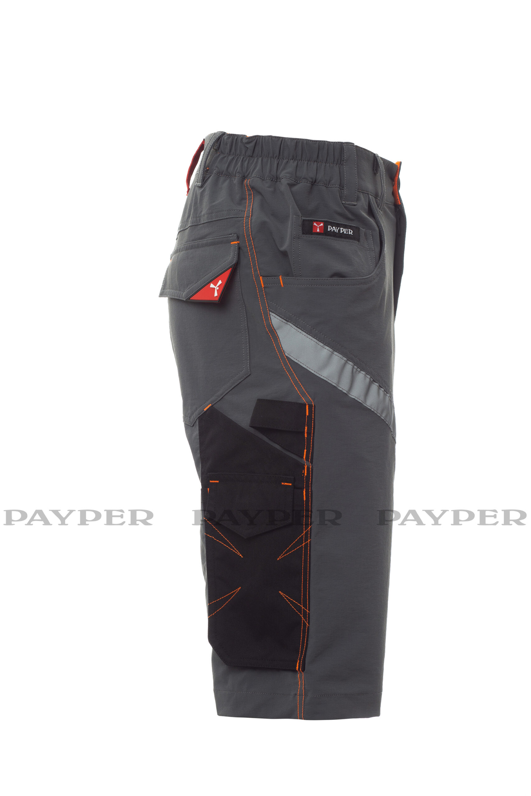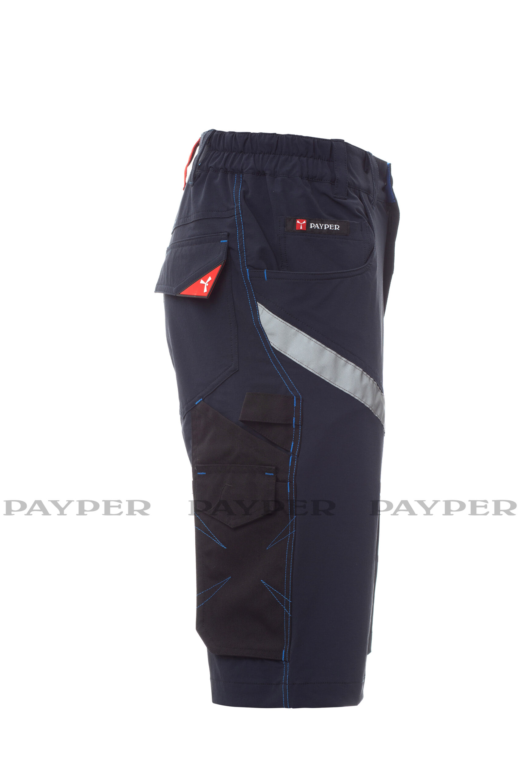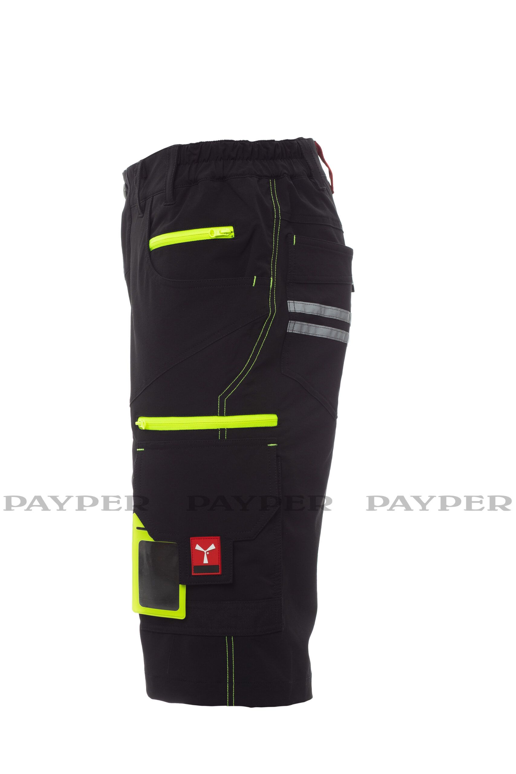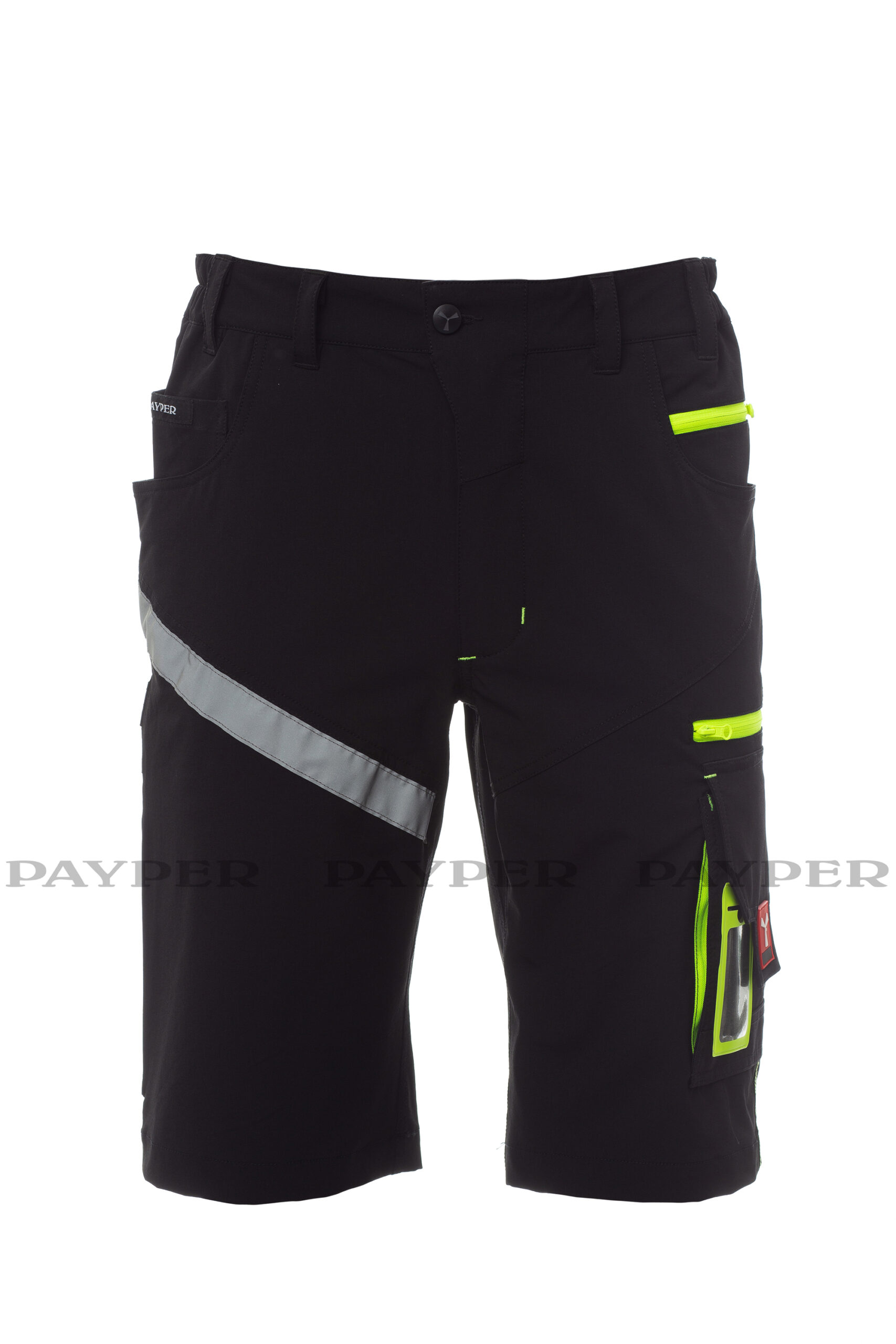 Unisex-Bermudashorts, 4-Way-Stretch, seitlicher Gummizug und Gürtelschlaufen, Hosenschlitz mit Reißverschluss, personalisierter Knopf. Auf der Vorderseite 2 abgerundete Taschen, 1 Münztäschchen auf der rechten Seite und 1 Sicherheitstasche mit Reißverschluss auf der linken Seite. Auf der Vorderseite des linken Beins befinden sich 3 Taschen: 1 waagrechte Tasche mit Reißverschluss, 1 Tasche mit geformter Patte, Klettverschluss und Ausweisfach, 1 kleine senkrechte Tasche mit Reißverschluss. Reflektierender Streifen auf der Vorderseite des rechten Beins. Rückseite: 1 Tasche mit Patte und Klettverschluss und 1 Tasche ohne Patte, aber mit 2 reflektierenden Streifen, 1 Hammerschlaufe (rechtes Bein), 1 offene Zollstocktasche (rechtes Bein) und 1 Handytasche mit Patte und Klettverschluss (rechtes Bein). Außerdem seitliche Nähte und Quernähte zur Verstärkung an verschiedenen Stellen in Kontrastfarbe. Die mittleren (italienischen) Größen 48-50-52 besitzen eine Innenbeinlänge von 31 cm.