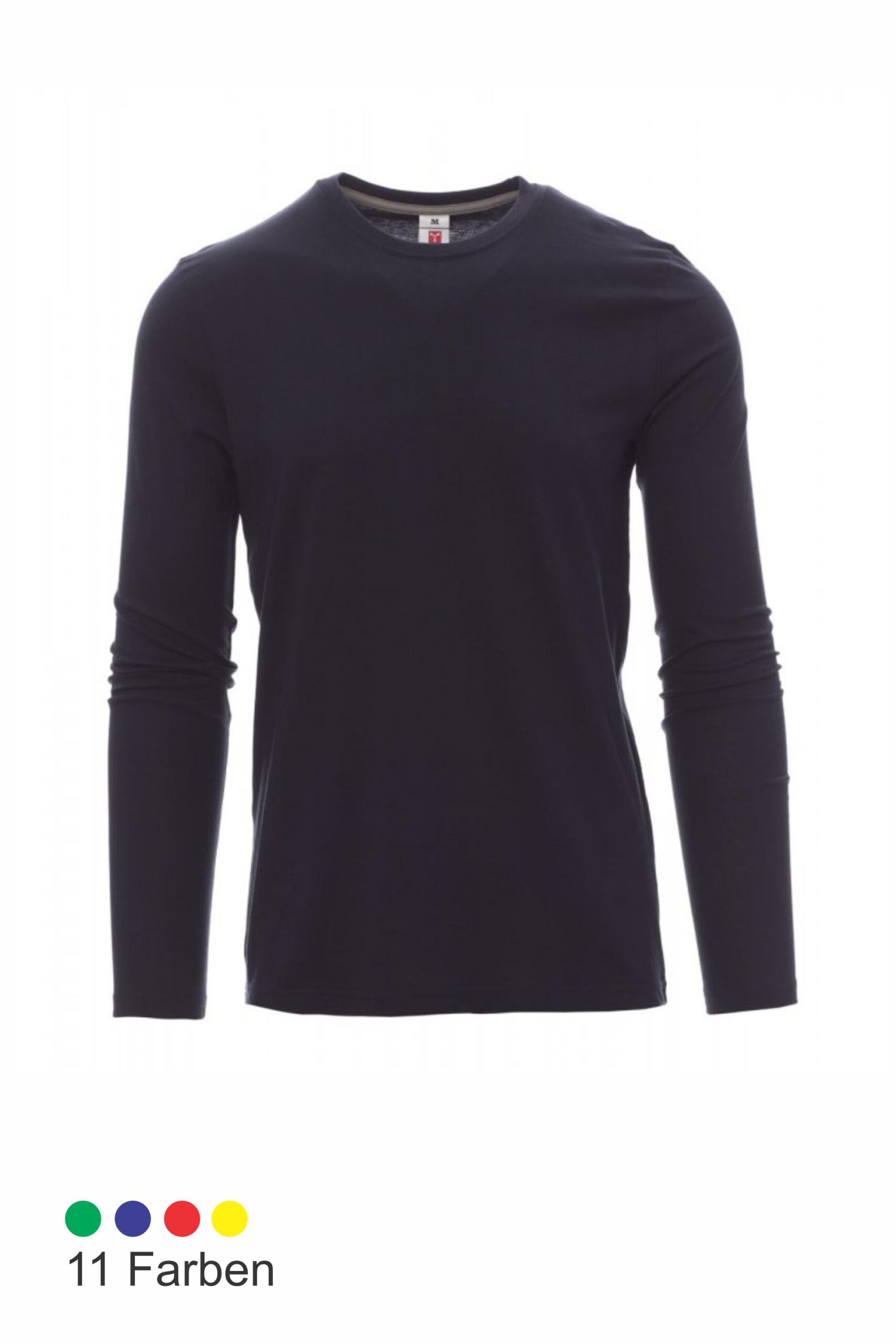Herren-T-Shirt mit Rundhalsausschnitt, langärmelig, Feinripp-Kragen 1,5 cm aus Spandex-Mischgewebe mit Kappnaht an der Vorderseite, Verstärkungsband in Kontrastfarbe von Schulter zu Schulter, das im Kragen sichtbar ist, Stretchnähten, Seitennaht