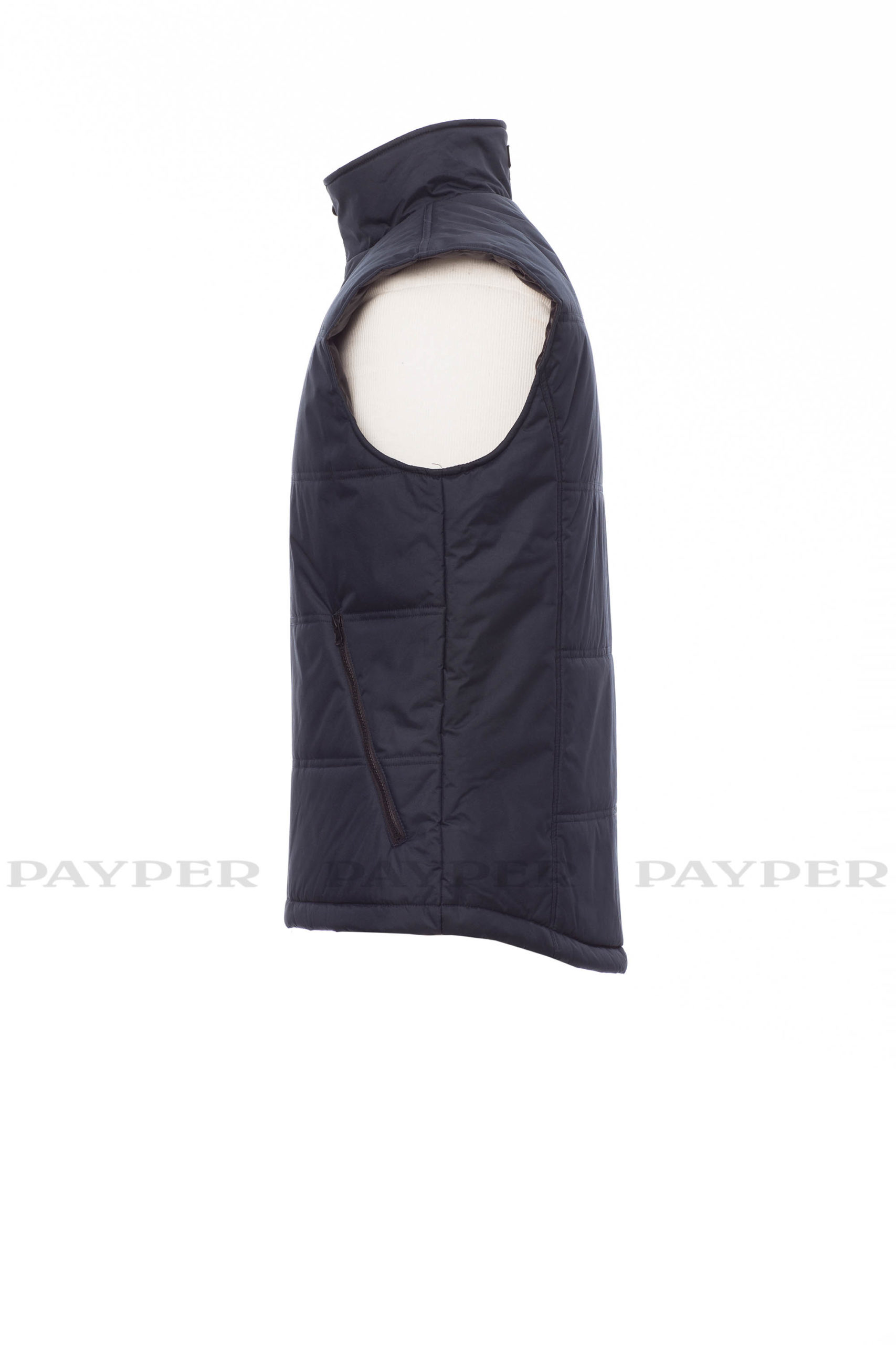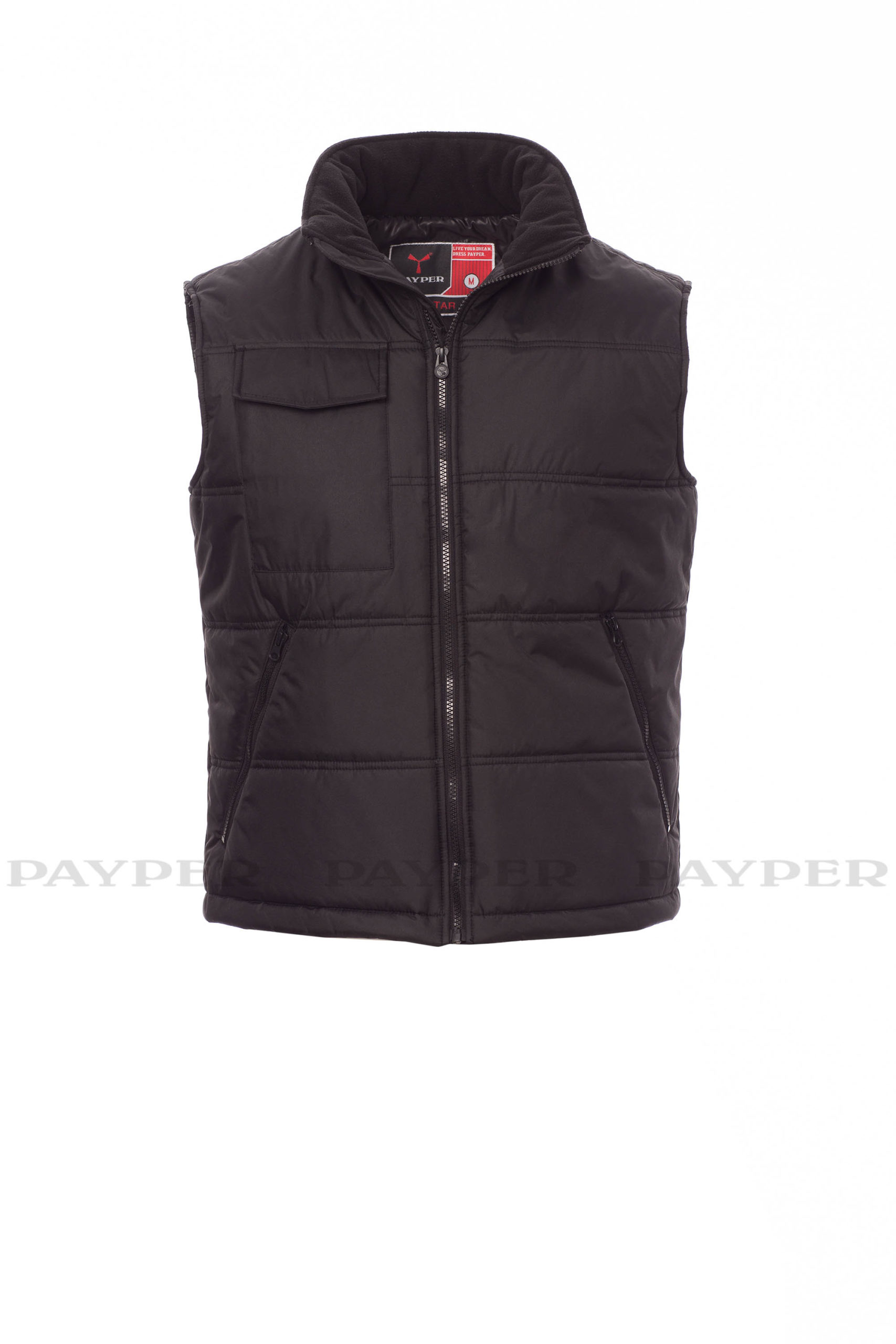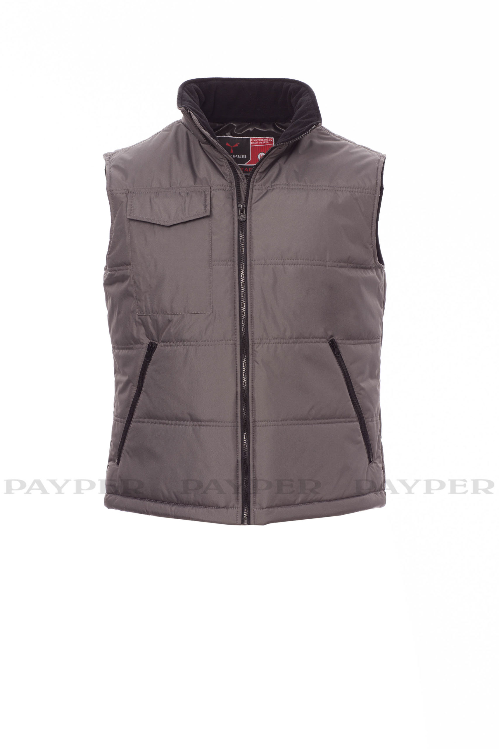 Steppweste, vorgeformter Rücken, Stepp- und High-Density-Futter, Krageninnenseite aus Fleece. 2 geräumige Reißverschlusstaschen, Handytasche auf der Brust und 1 Innentasche.