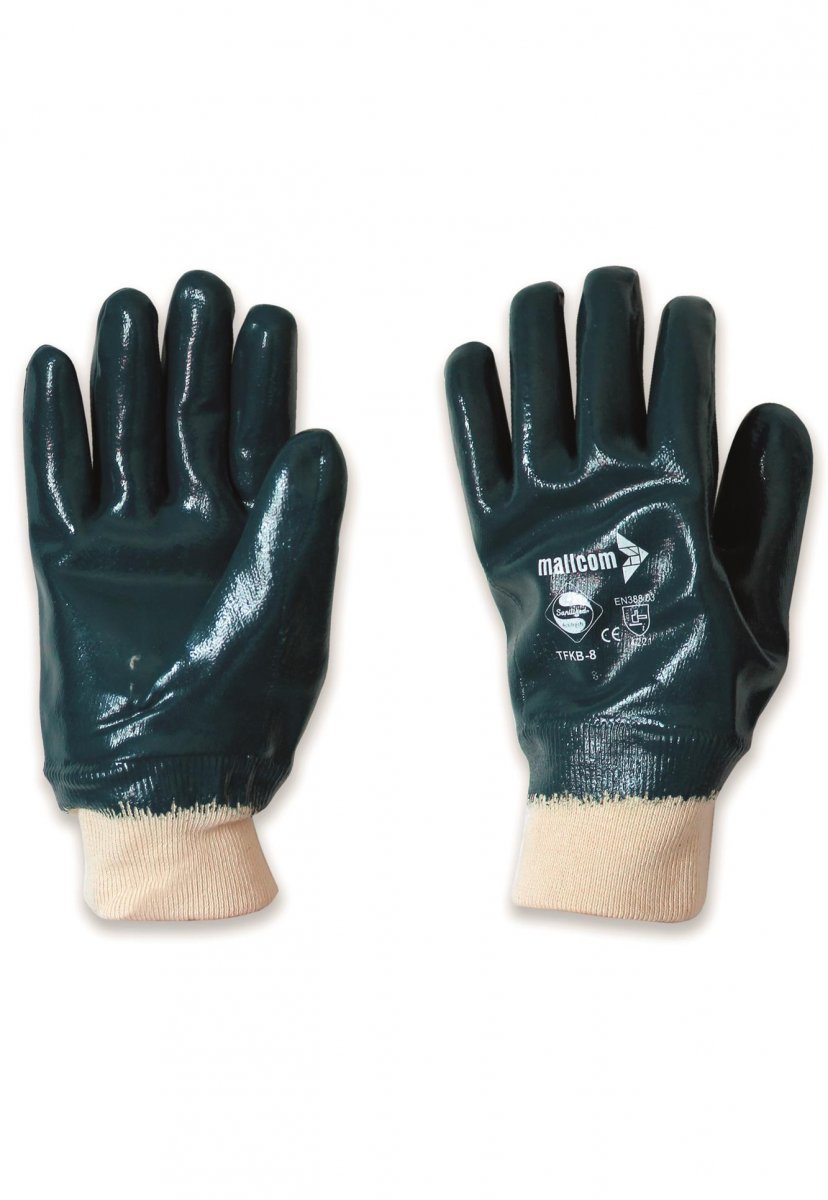 NBR-Handschuhe, vollständig beschichtet, Strickbündchen, beschichtete Interlock-Baumwolle 24G, Sanitized-Behandlung – Eigenschaften: unempfindlich, sehr strapazierfähig – Stärken: Passform, Griff, Schutz, Flüssigkeitsbeständig, Zweckmäßigkeit – Einsatzbereiche: schwere Arbeiten, bei Umgang mit Metall, scharfkantigen und abrasiven Materialien, Öl, Fett, Schmutz, Kohlenwasserstoffen, Schmierstoffen. 1 Dutzend (12 Paar)