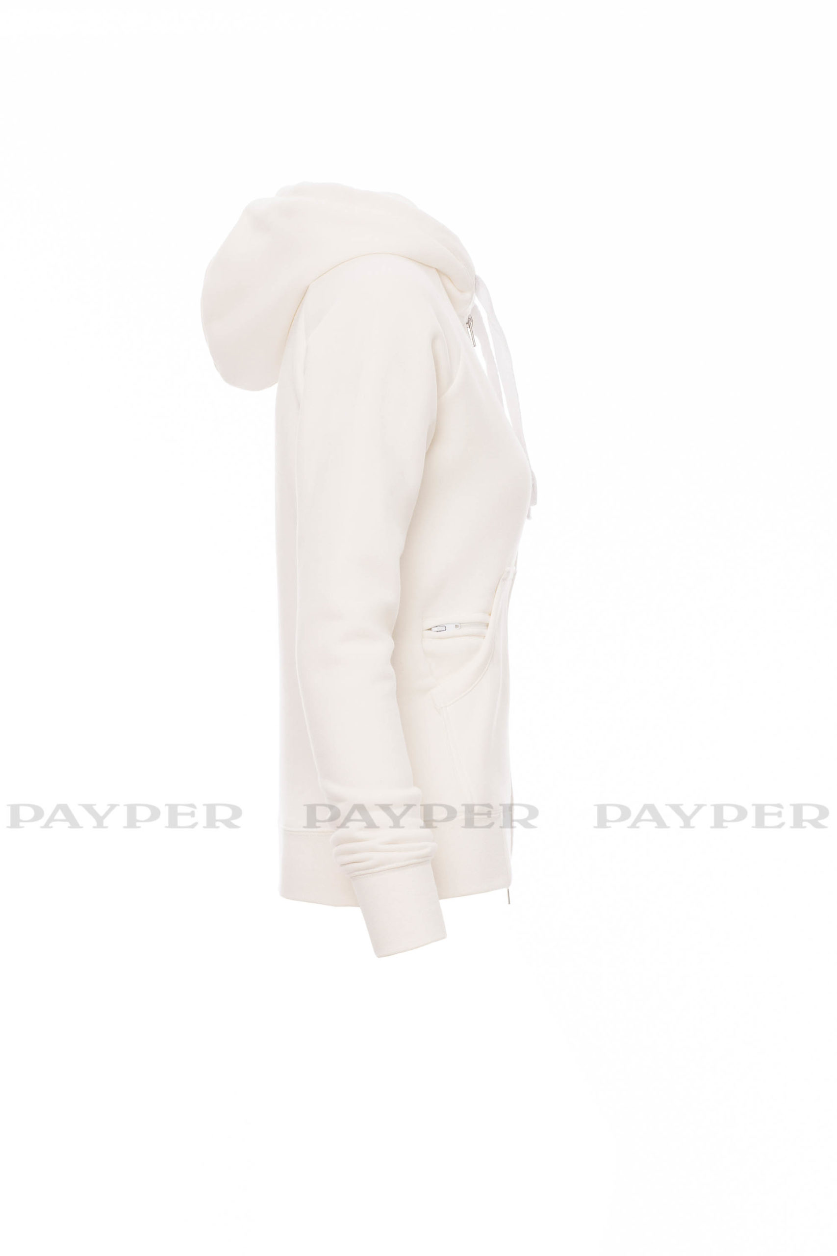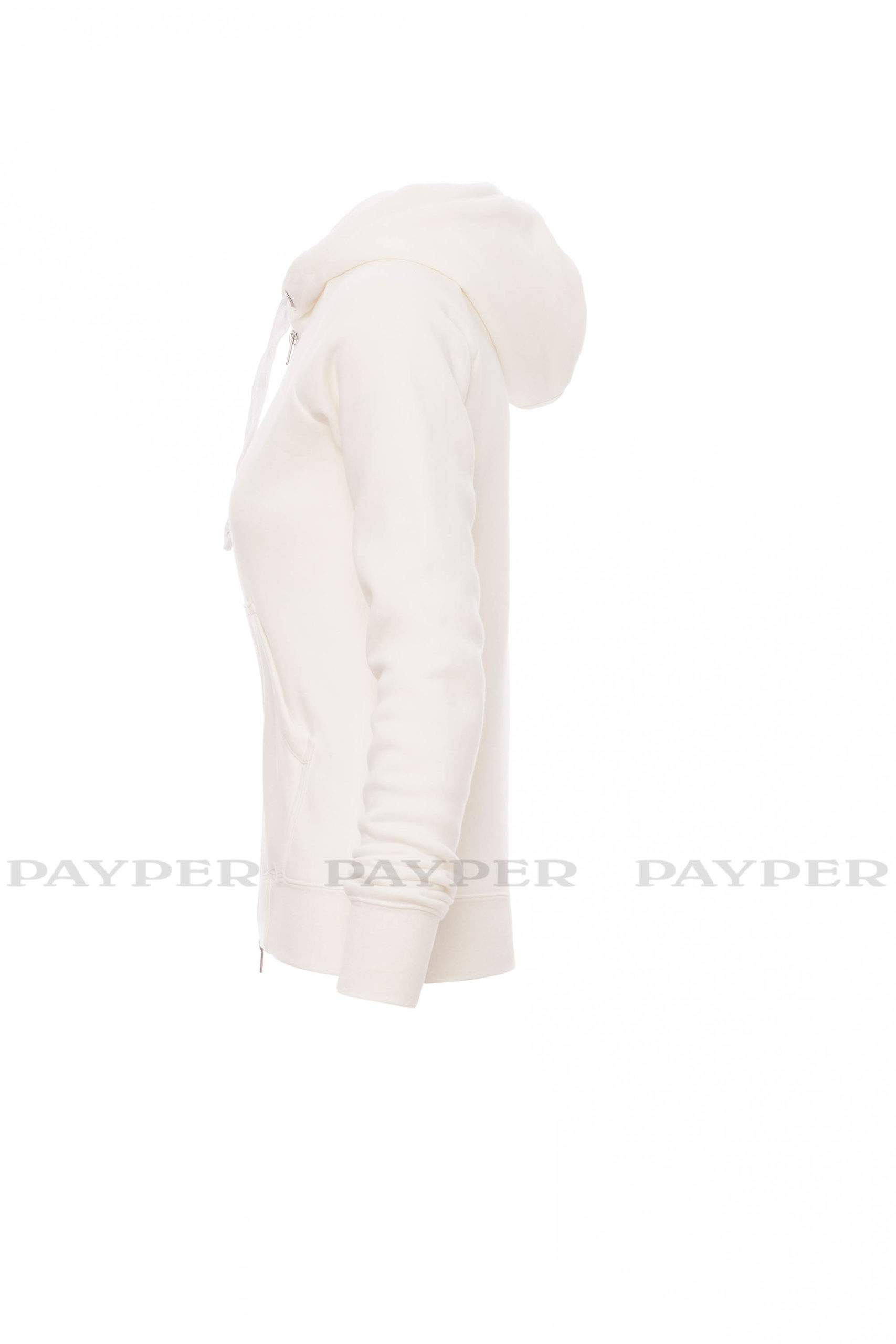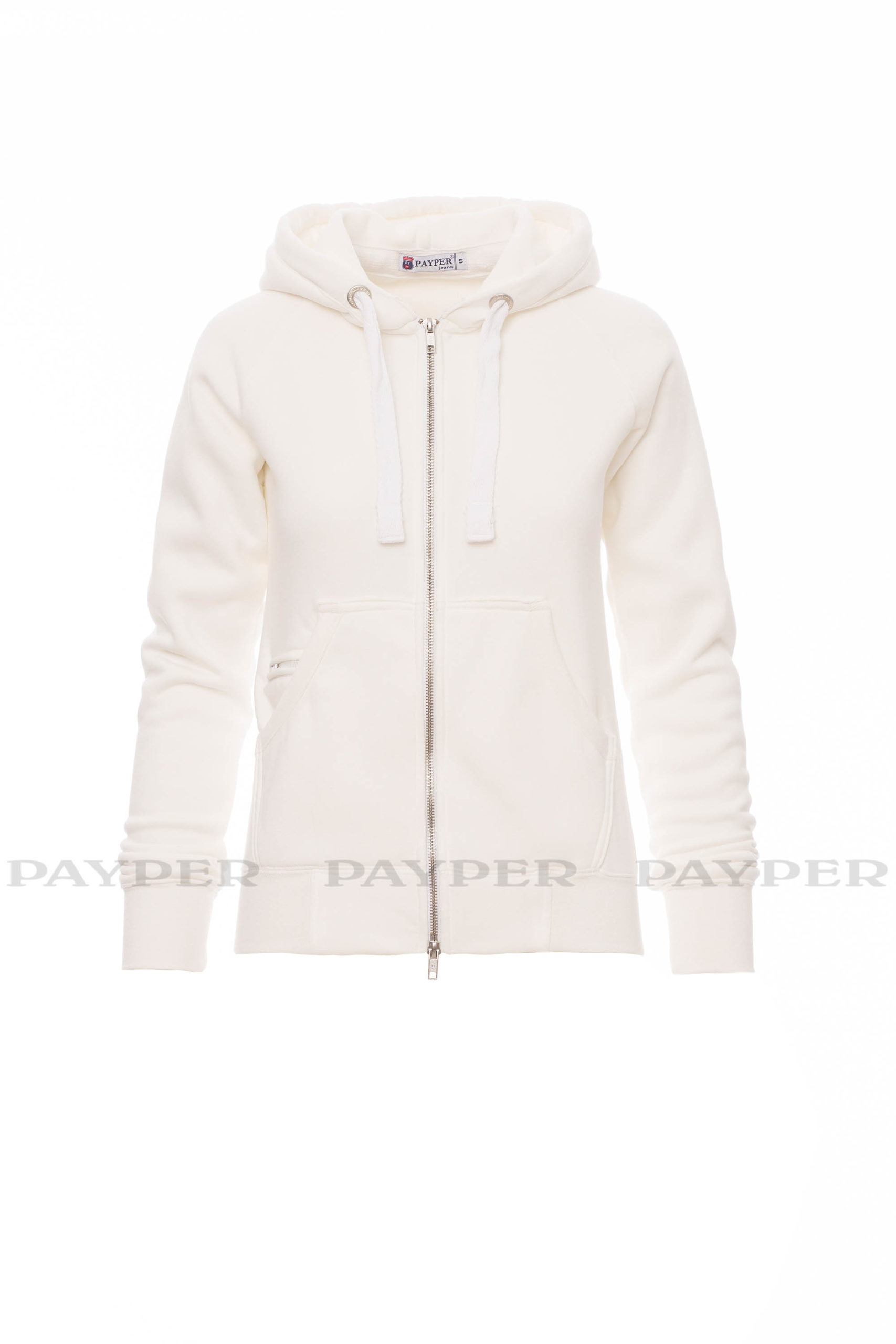 Taillierte Damen-Sweatjacke mit durchgehendem 2-Wege-Reißverschluss aus Metall, Raglanärmeln, Kapuze mit weißem Kordelzug, Nähten Ton-in-Ton und Metallösen, Kängurutaschen, Reißverschlusstäschchen und Öffnung für Mp3- oder Handykabel, elastischem Feinripp an Ärmeln und Taille, verstärkten Nähten. Effekt weiß-meliert (schwarz beim bordeauxfarbenen Modell).