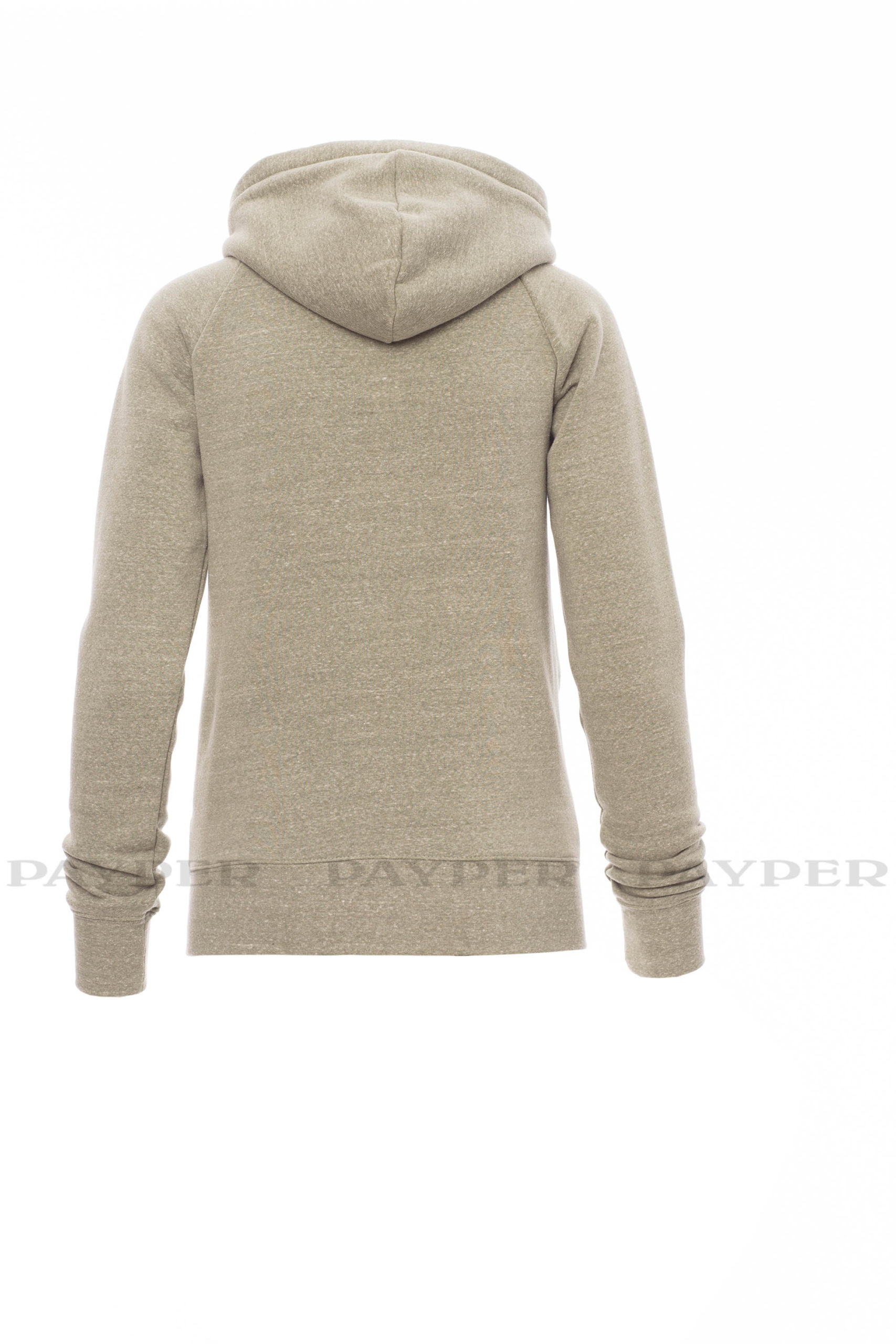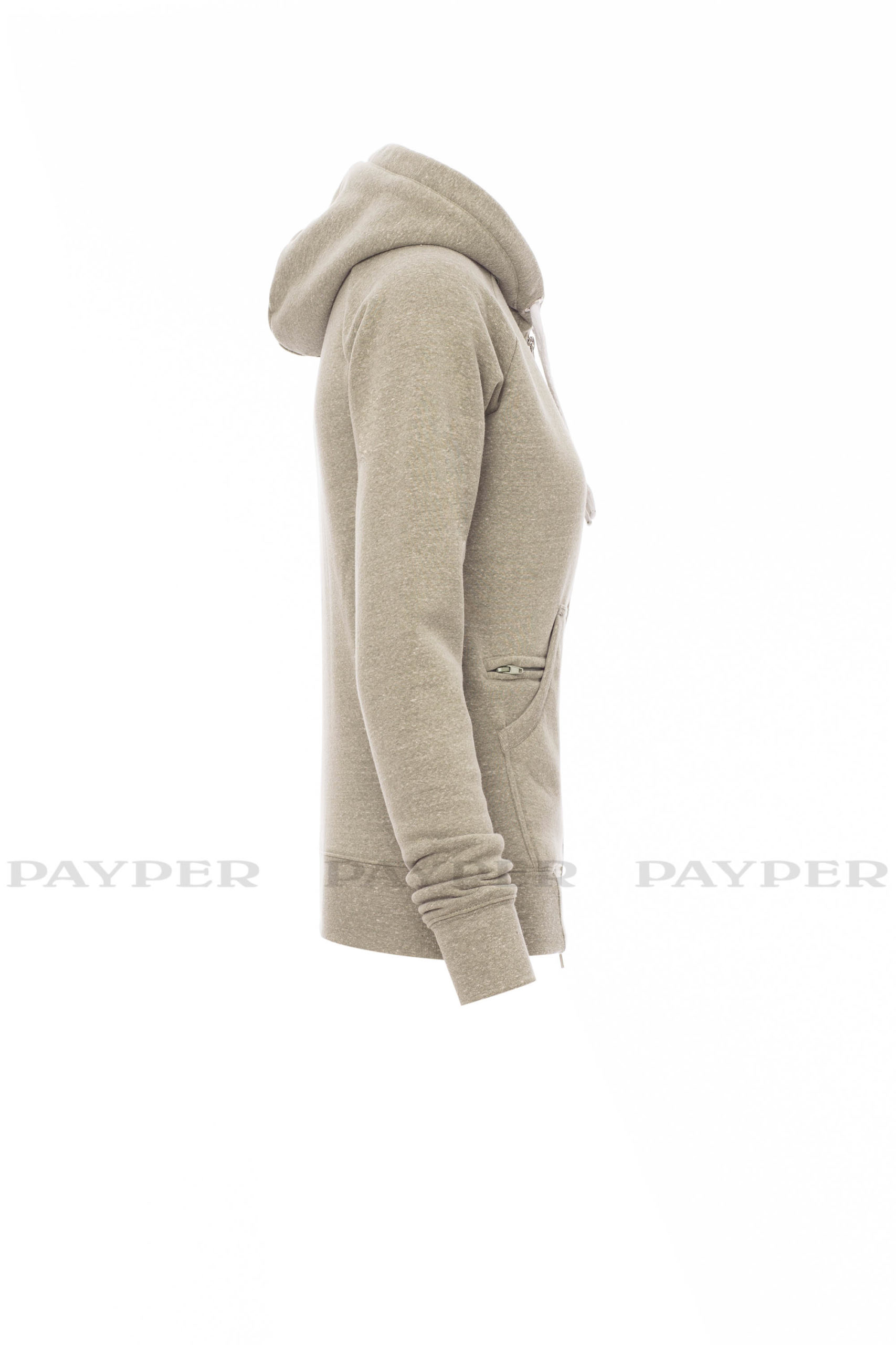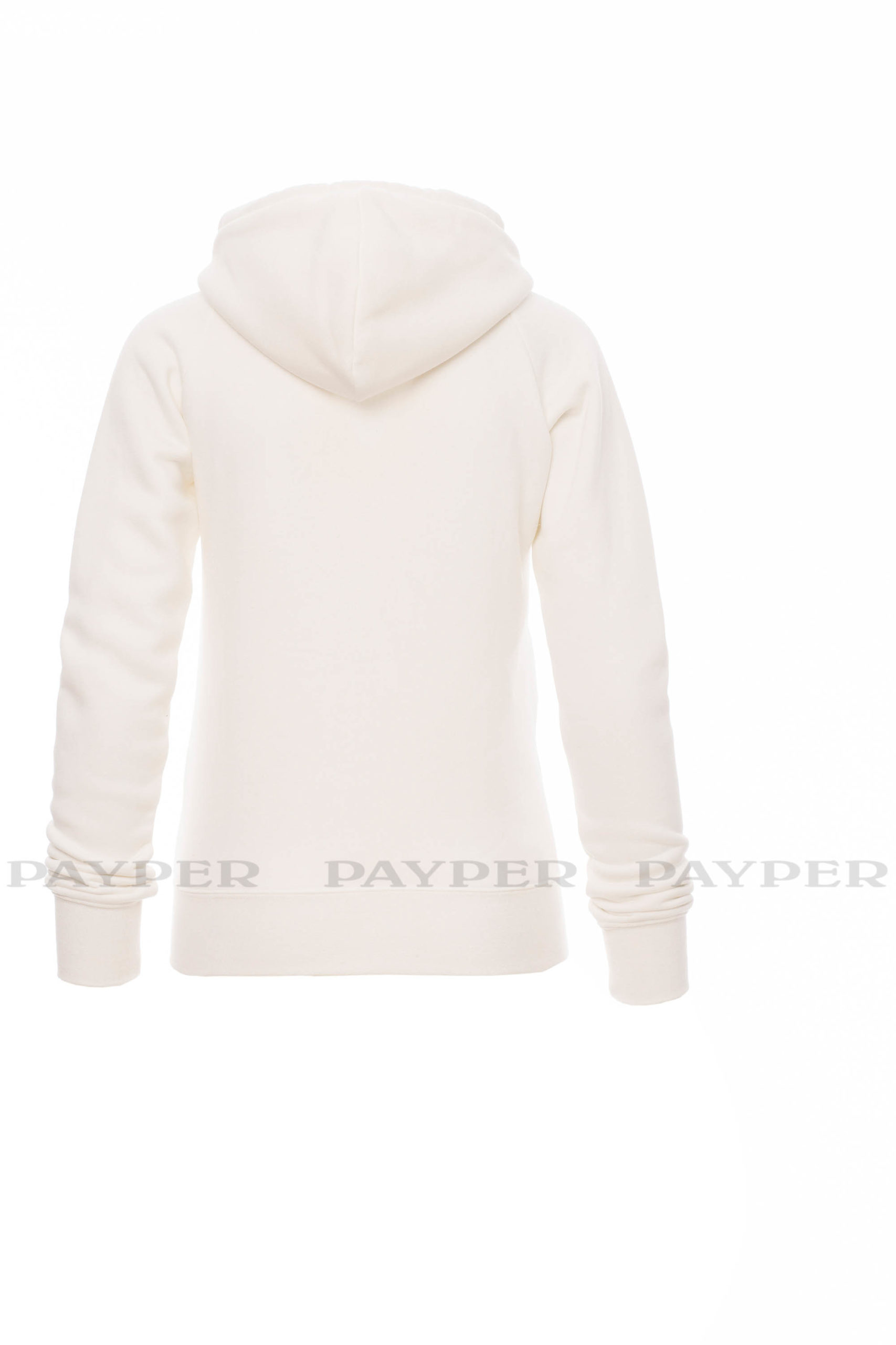 Taillierte Damen-Sweatjacke mit durchgehendem 2-Wege-Reißverschluss aus Metall, Raglanärmeln, Kapuze mit weißem Kordelzug, Nähten Ton-in-Ton und Metallösen, Kängurutaschen, Reißverschlusstäschchen und Öffnung für Mp3- oder Handykabel, elastischem Feinripp an Ärmeln und Taille, verstärkten Nähten. Effekt weiß-meliert (schwarz beim bordeauxfarbenen Modell).