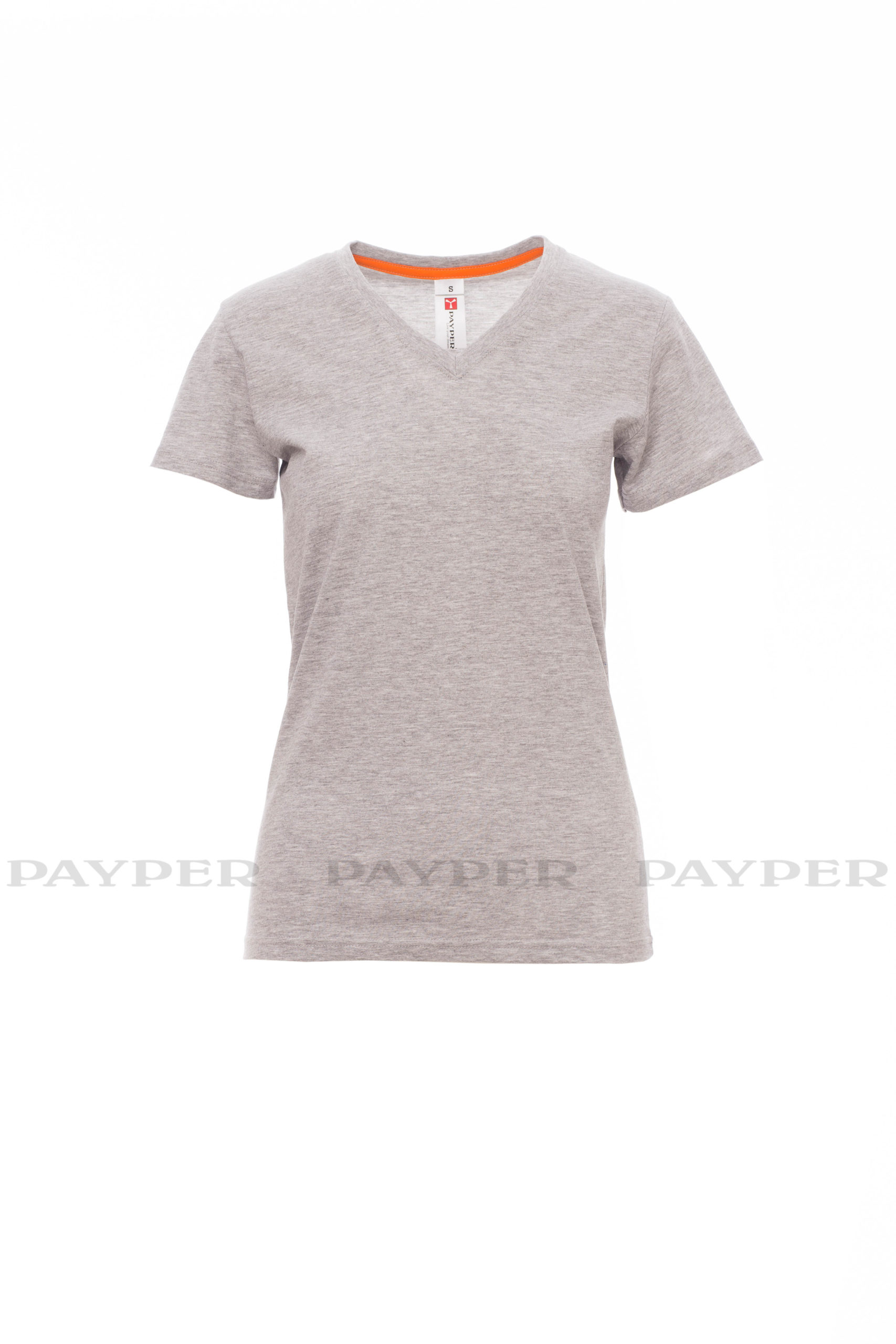 Tailliertes Damen-T-Shirt mit V-Ausschnitt, kurzärmelig, Feinripp-Kragen 1,5 cm aus Spandex-Mischgewebe mit Kappnaht an der Vorderseite, Verstärkungsband in Kontrastfarbe von Schulter zu Schulter, das im Kragen sichtbar ist, Stretchnähten, Seitennaht