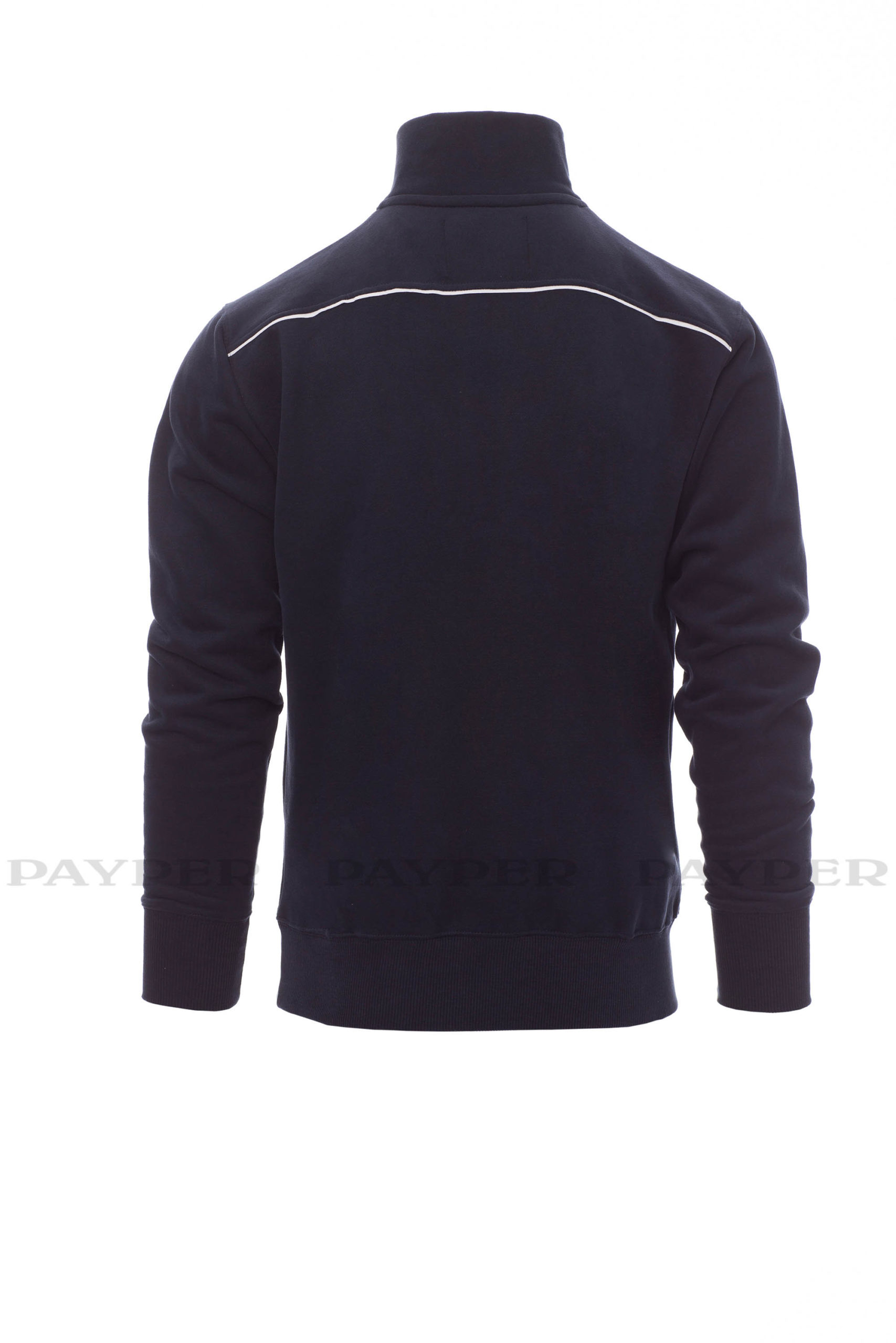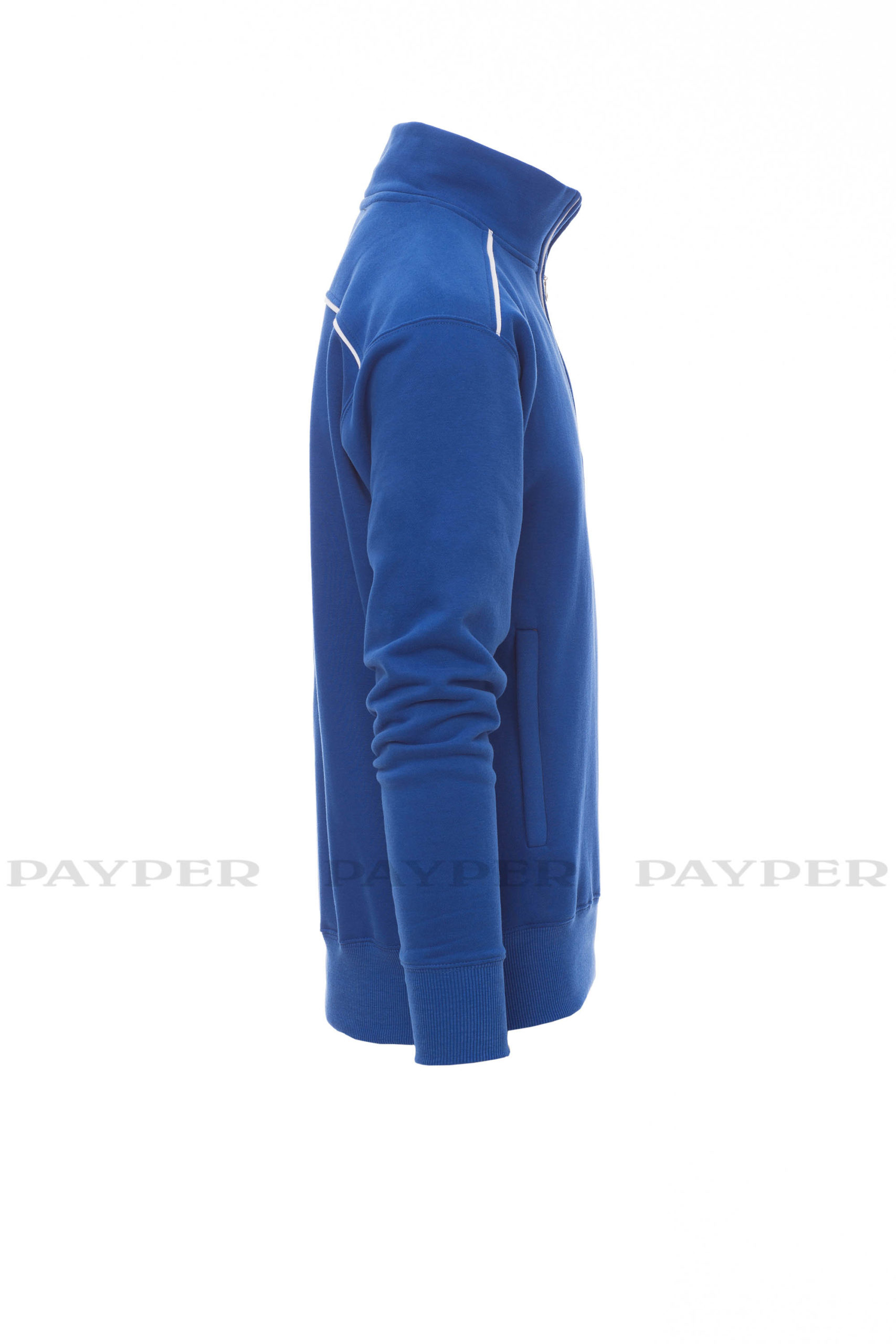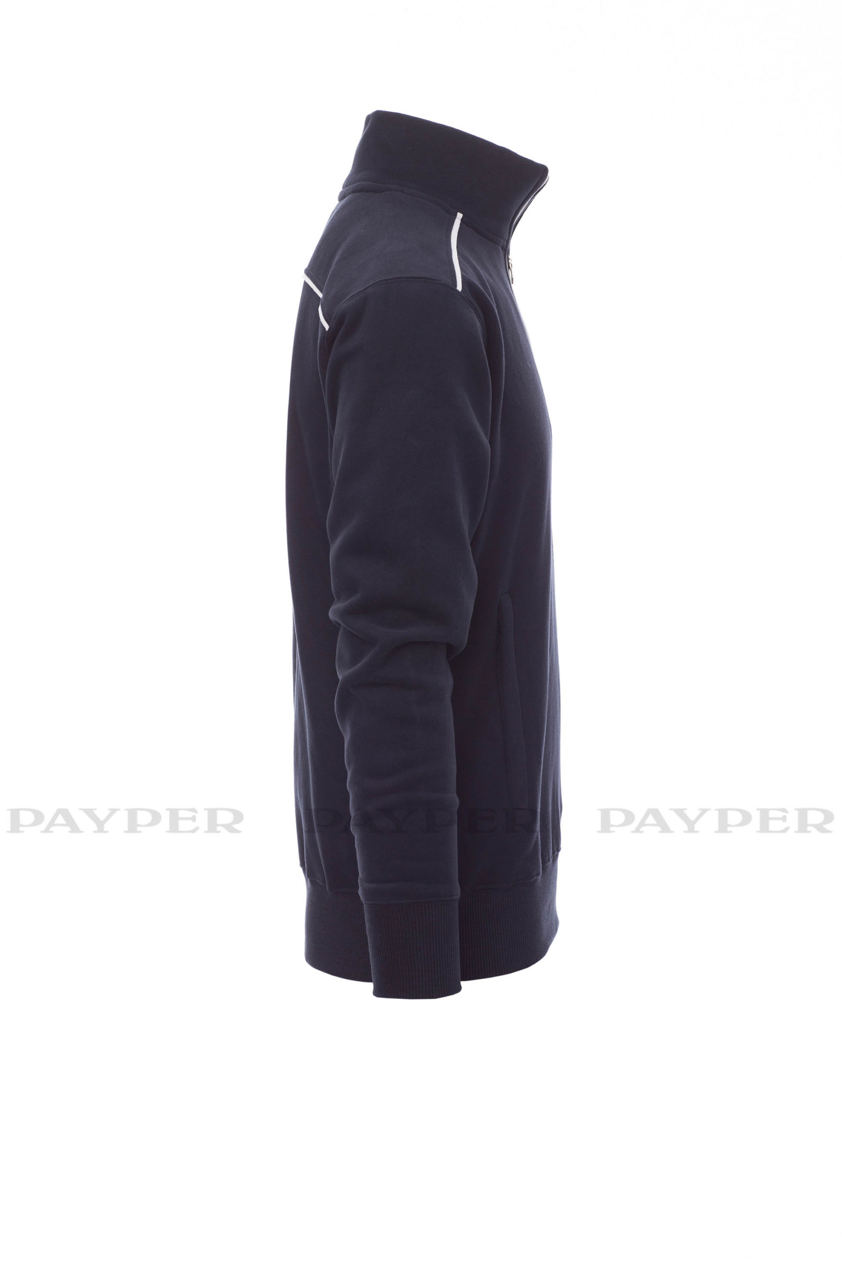 Sweatshirt mit kurzem gleichfarbigem Reißverschluss aus Kunststoff mit Metallschieber, kontrastfarbiger Einfassung an den Schultern, am Reißverschlussrand und auf dem Rücken, zwei Reißverschlusstaschen, elastischem Feinripp an Ärmeln und Taille