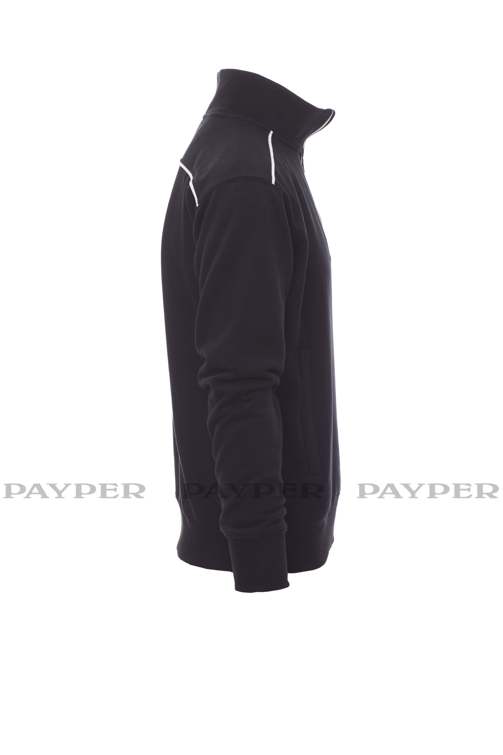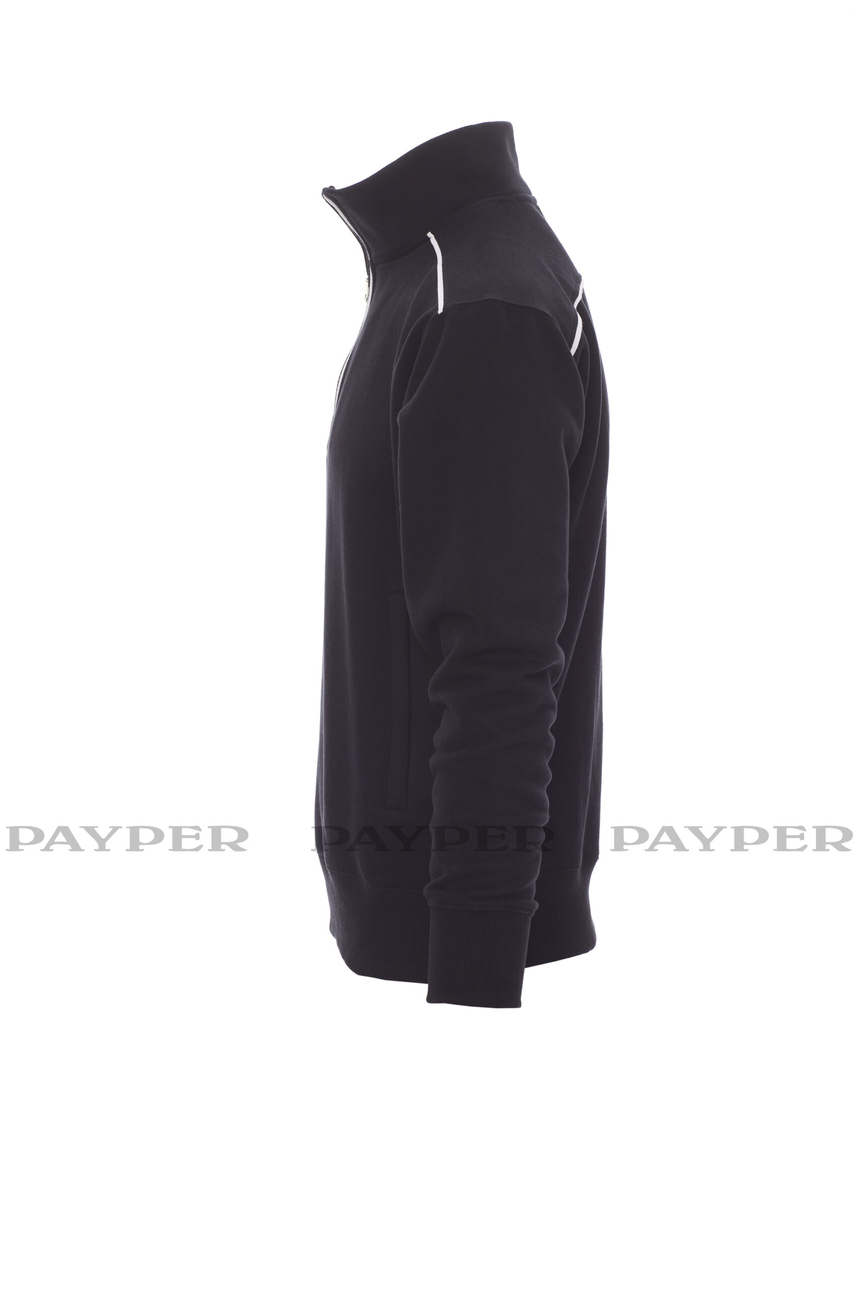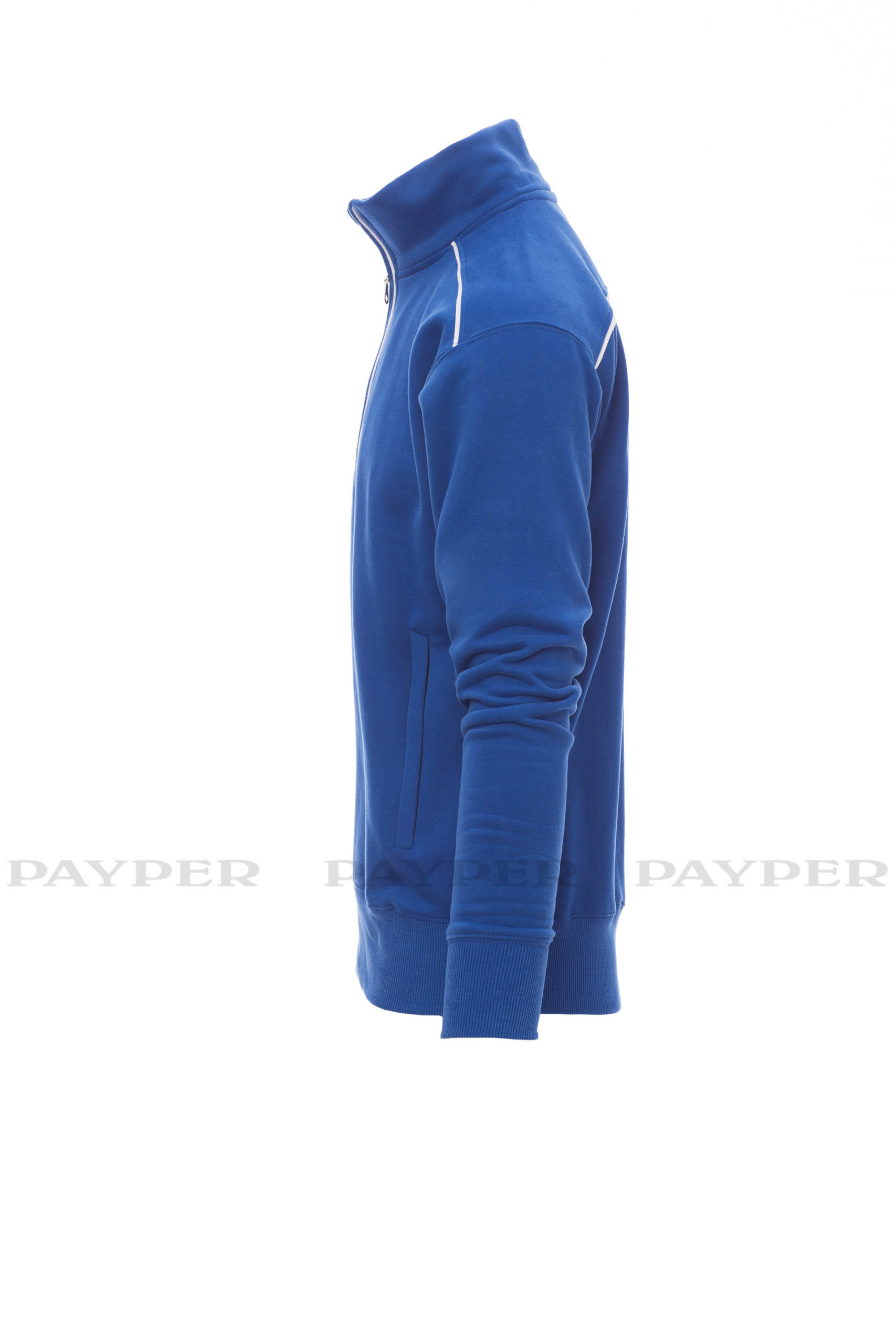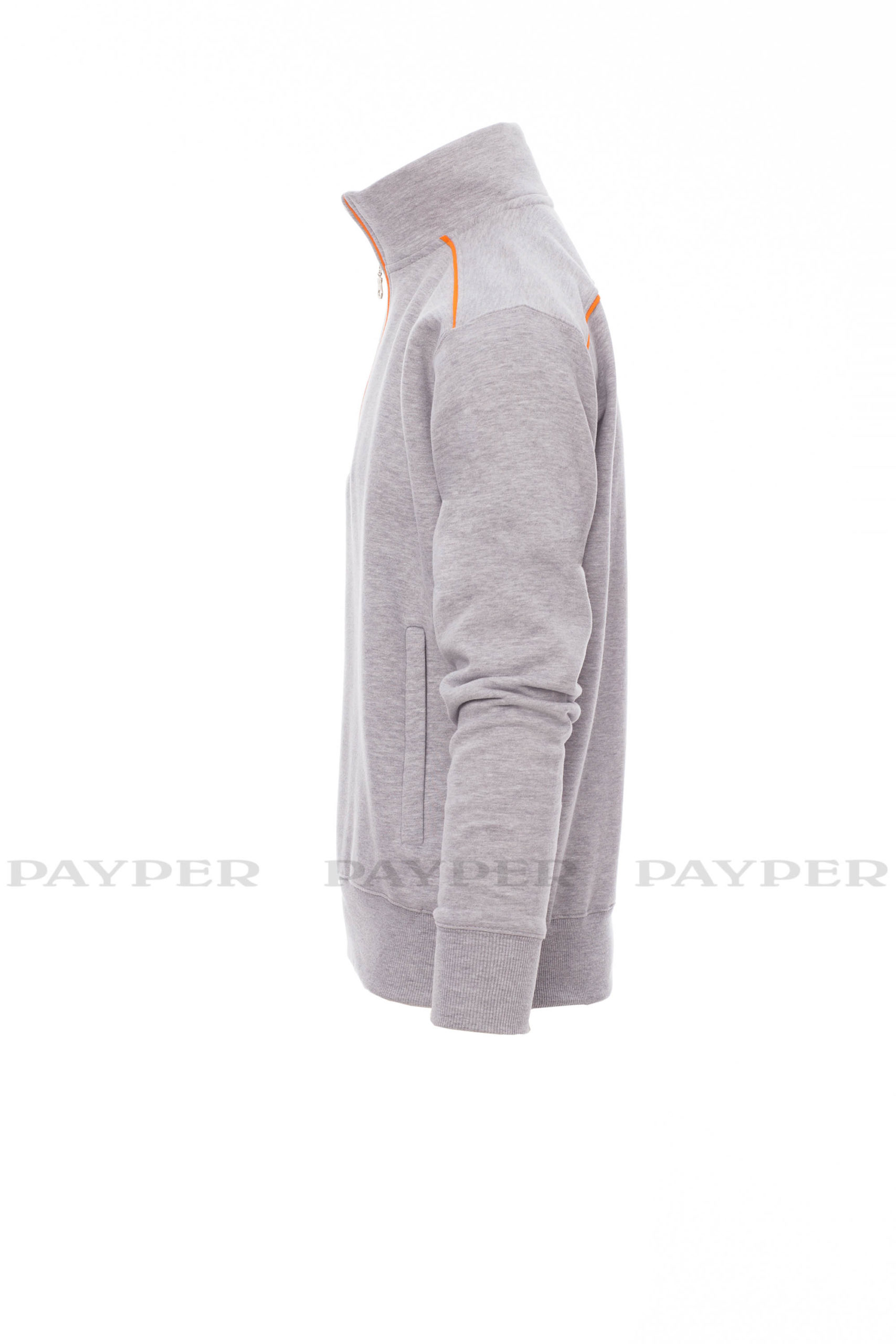 Sweatshirt mit kurzem gleichfarbigem Reißverschluss aus Kunststoff mit Metallschieber, kontrastfarbiger Einfassung an den Schultern, am Reißverschlussrand und auf dem Rücken, zwei Reißverschlusstaschen, elastischem Feinripp an Ärmeln und Taille
