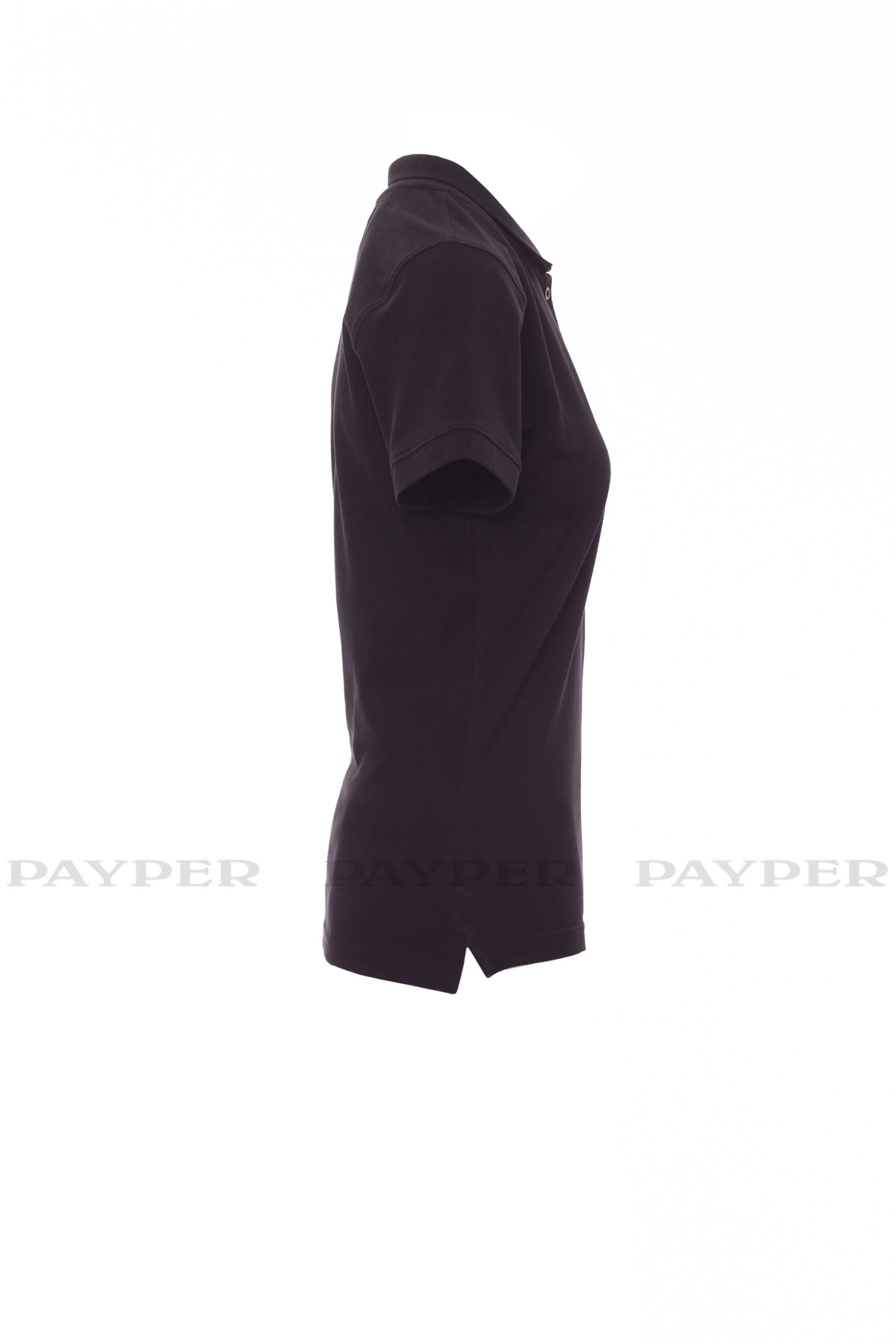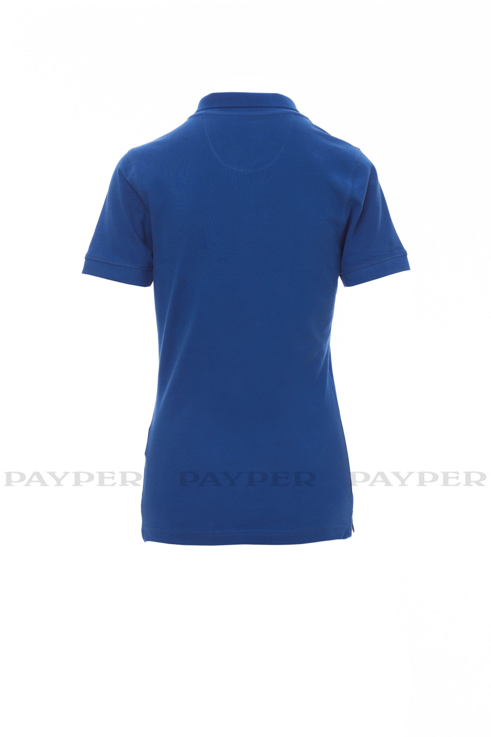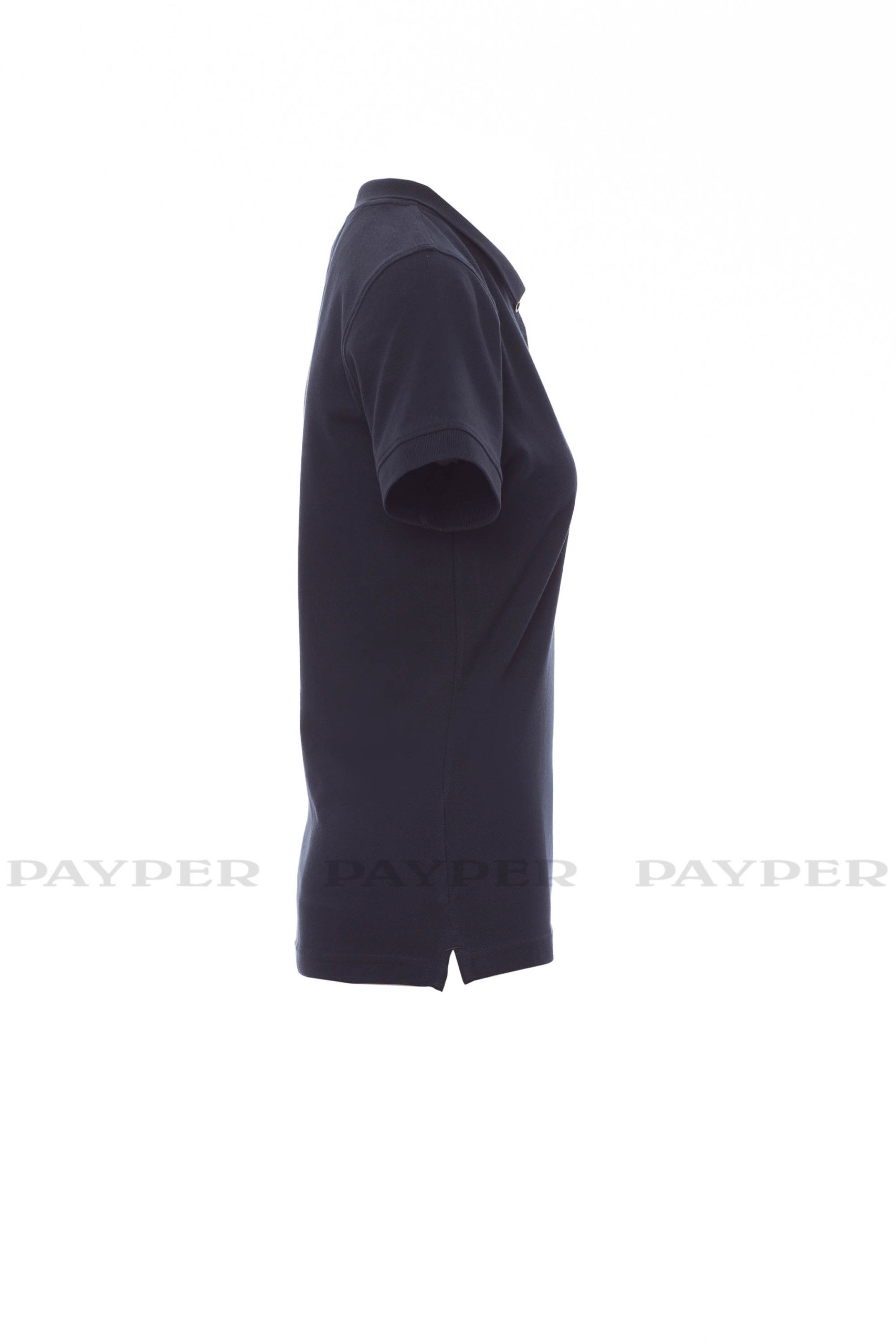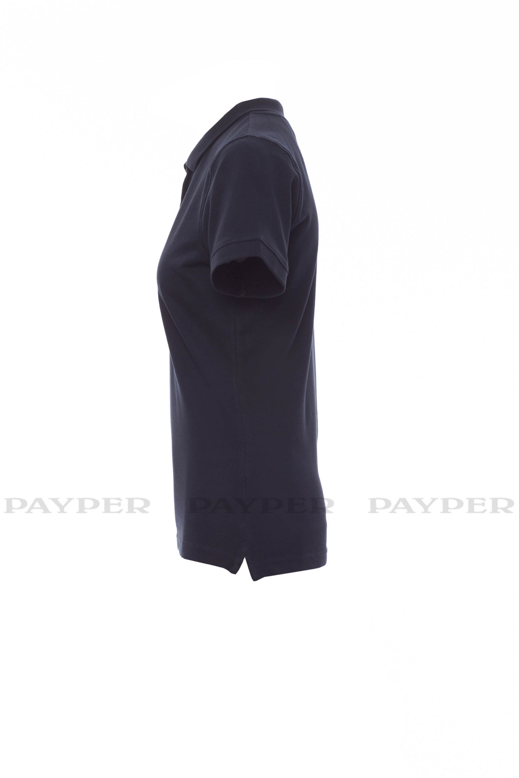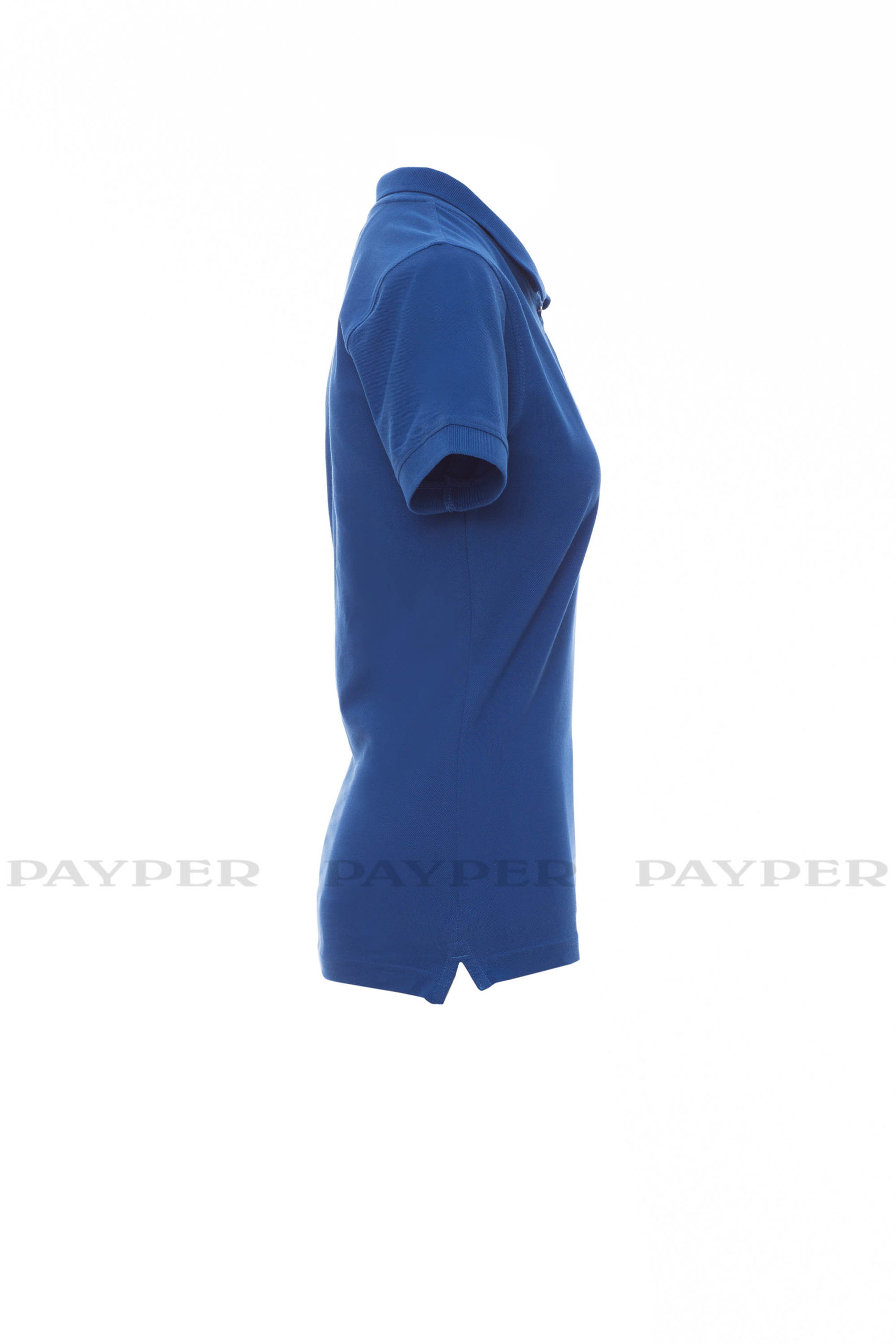Tailliertes Damen-Poloshirt, kurzärmelig, mit 4 Knöpfen Ton-in-Ton mit Perlmutteffekt, Kragen und Ärmelrand aus Feinripp, Seitenschlitzen, Nackenband in Kontrastfarbe, Stretchnähten, seitlichem Verstärkungsband, Nackensattel.