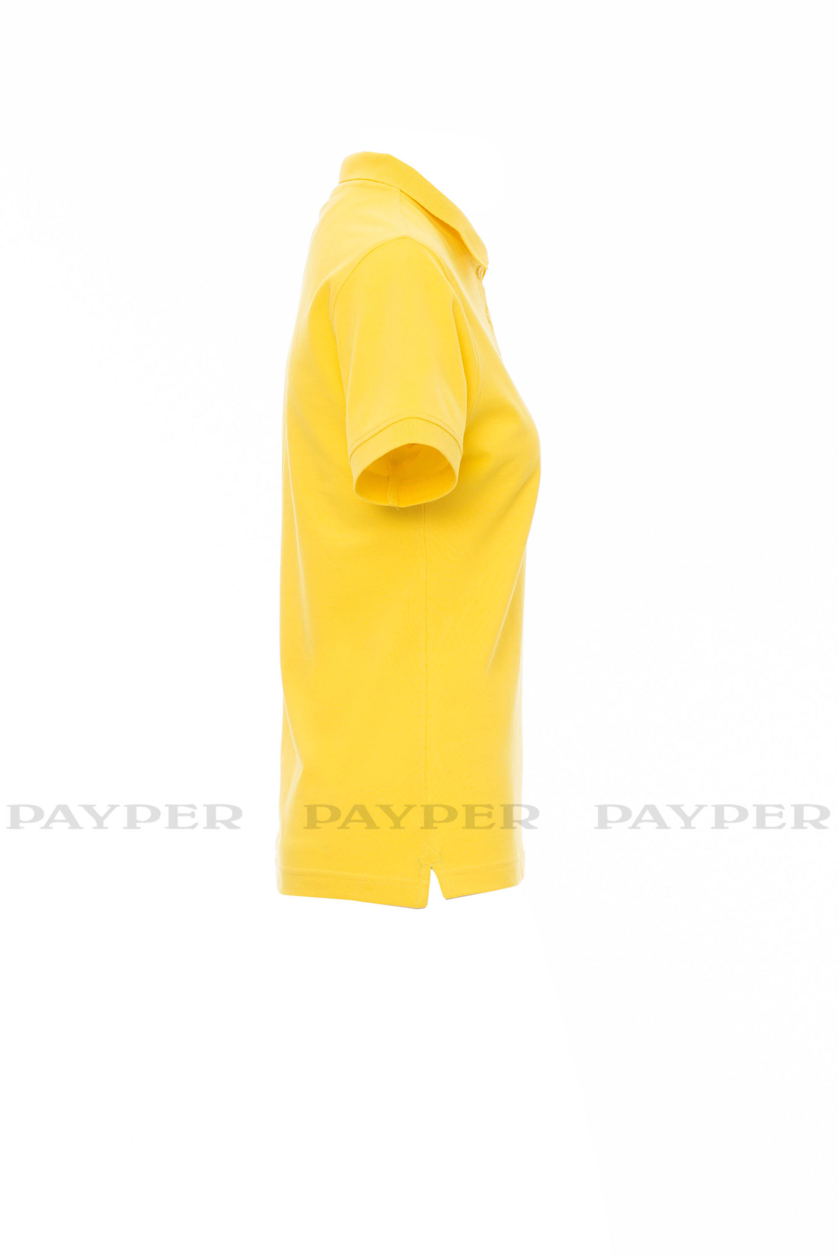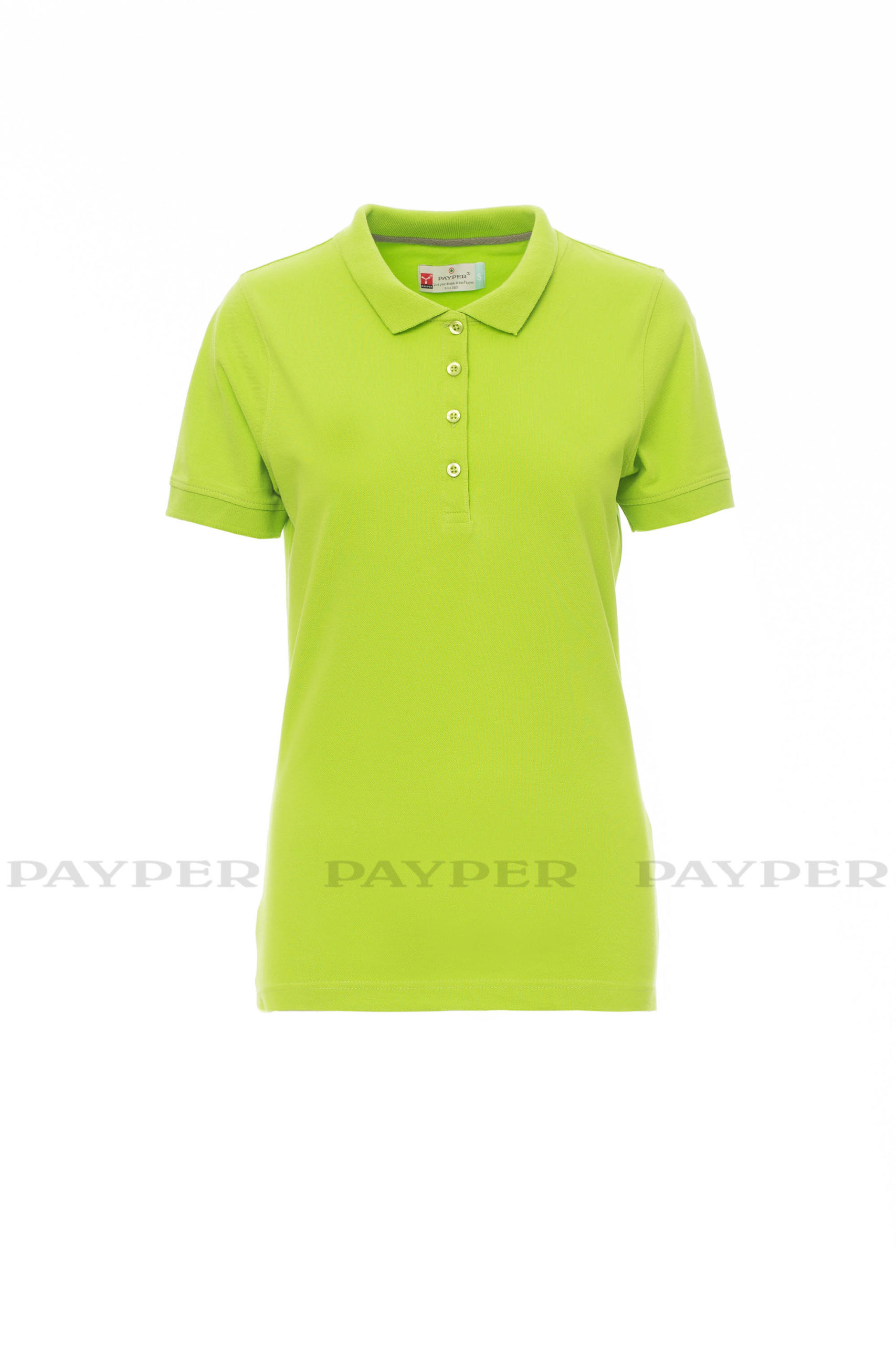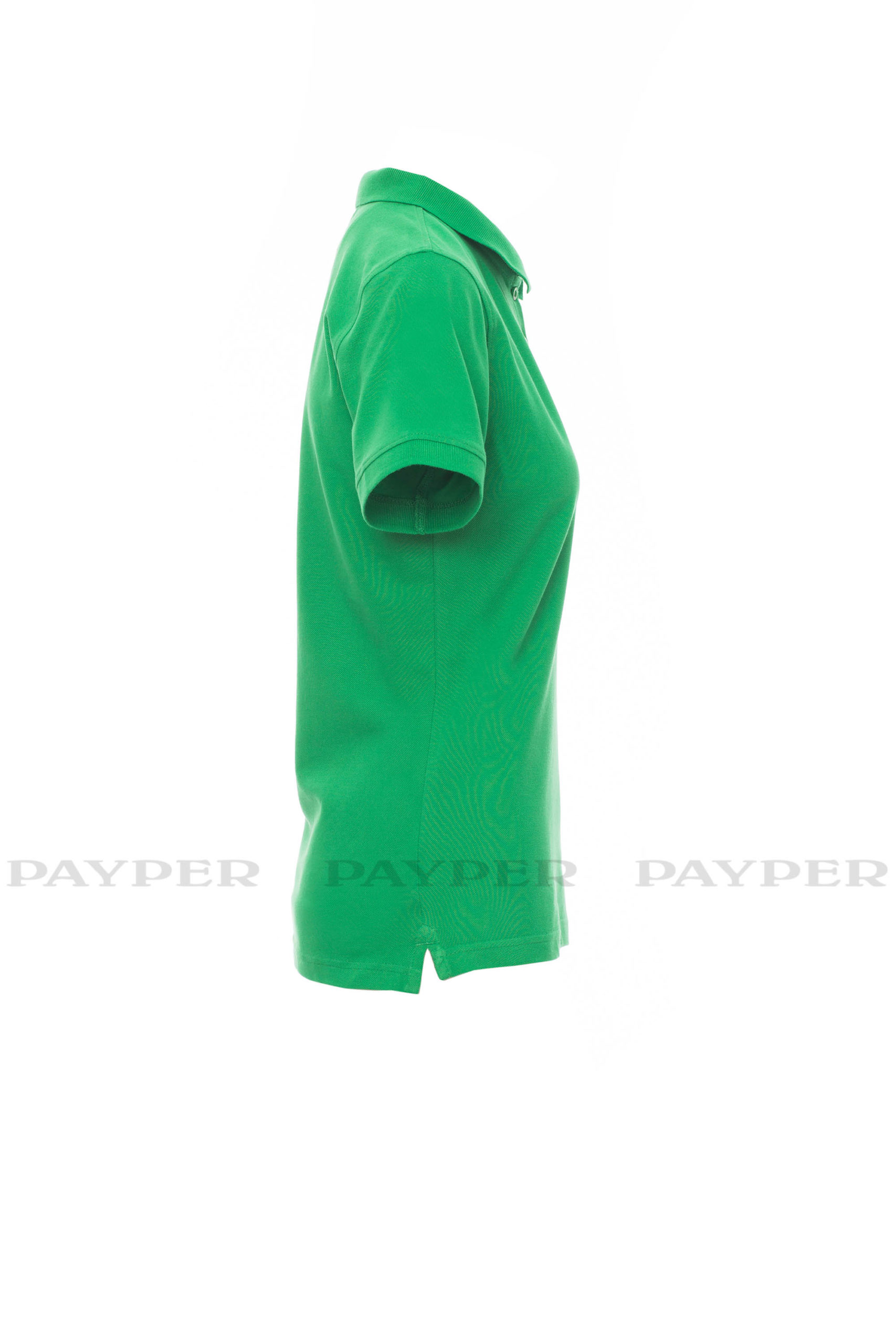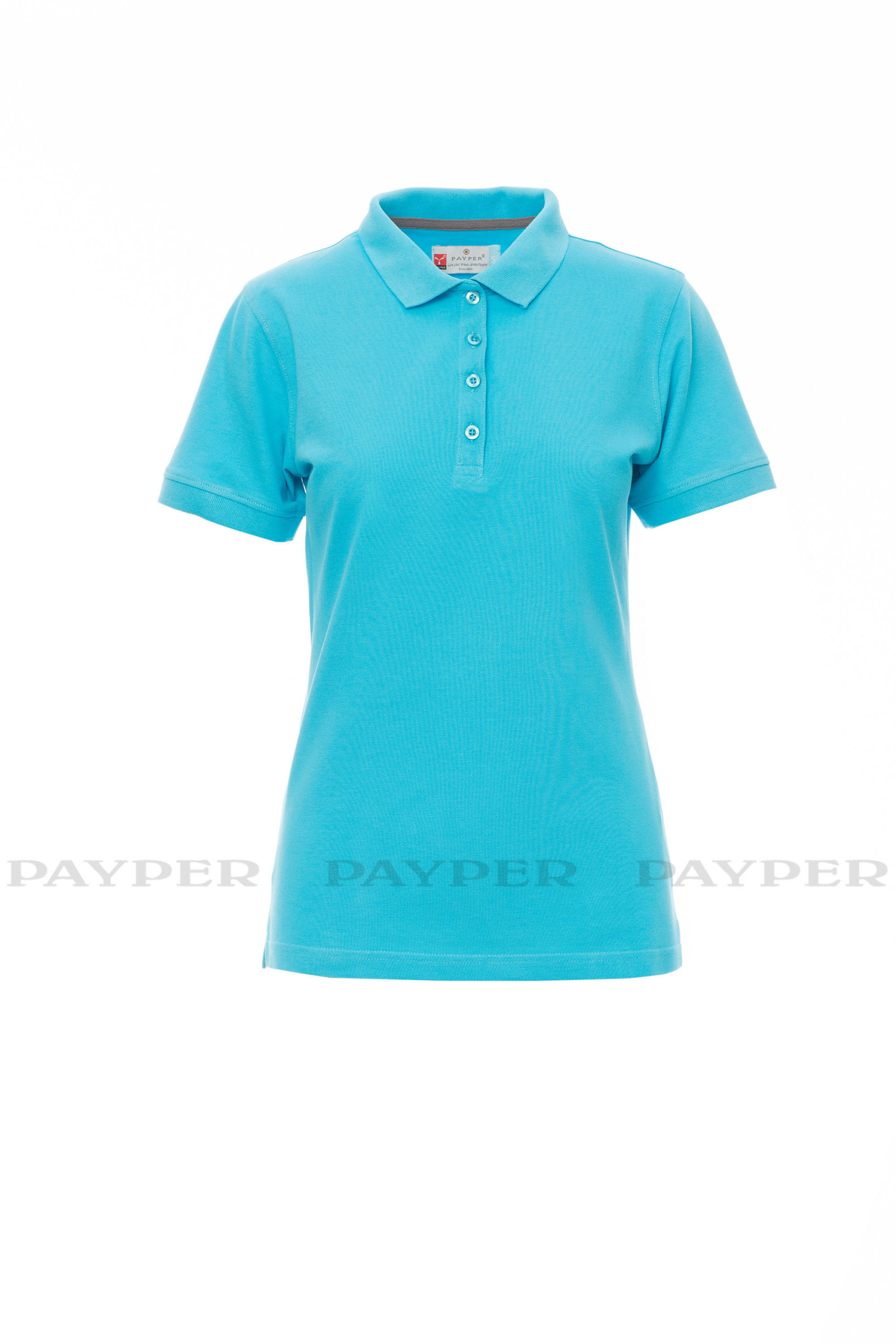 Tailliertes Damen-Poloshirt, kurzärmelig, mit 4 Knöpfen Ton-in-Ton mit Perlmutteffekt, Kragen und Ärmelrand aus Feinripp, Seitenschlitzen, Nackenband in Kontrastfarbe, Stretchnähten, seitlichem Verstärkungsband, Nackensattel.