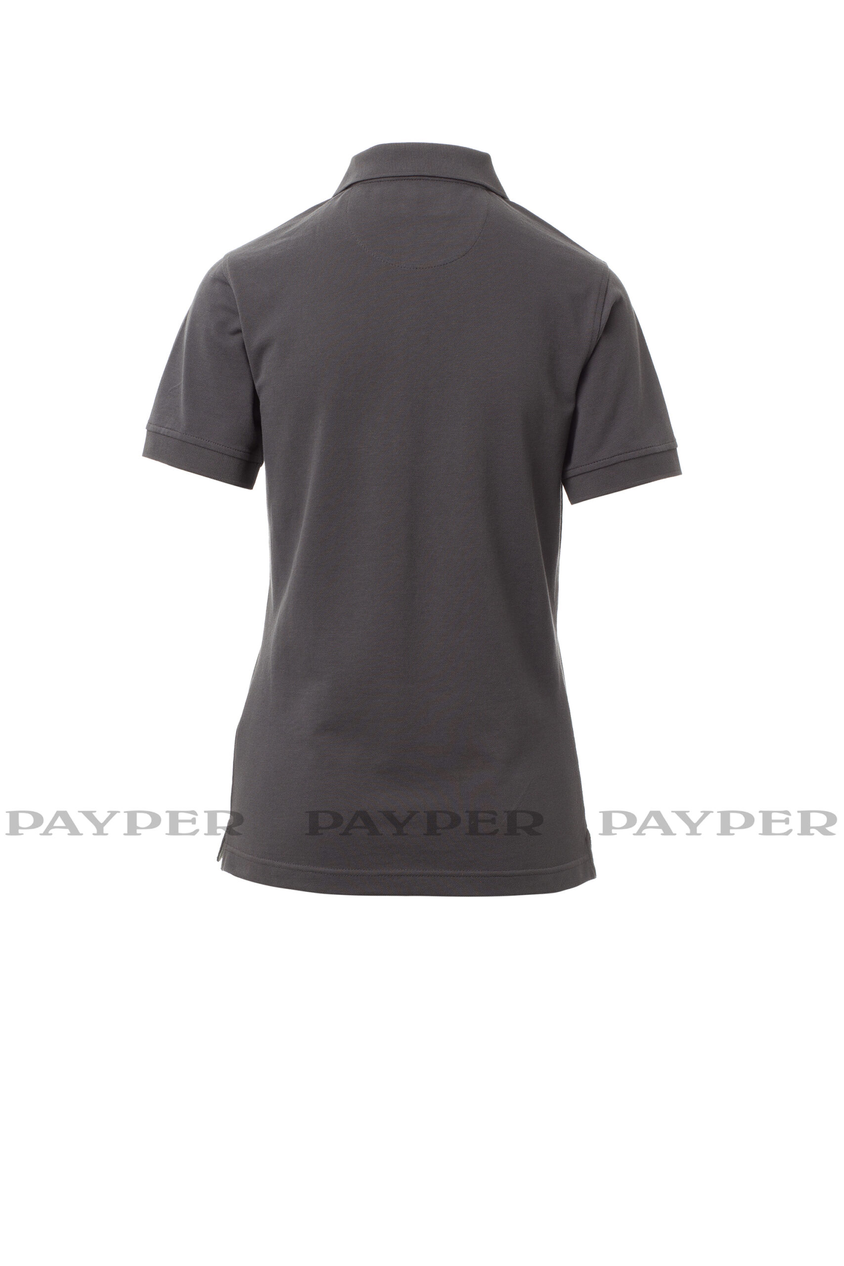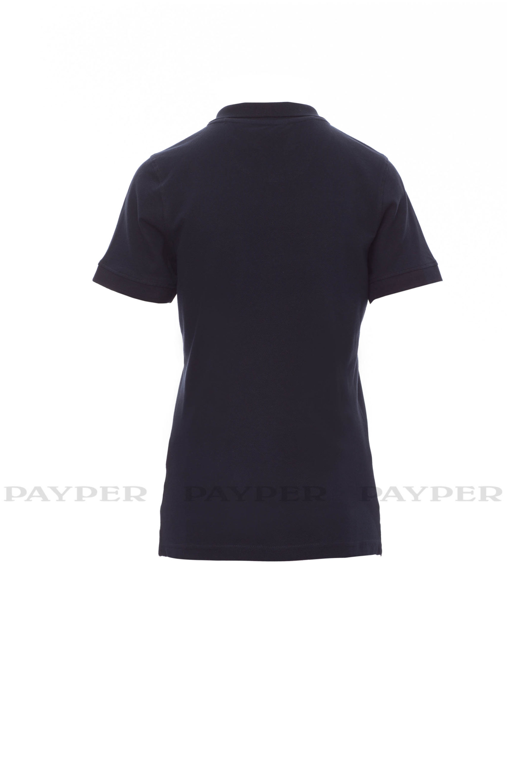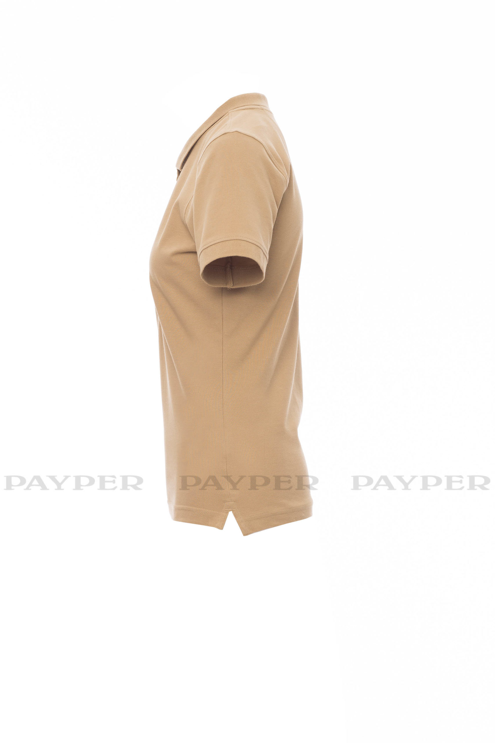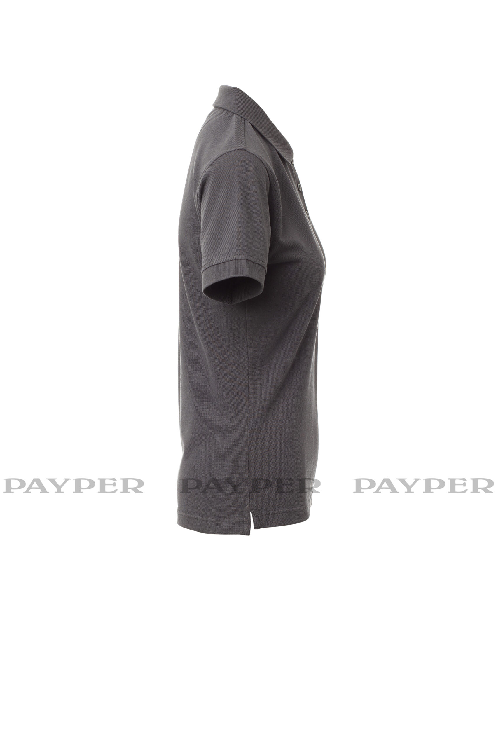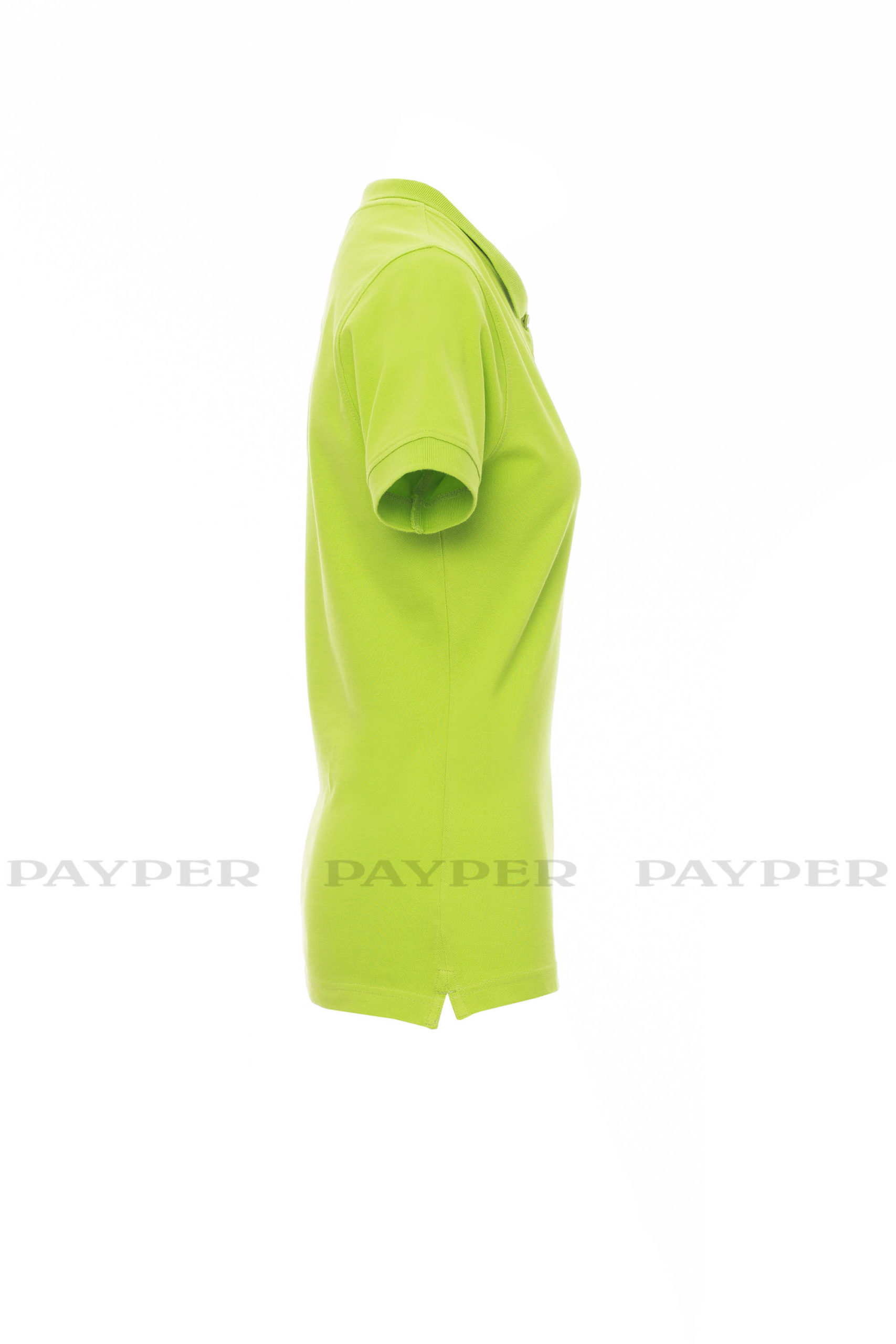 Tailliertes Damen-Poloshirt, kurzärmelig, mit 4 Knöpfen Ton-in-Ton mit Perlmutteffekt, Kragen und Ärmelrand aus Feinripp, Seitenschlitzen, Nackenband in Kontrastfarbe, Stretchnähten, seitlichem Verstärkungsband, Nackensattel.