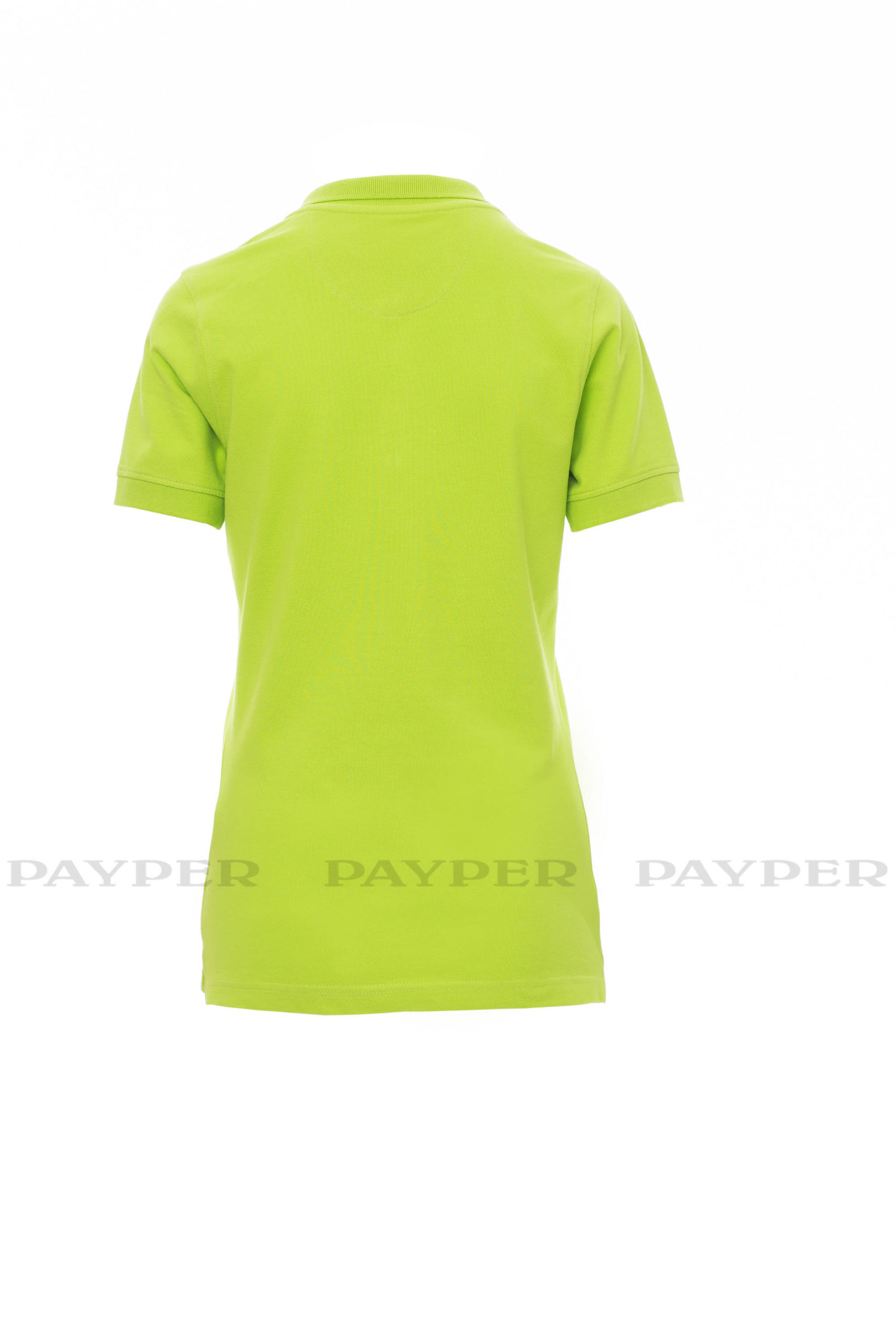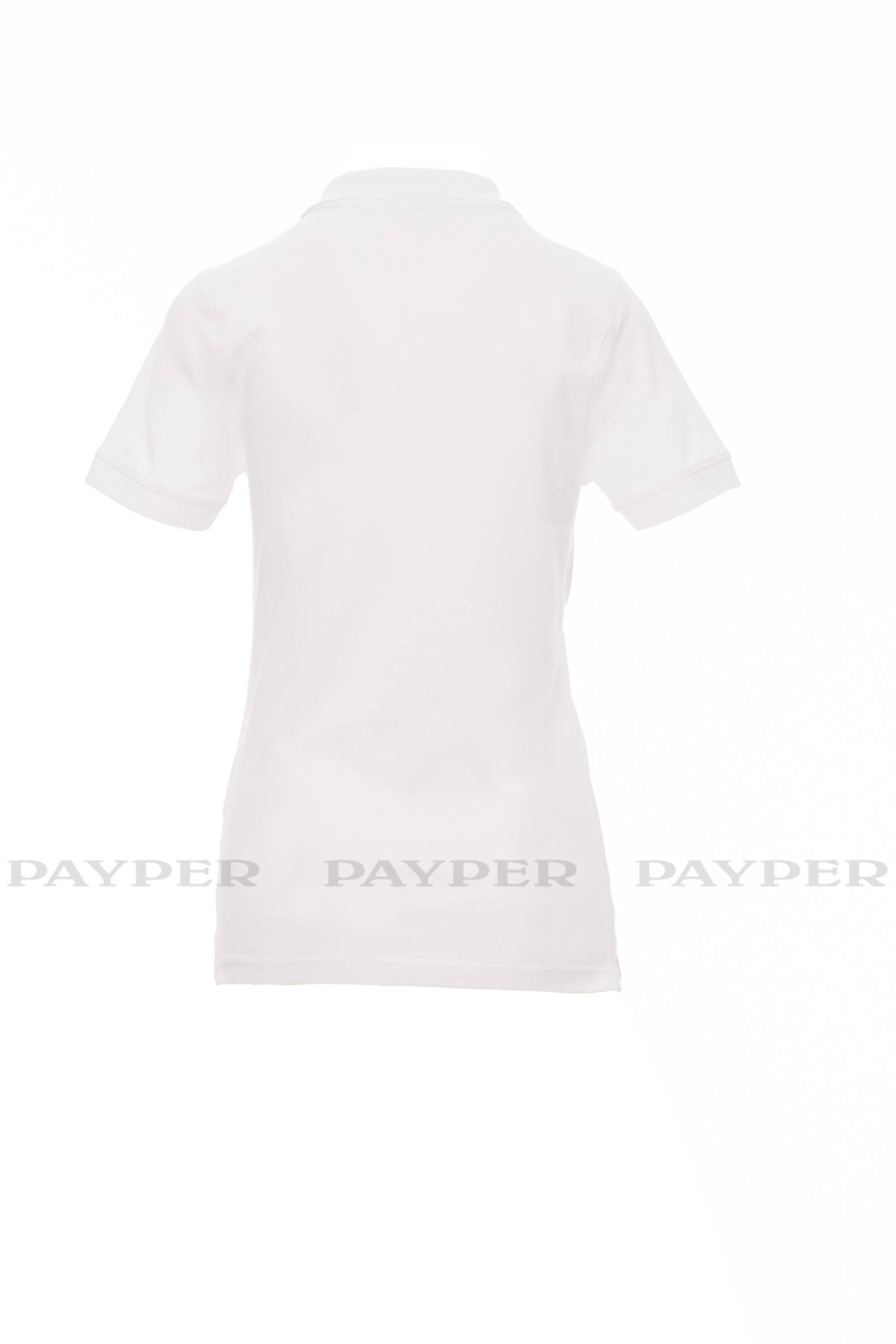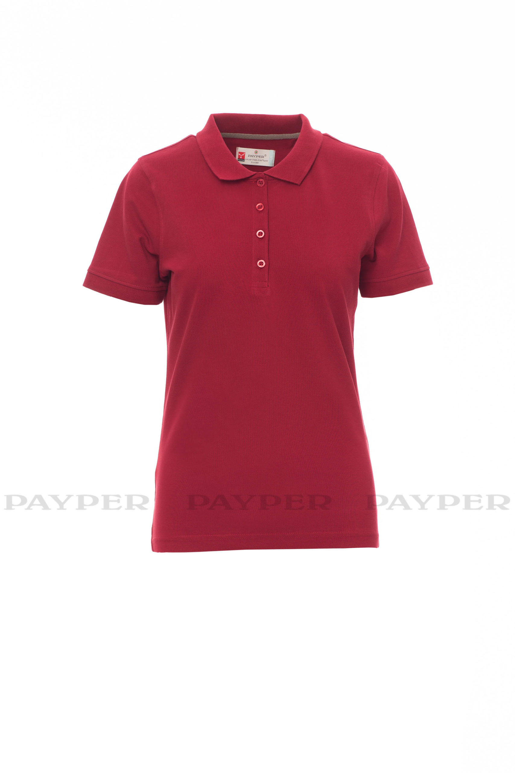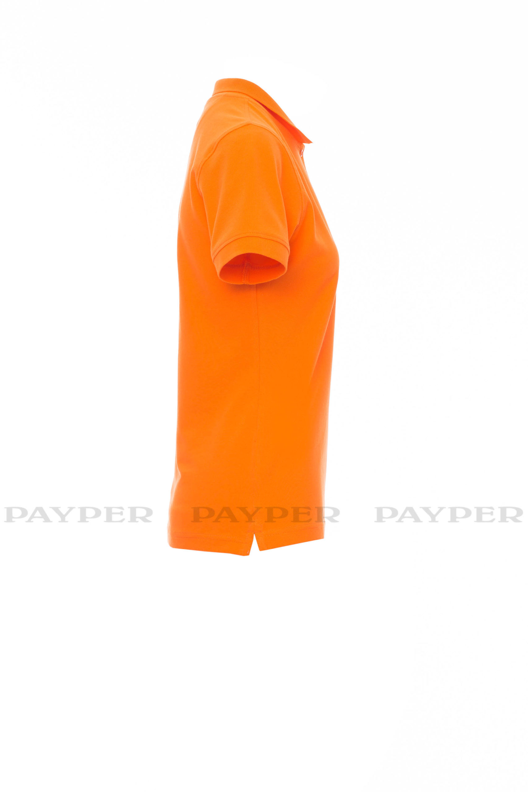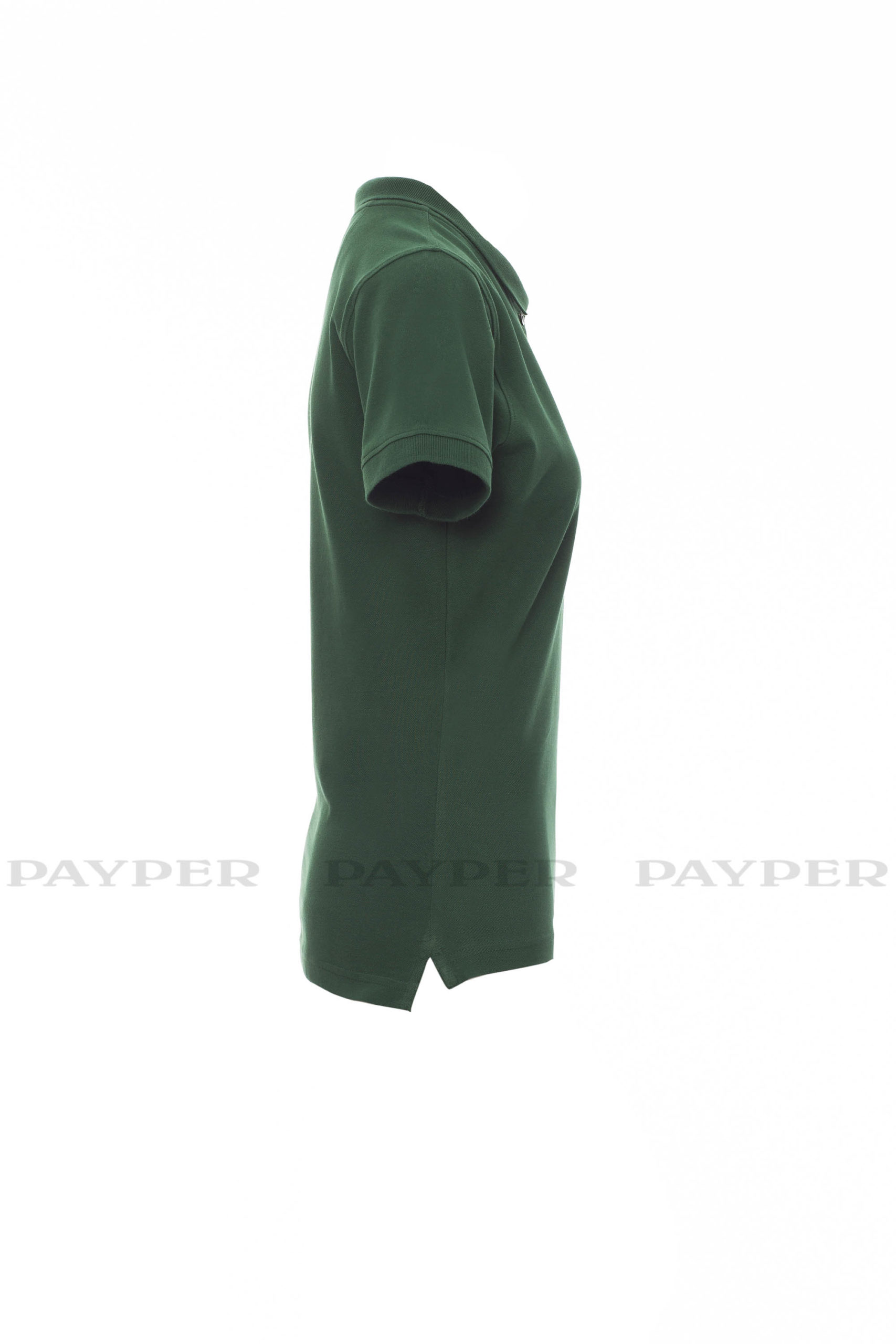 Tailliertes Damen-Poloshirt, kurzärmelig, mit 4 Knöpfen Ton-in-Ton mit Perlmutteffekt, Kragen und Ärmelrand aus Feinripp, Seitenschlitzen, Nackenband in Kontrastfarbe, Stretchnähten, seitlichem Verstärkungsband, Nackensattel.