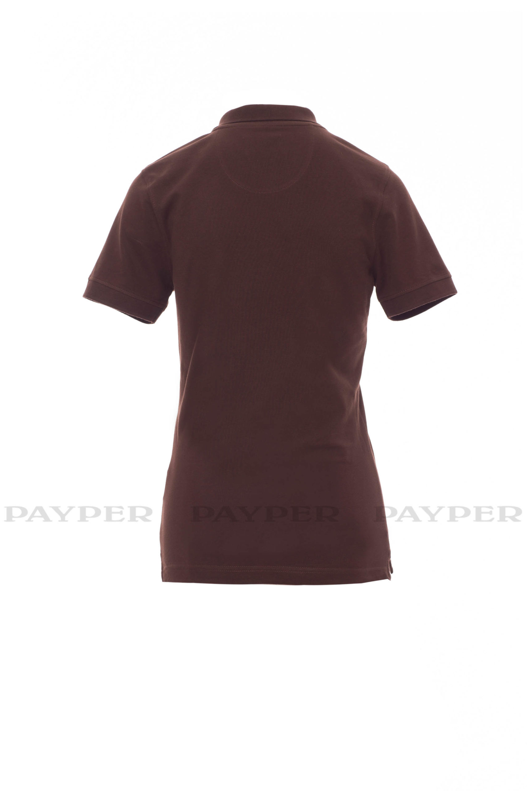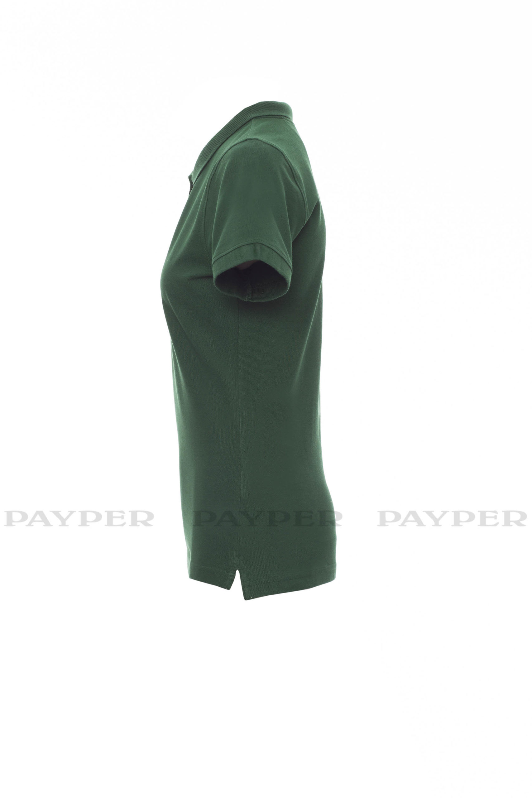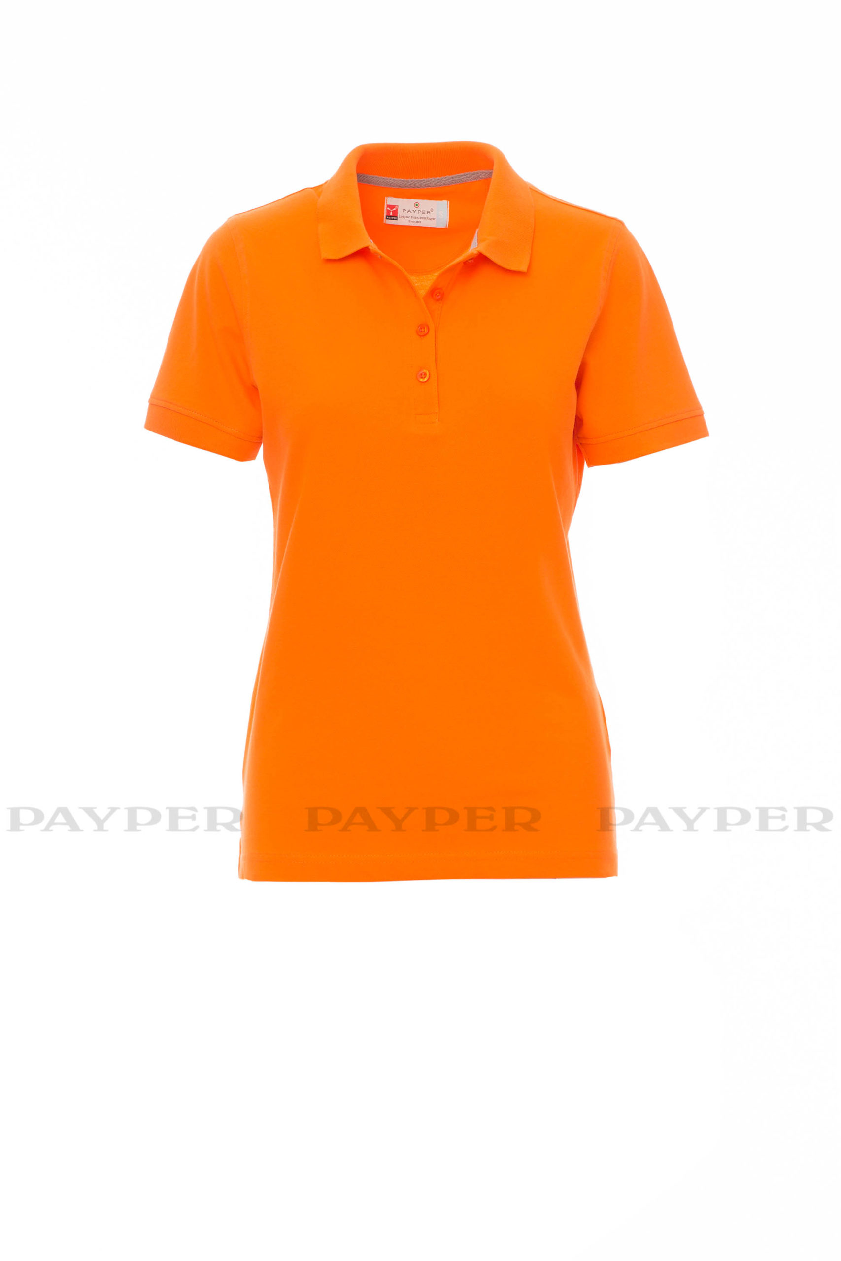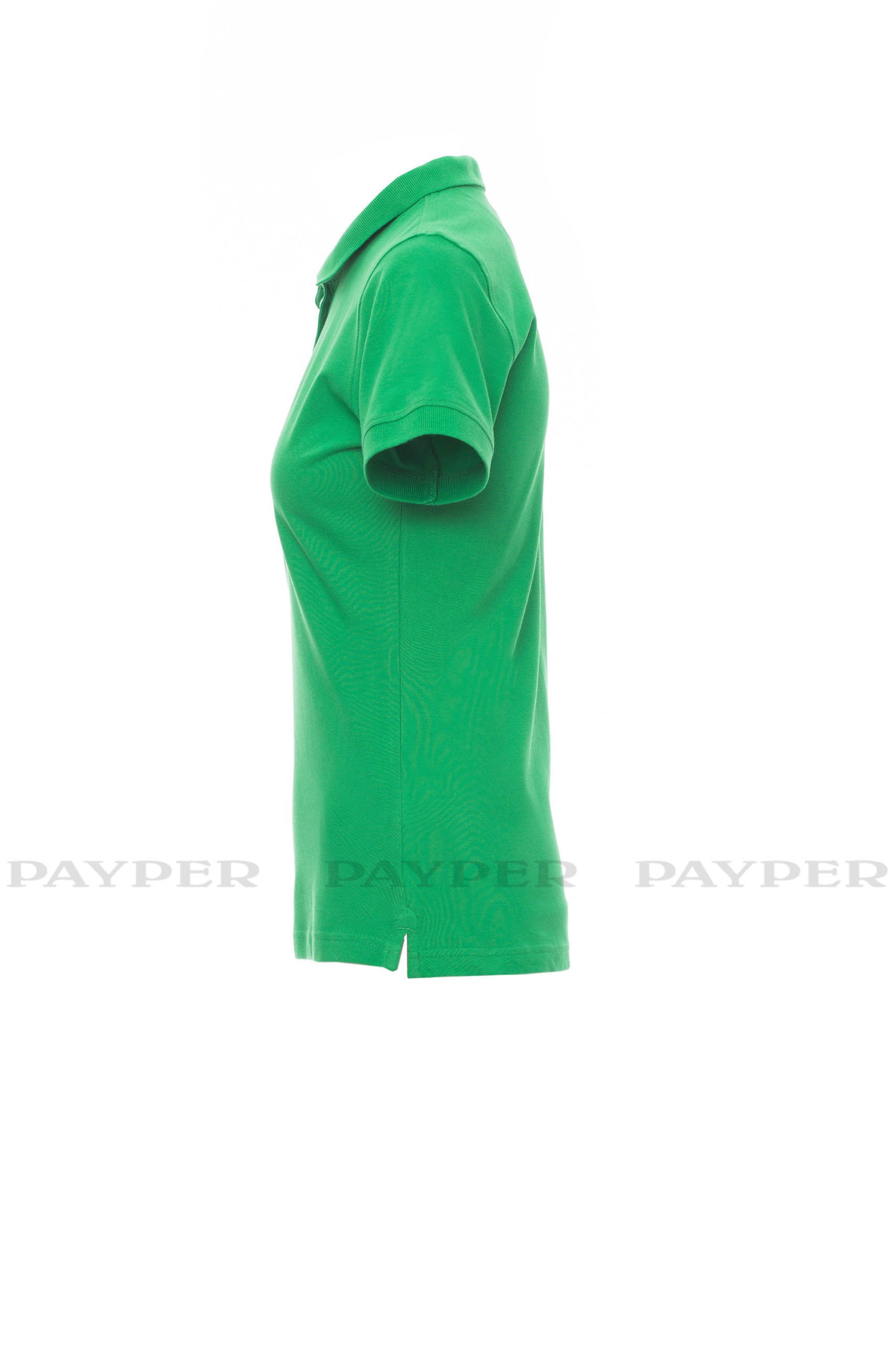 Tailliertes Damen-Poloshirt, kurzärmelig, mit 4 Knöpfen Ton-in-Ton mit Perlmutteffekt, Kragen und Ärmelrand aus Feinripp, Seitenschlitzen, Nackenband in Kontrastfarbe, Stretchnähten, seitlichem Verstärkungsband, Nackensattel.