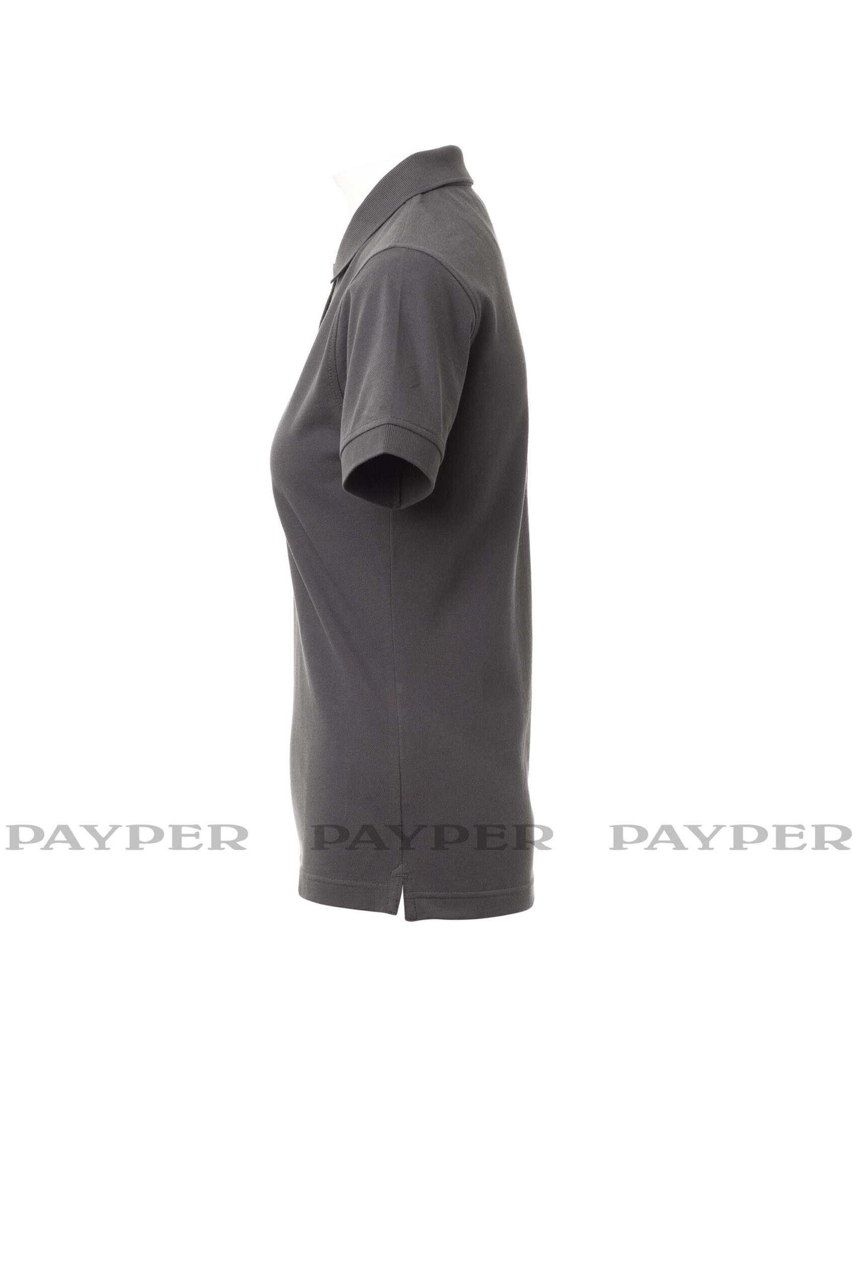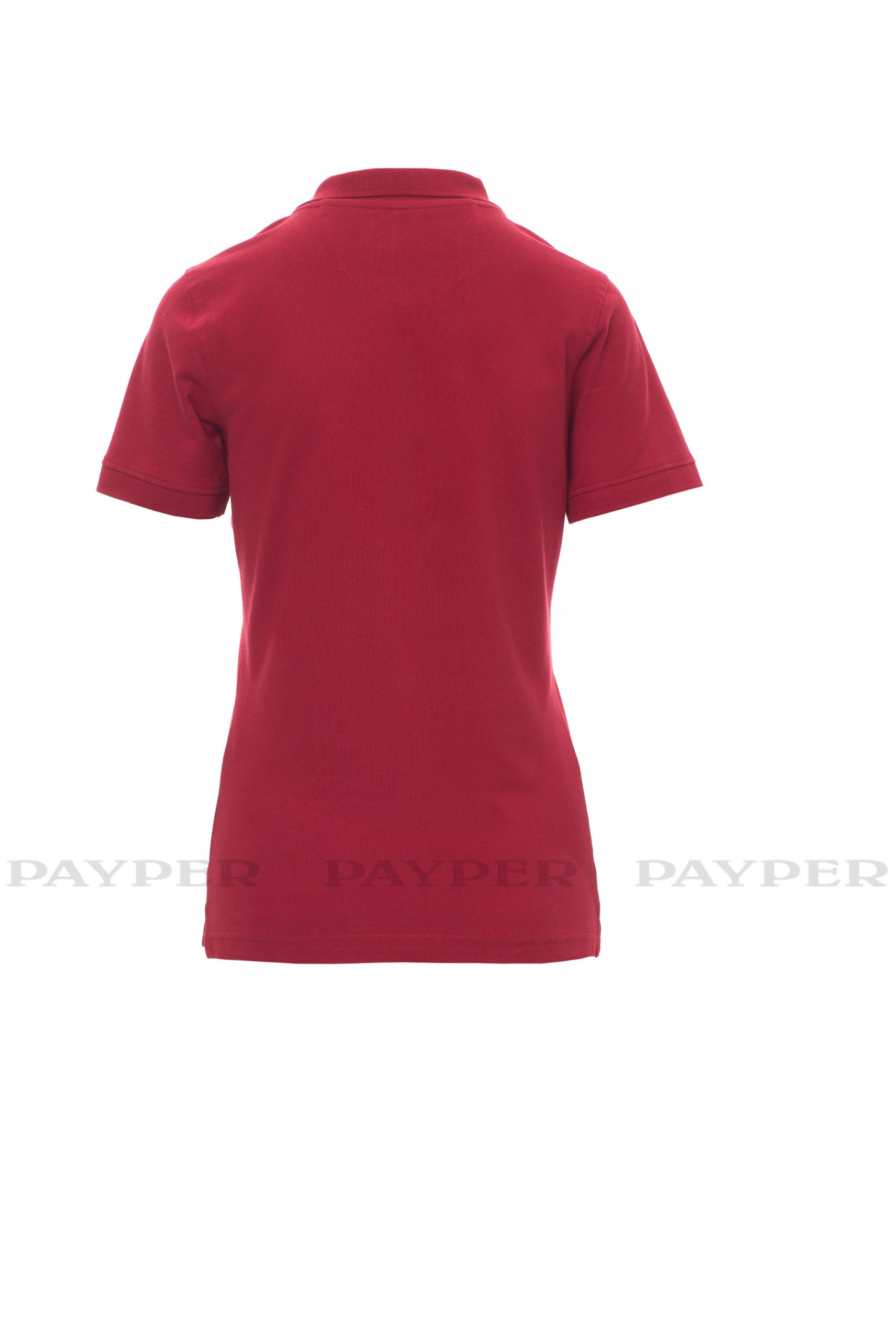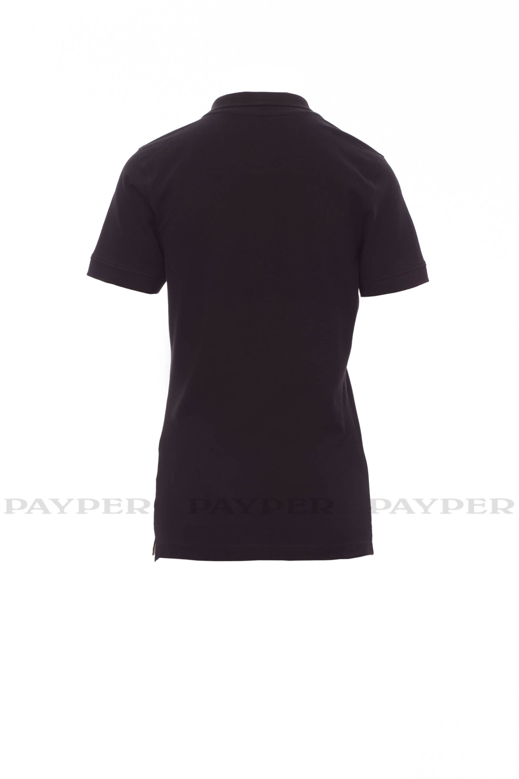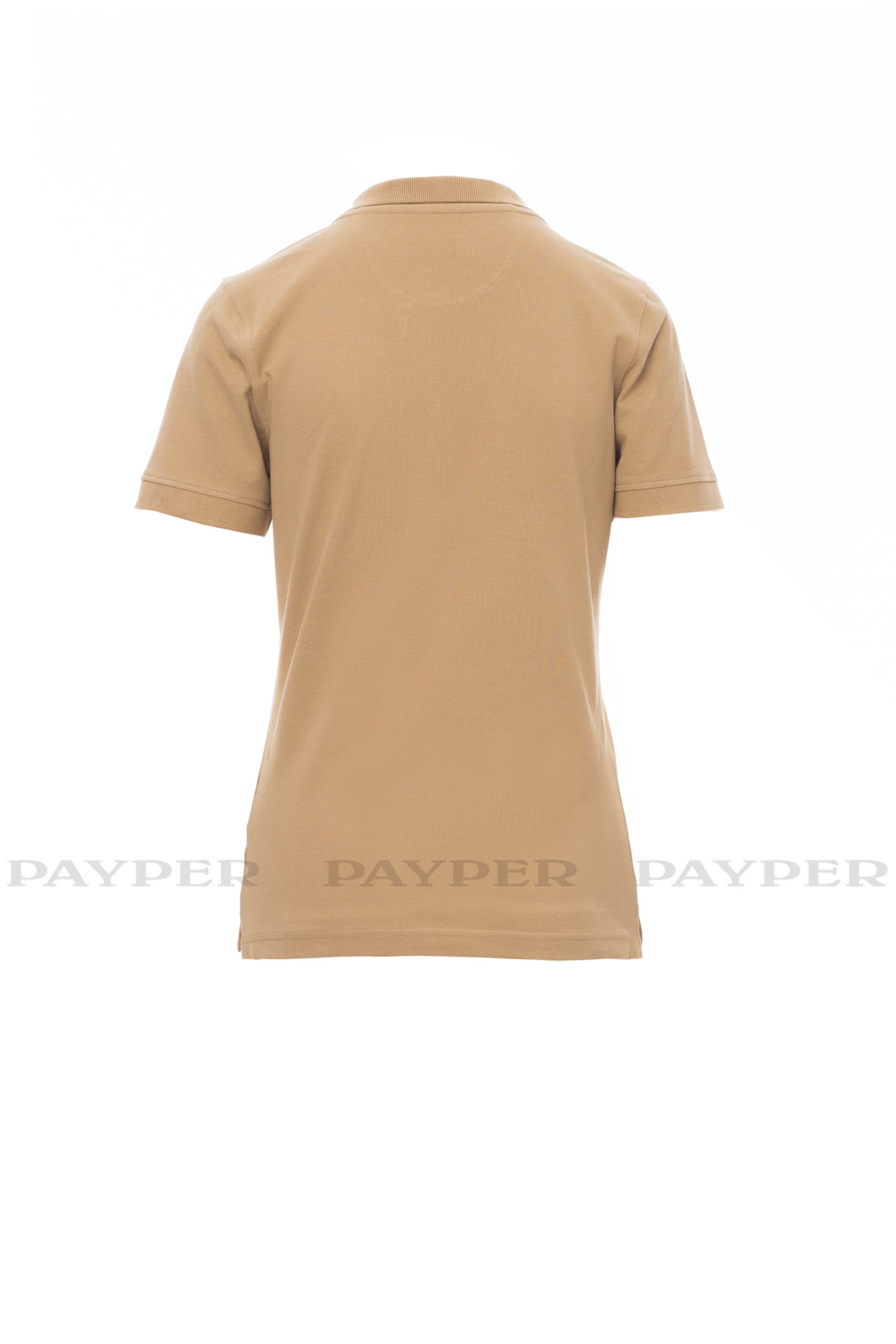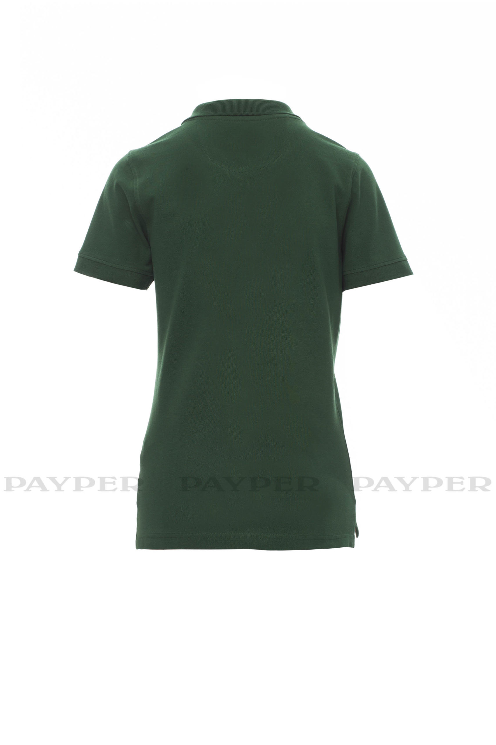Tailliertes Damen-Poloshirt, kurzärmelig, mit 4 Knöpfen Ton-in-Ton mit Perlmutteffekt, Kragen und Ärmelrand aus Feinripp, Seitenschlitzen, Nackenband in Kontrastfarbe, Stretchnähten, seitlichem Verstärkungsband, Nackensattel.